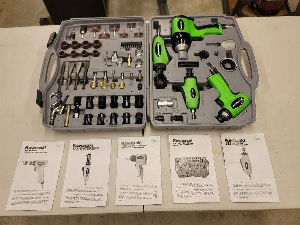 Kawasaki Air Tool Set With Accessories & Case Kawasaki 150mm Air Hammer Kawasaki 3/8" Air Ratchet Kawasaki 1/2" Air Impact Wrench Kawasaki 1/4" Air Grinder Carry Case Complete With All Accessories & manuals! Missing one unknown connector, otherwise complete and in good condition