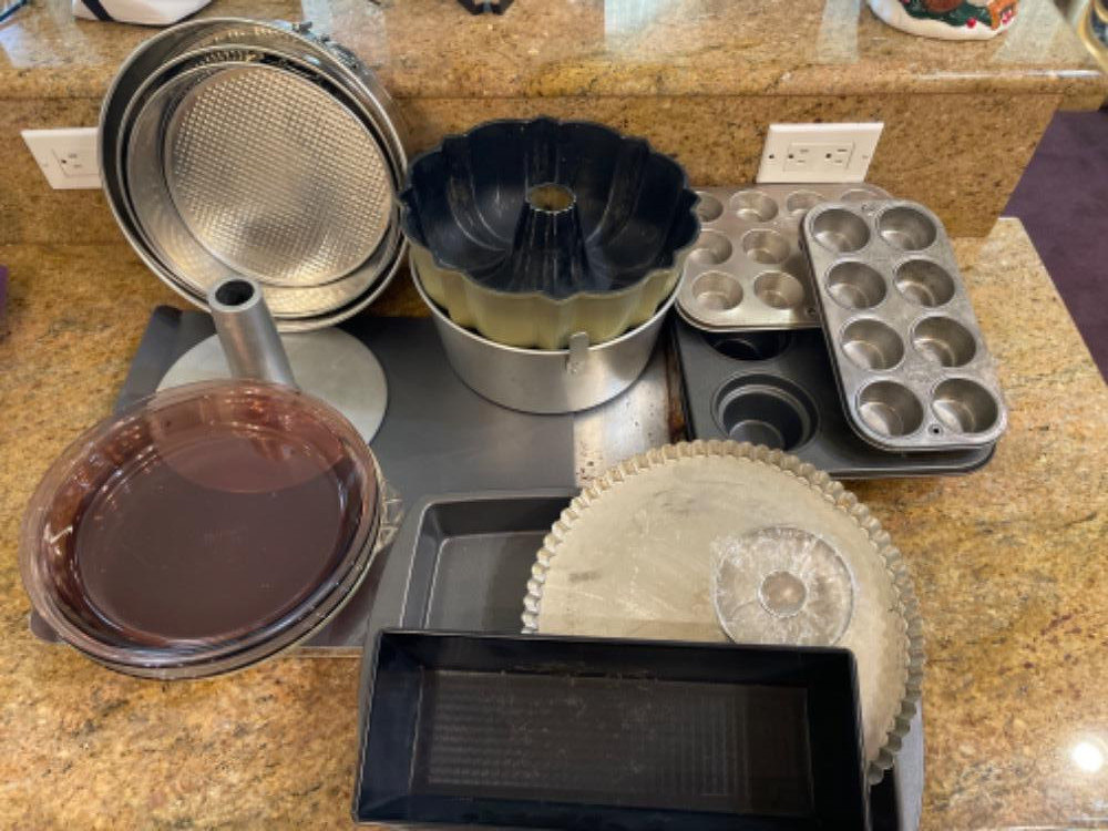 Muffin tins, bundt pans, loaf pan, cookie sheets, removeable bottom cake pans, 4 glass pie plates.