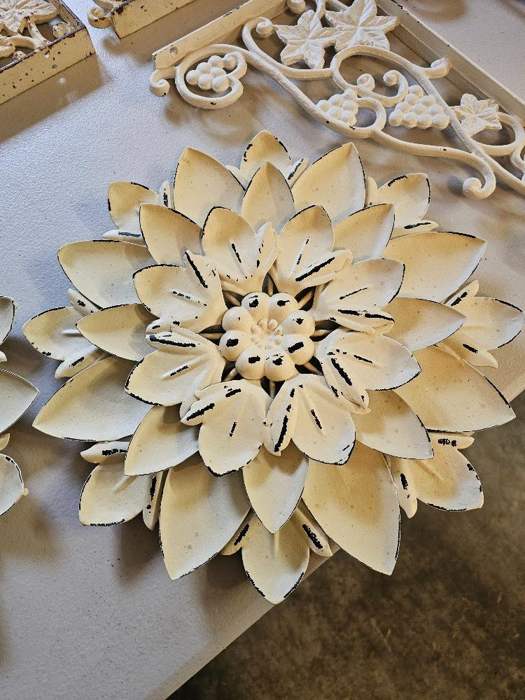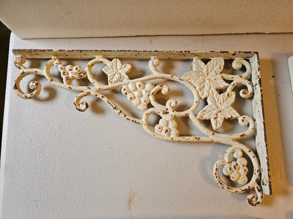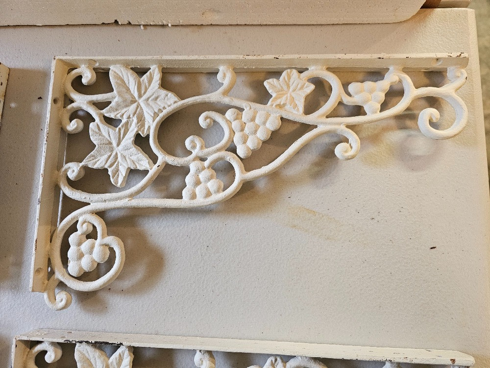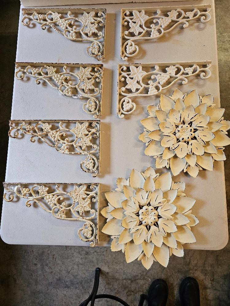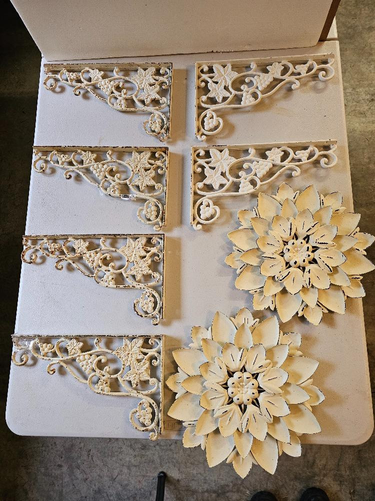 Antique White Metal Brackets & Wall Flowers (3) Pairs of distressed metal shelf brackets with leaf, grape and scroll designs 8"T x 13"L (1) Pair of distressed metal painted flower wall hangings 12.5"T x 12.5"W