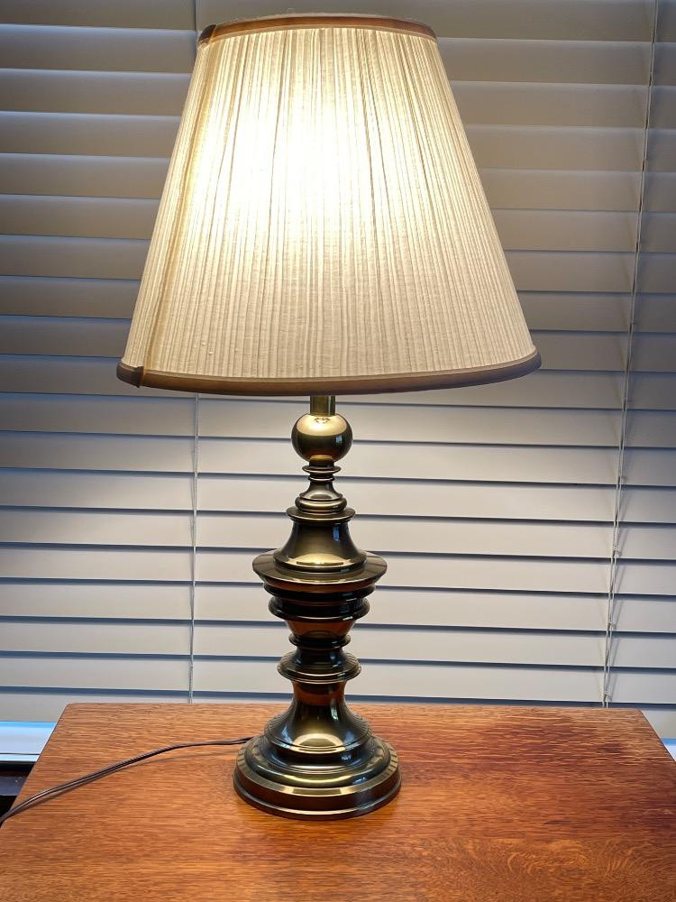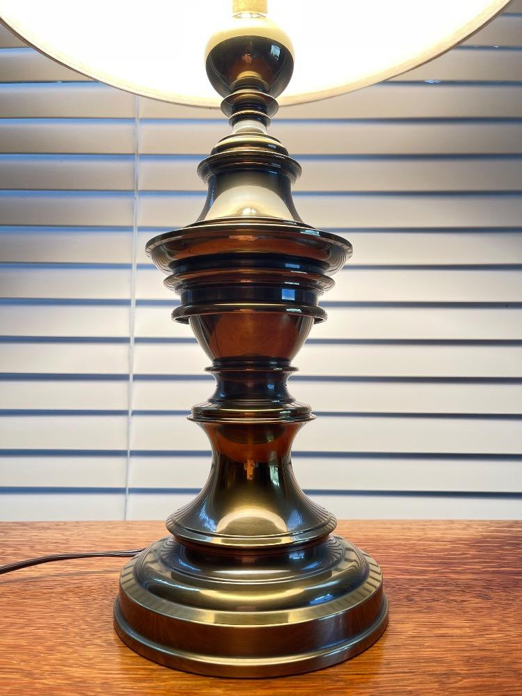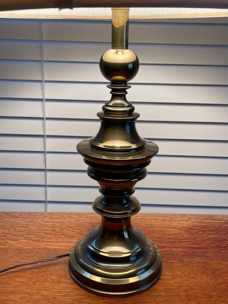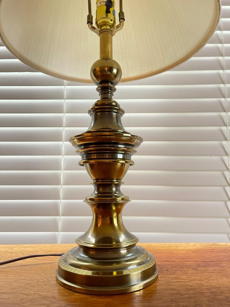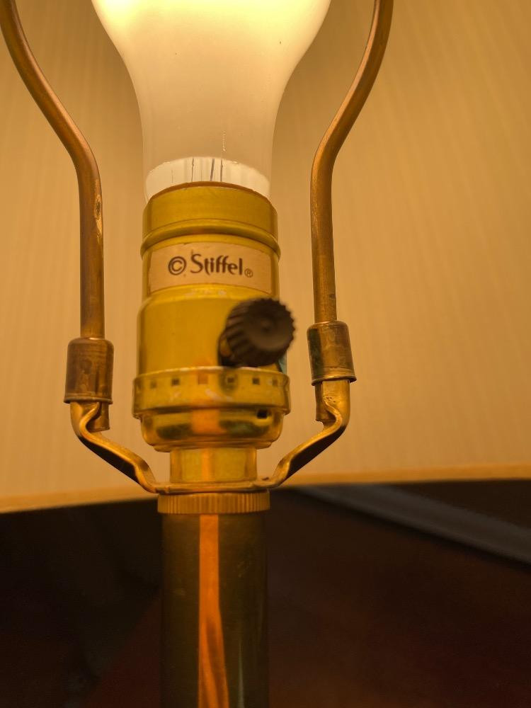 Stiffel 3 Way Brass Lamp. 25” tall with a 14” shade. Base measures 5.5”