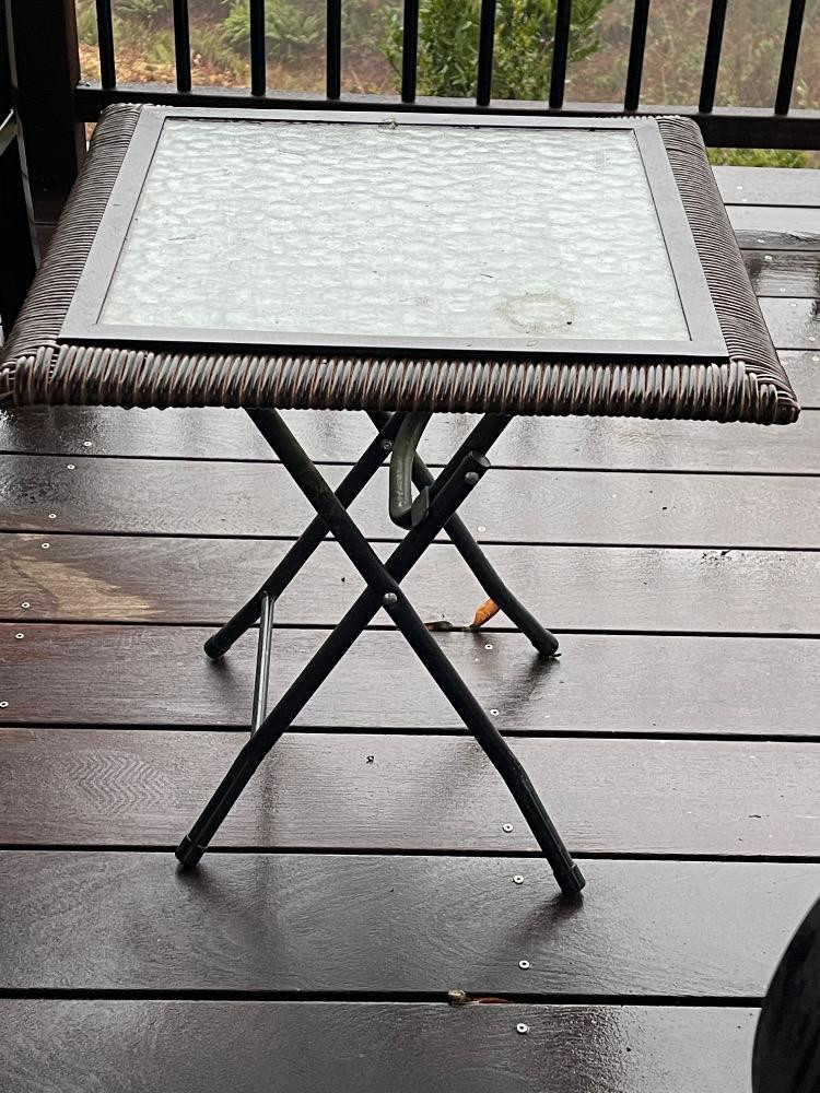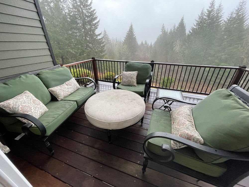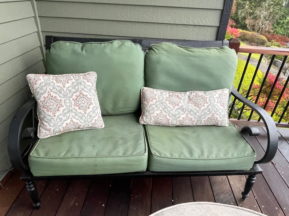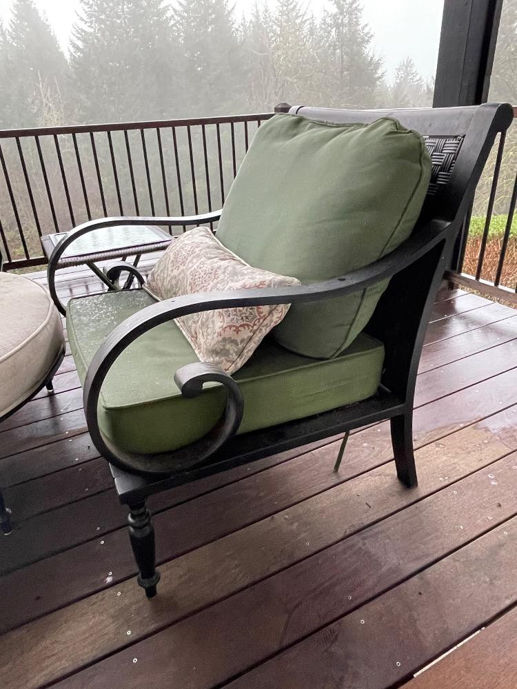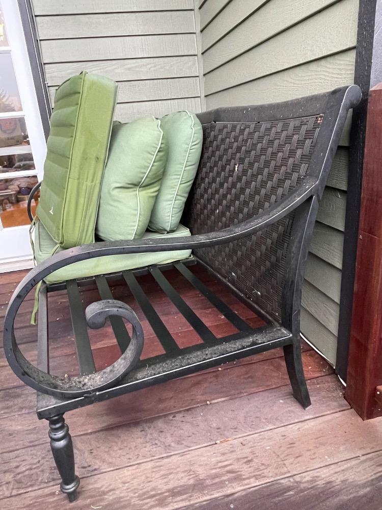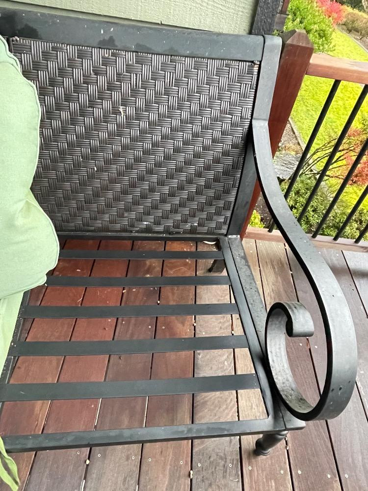 Black Metal with Vinyl Rattan Backs Outdoor Patio Set Cushions need cleaning, frames appear in good condition.