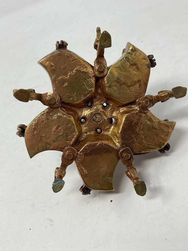 This is a solid brass cum cum peacock holder from India. Each little peacock can be opened and contains various colors of cum cum. The latter is used by Hindu women to make a circle between their eyes to signify a third eye and also that they are Hindu and decoratively to match what they are wearing. The central peacock unscrews and opens the others. then when it is screwed down again, it locks them. It is a rare and beautiful piece of folk art. Approx 4”x2.5”