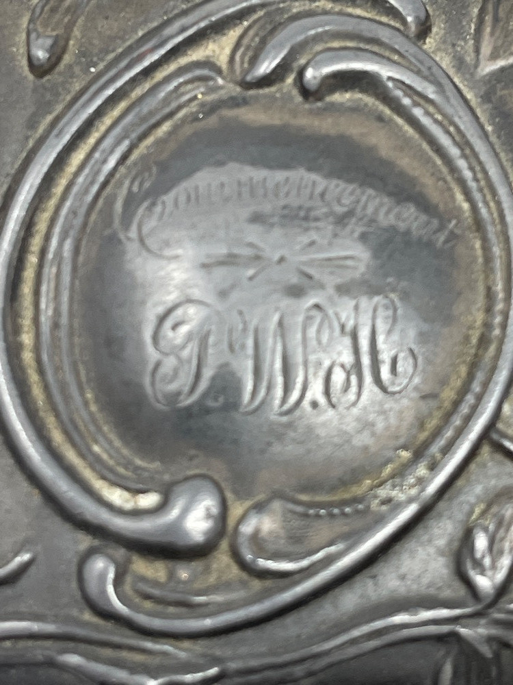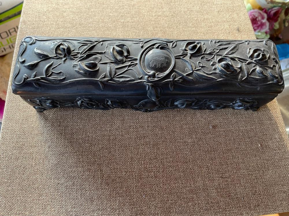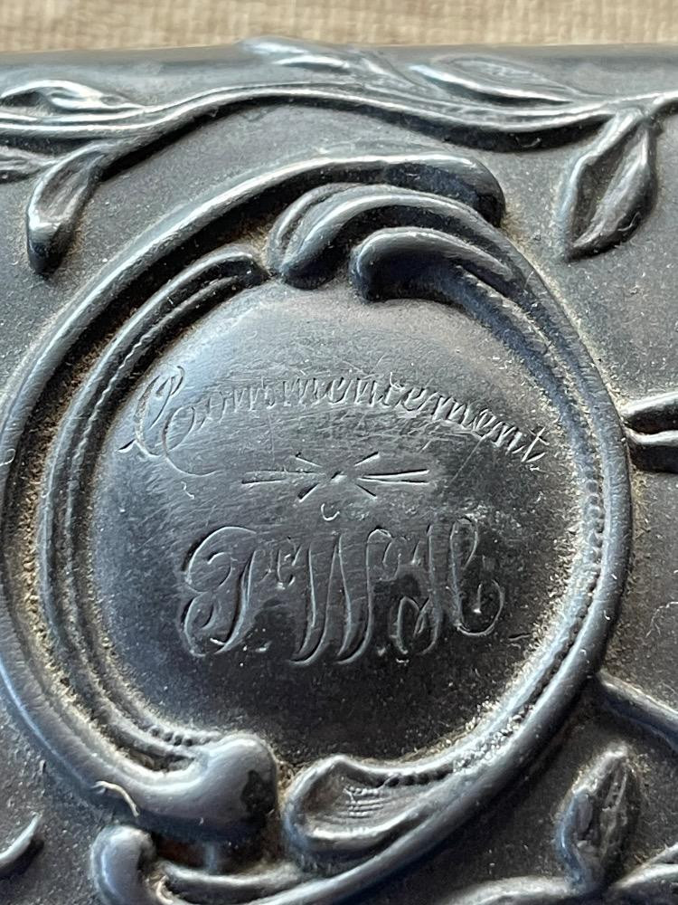 Floral Design Iron Pencil Box. Engraved Commencement and 3 initials.