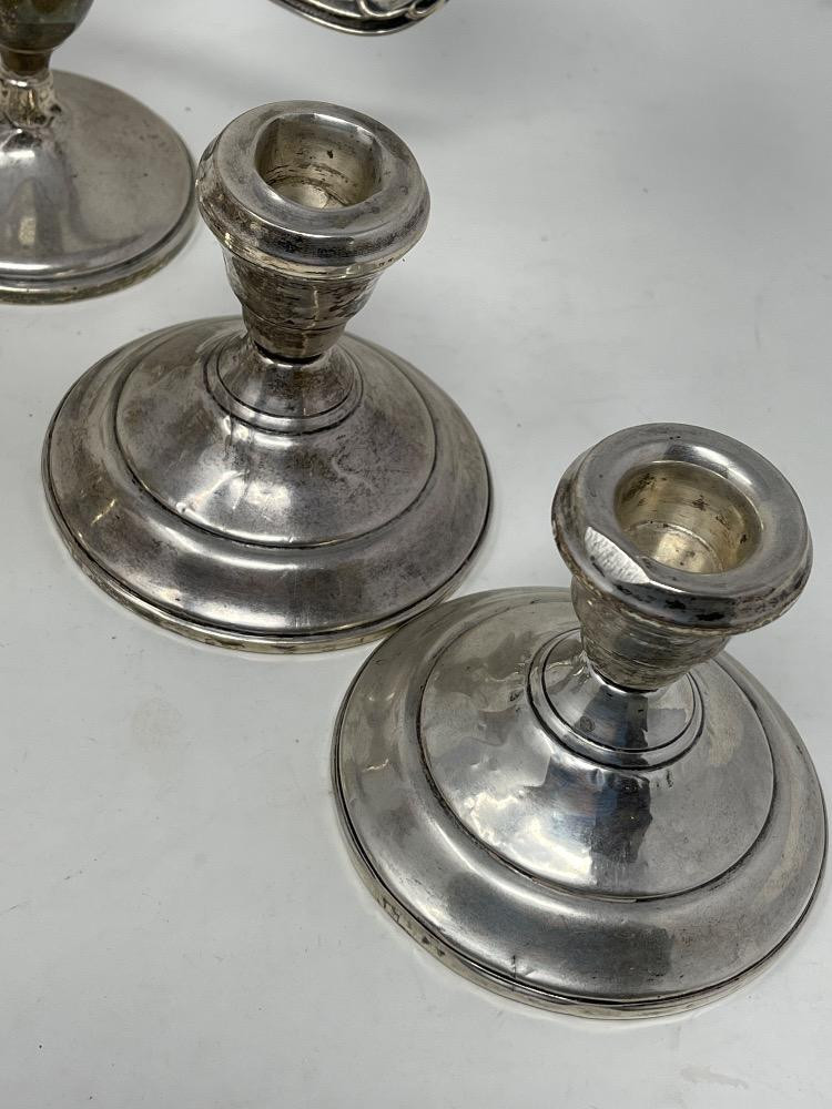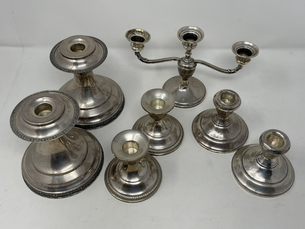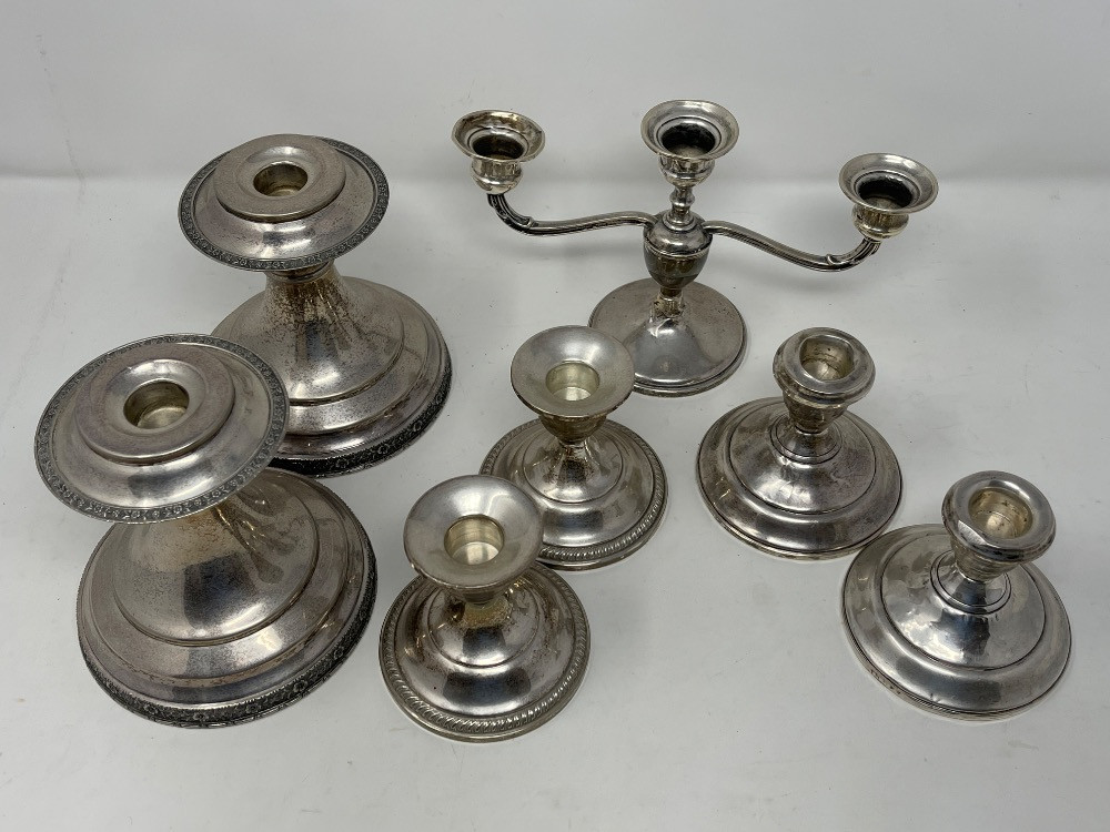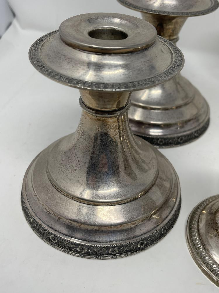 (2) Silver candle stick holders with floral design. E.P.-N.S 7415 5”x5” (2) Sterling reinforced with cement 3.75”x3” (2) Fisher Sterling Weighted 820 3.5”x3.5” (1) Triple Arm Sterling Weighted 1205 Silver candleholder.