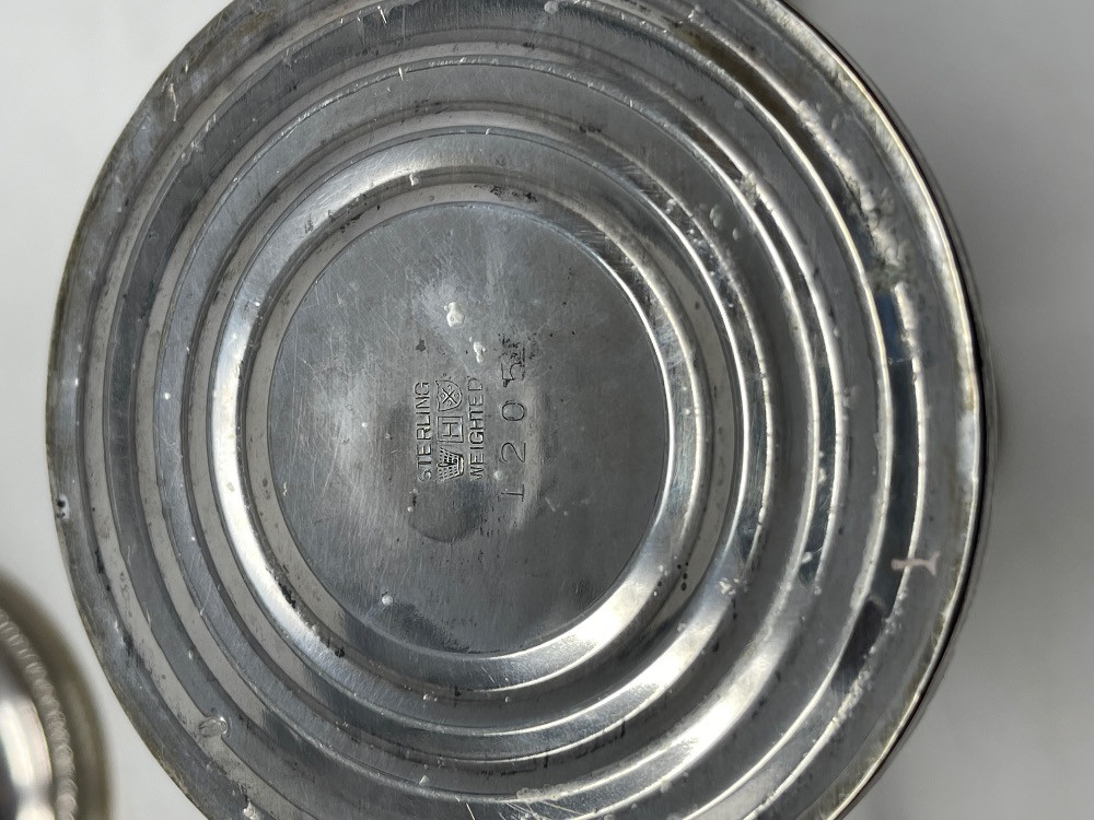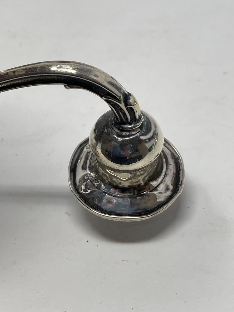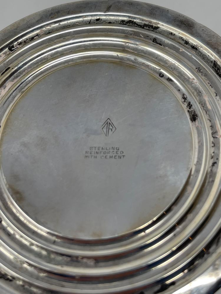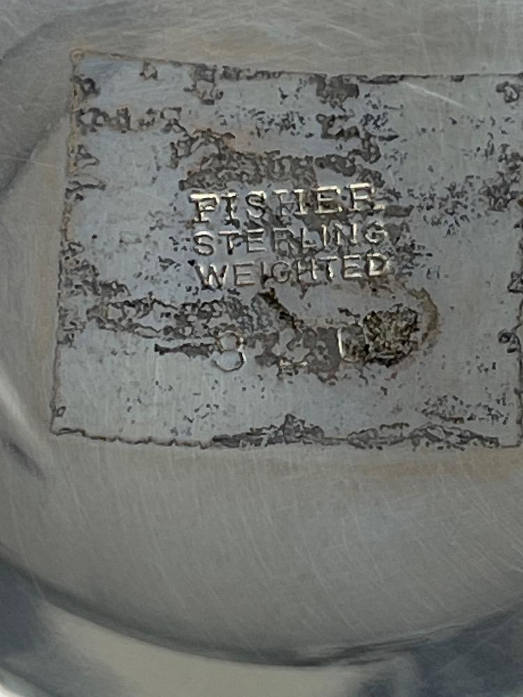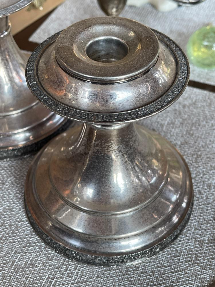 (2) Silver candle stick holders with floral design. E.P.-N.S 7415 5”x5” (2) Sterling reinforced with cement 3.75”x3” (2) Fisher Sterling Weighted 820 3.5”x3.5” (1) Triple Arm Sterling Weighted 1205 Silver candleholder.
