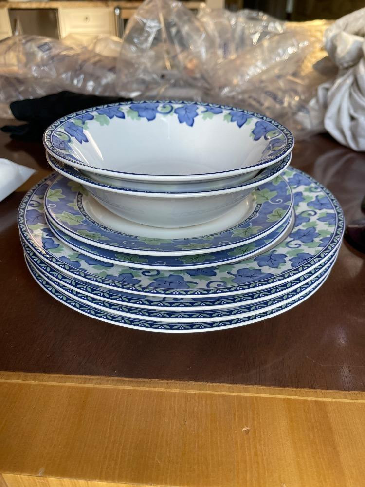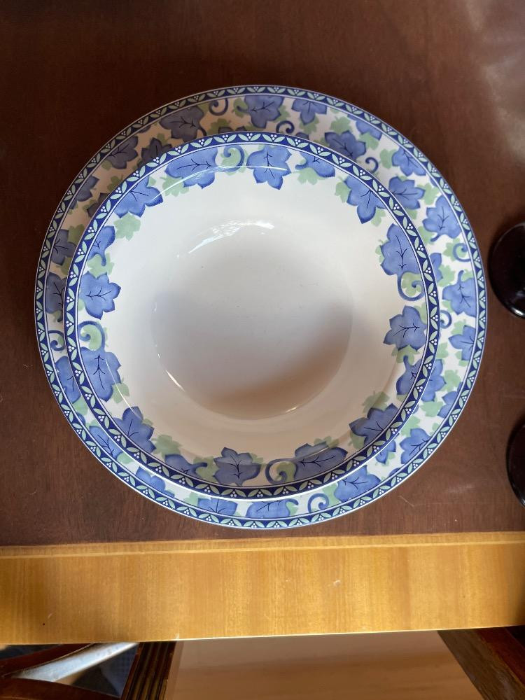 PFALTZGRAFF Blue Isle Spring Vintage 2001 Blue & Green leaf design. 4 dinner plates, 3 salad plates and 3 soup bowls, made in Thailand.