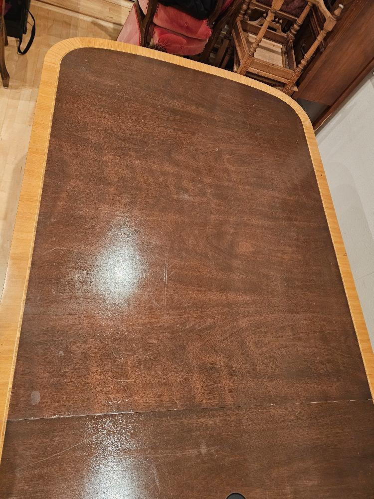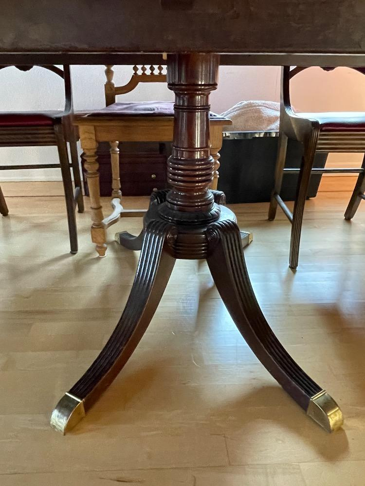 Georgian Style Baker Banquet or Conference Table(s) with turned and fluted legs. Separates in to 4 sections. The 2 end tables have rounded edges and can be put together for 1 smaller table and 2 square tables. The full table measures: x50”x27.5”tall The 2 end tables put together measures 10 feet long Each leaf table is 5’ long Baker Furniture “Collectors Edition by Baker”