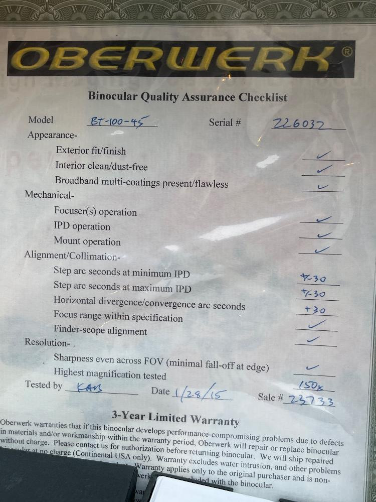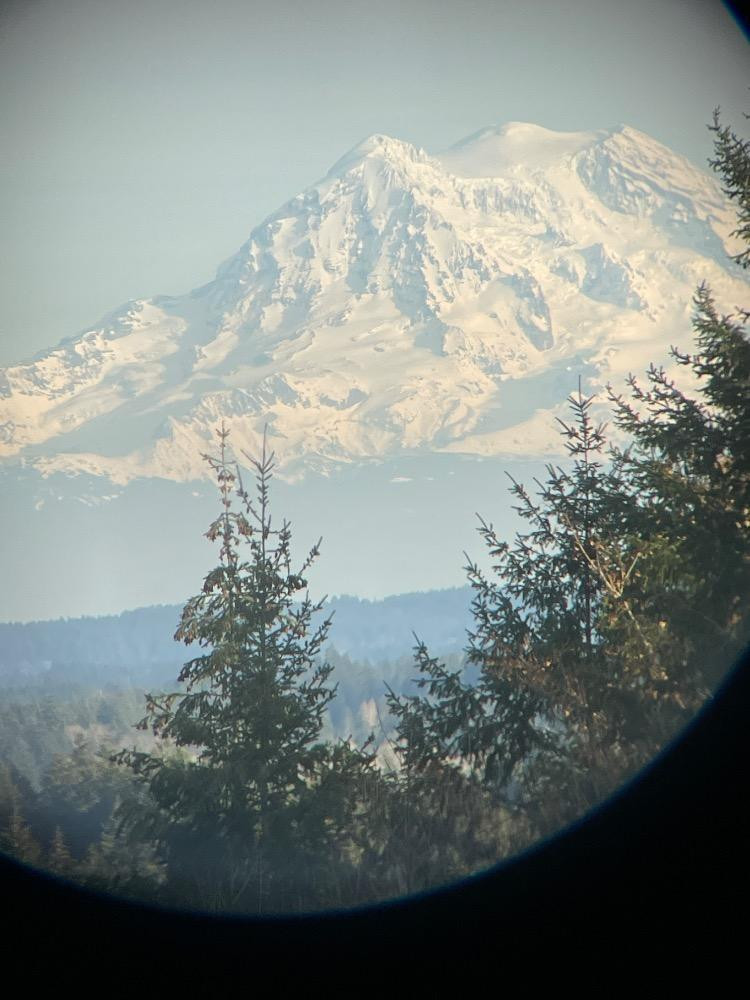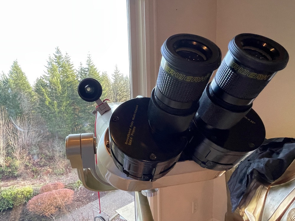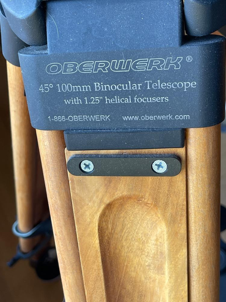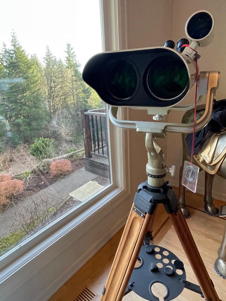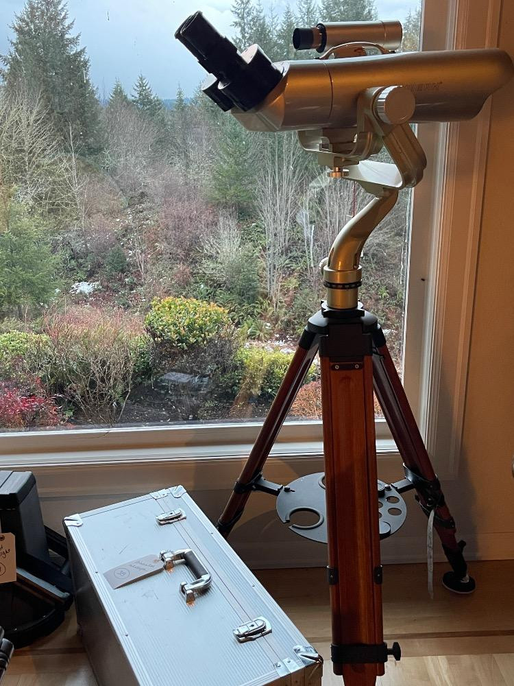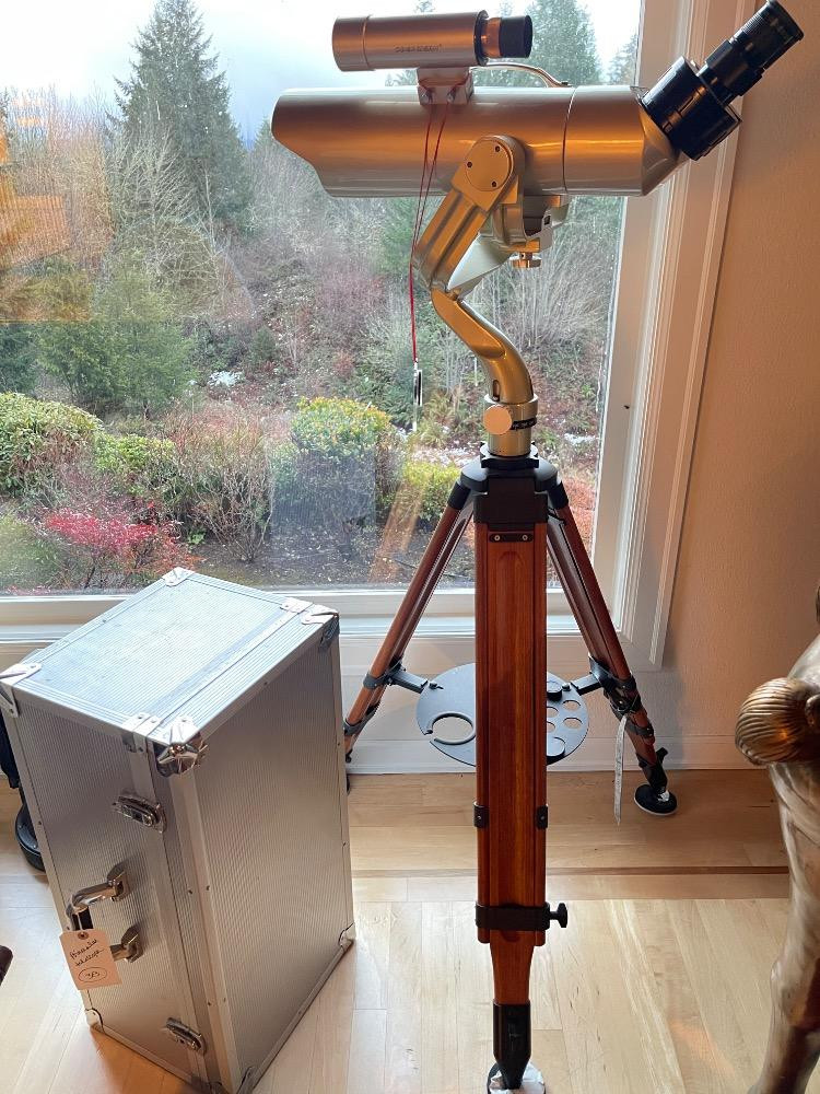 Oberwerk Binocular Telescope BT-100-45 Champagne body with a maple and black tripod. The Mt Rainier photo was taken through the lens without any adjusting. $2500 when new. Additional lenses and carry case. For nearly two decades the now-discontinued 28-lb. Oberwerk BT-100-45 was considered the world’s most powerful binocular. With its 7 pounds of optical glass and 24″ long cast aluminum body, this majestic instrument could provide up to 75x magnification, with excellent clarity.