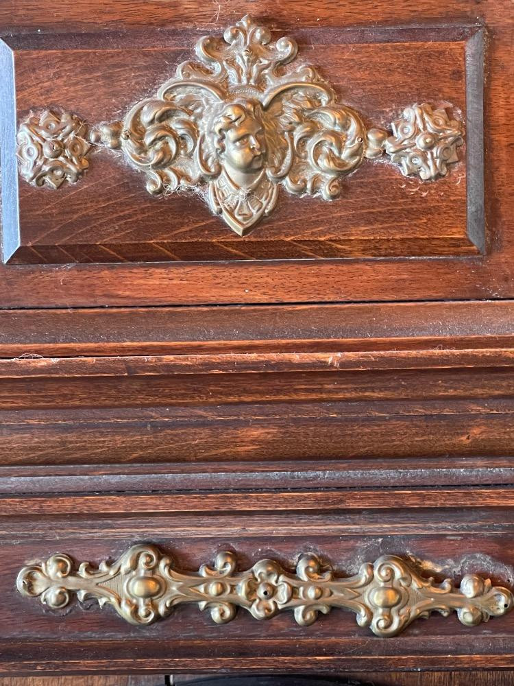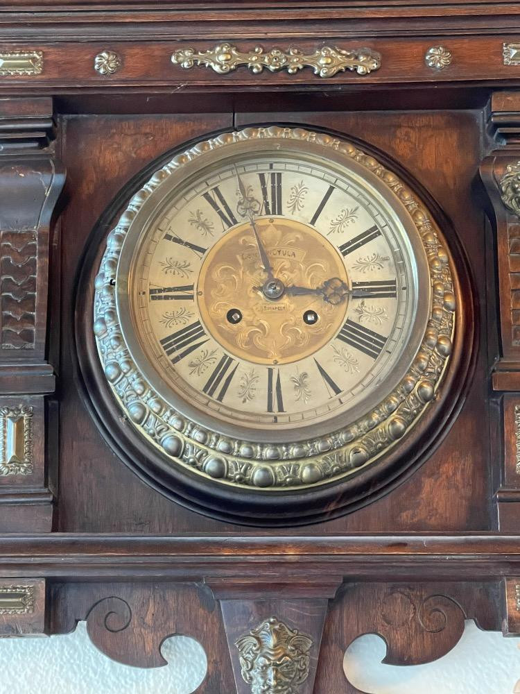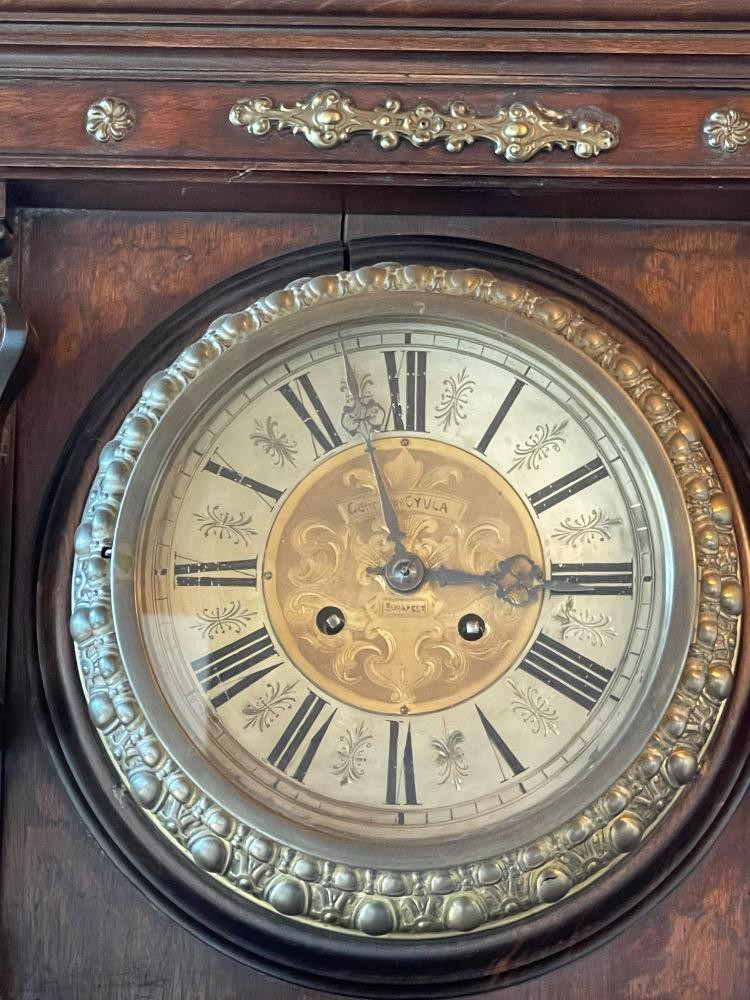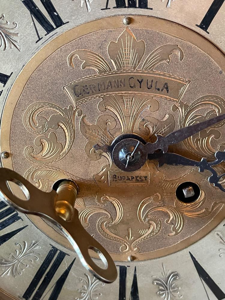 German Gyula Pendulum Clock Under Renovation "German Gyula - Budapest" is written on the clock face. Google says this clock has no connection to Budapest. Bronze adornments and turned wood replacement pieces and one extra if needed. Pendulum swings, did not test. Comes with key.