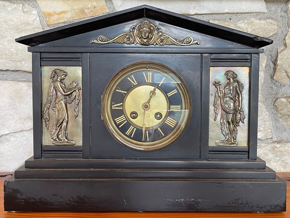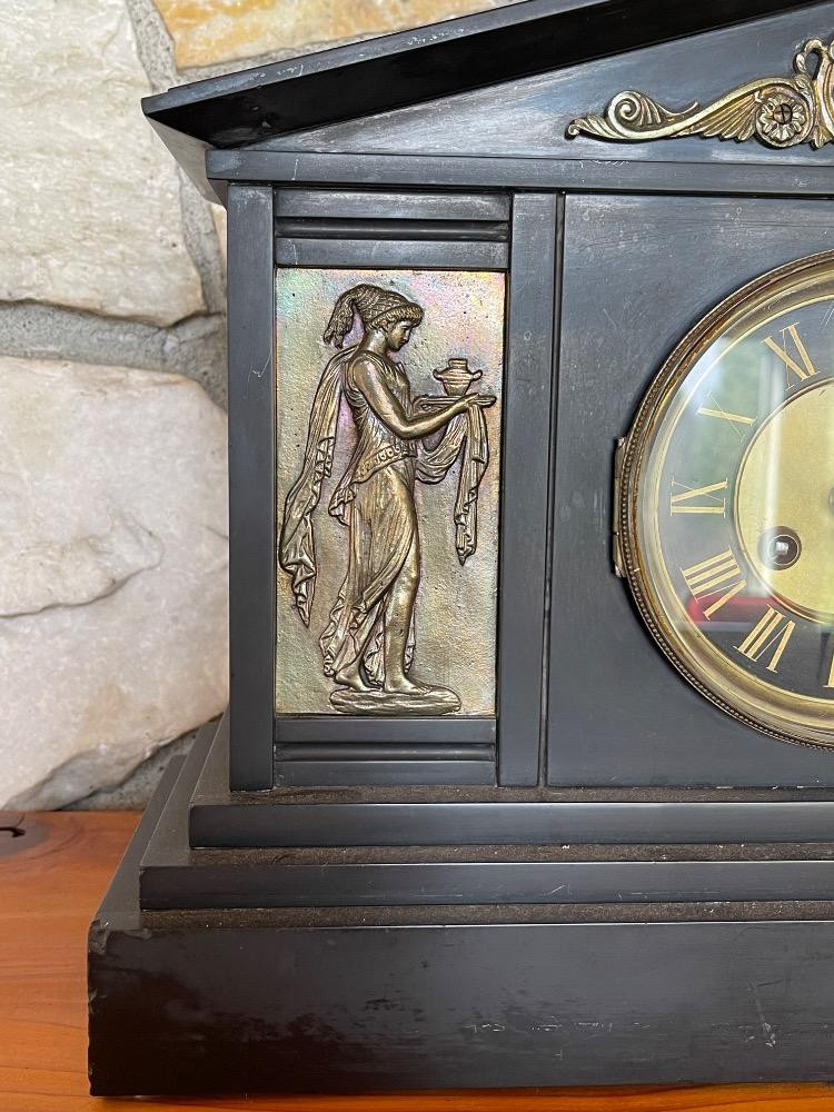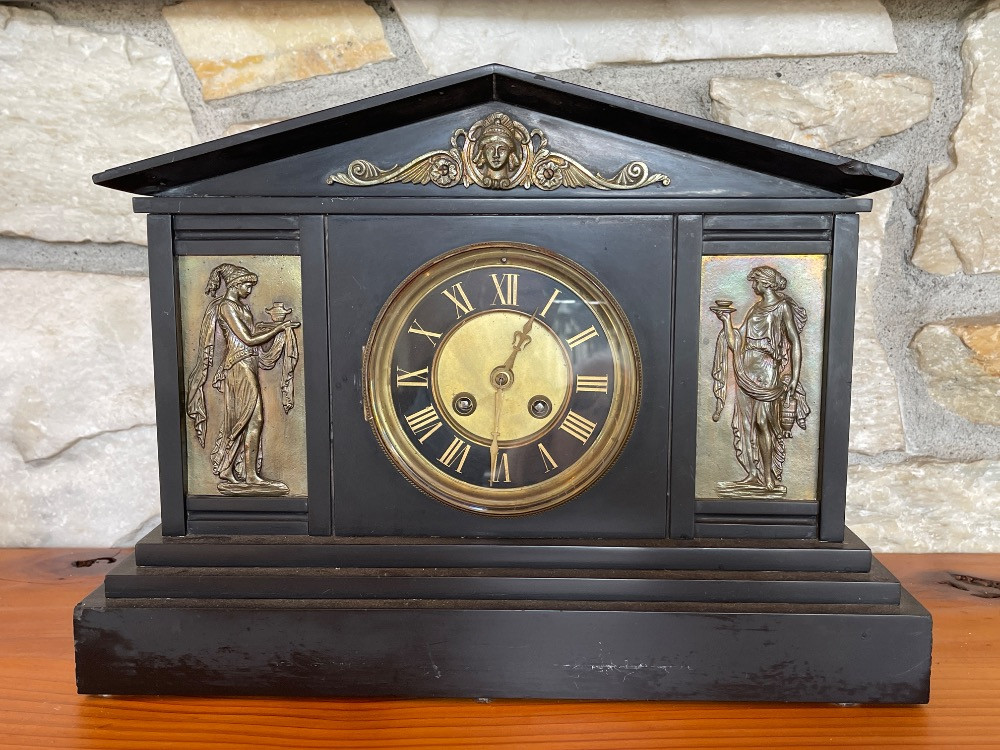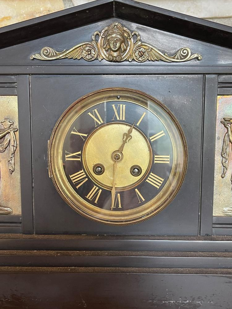 Antique French Black Marble and Bronze Mantle Clock Marble and Bronze Mantle Clock with key. Pendulum swings appropriately and keeps going. Keeps time but did not chime on the 1/4 hour.