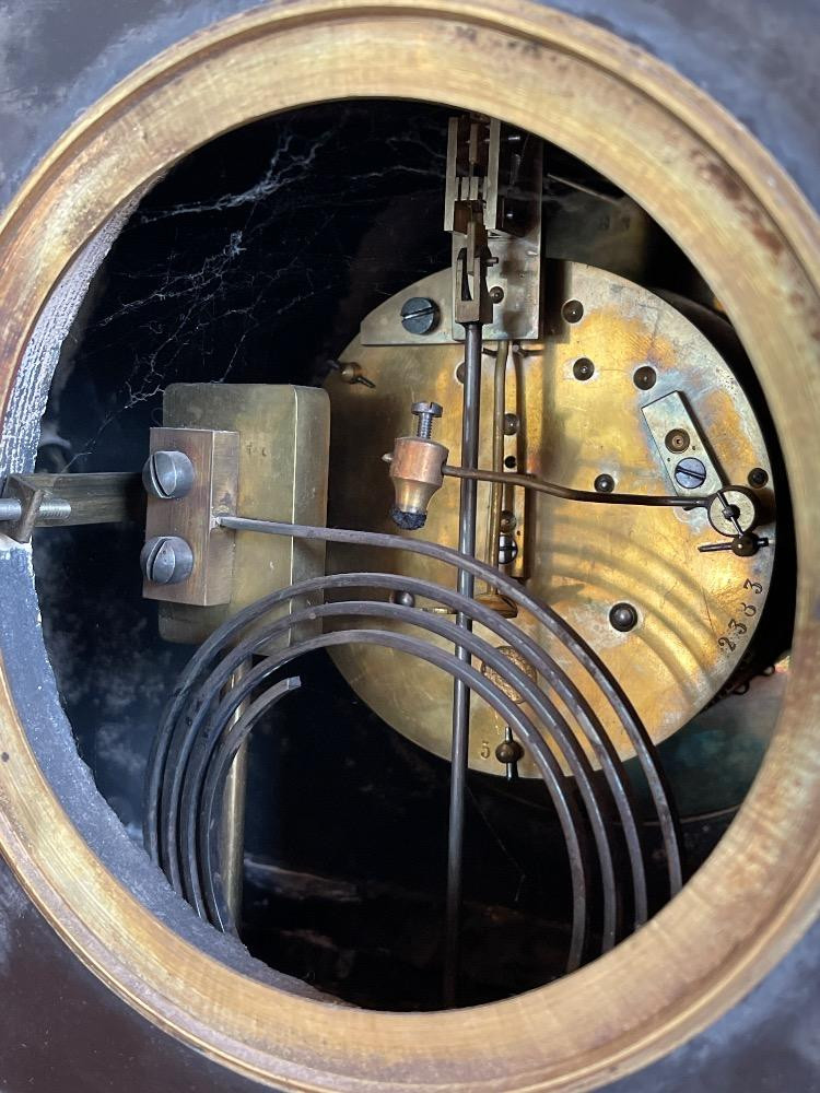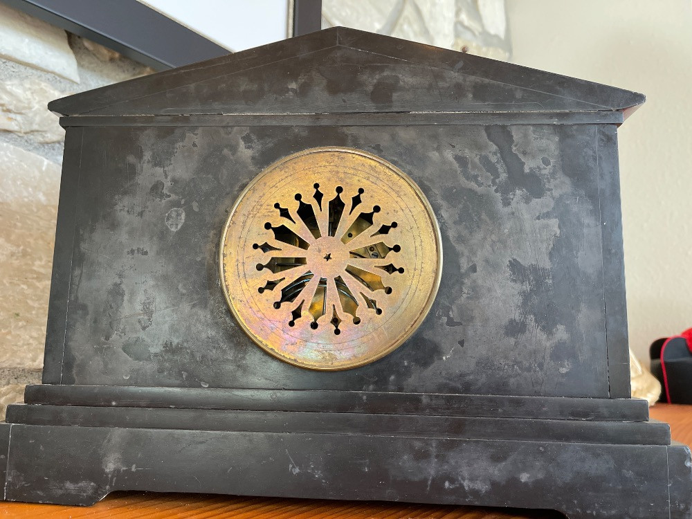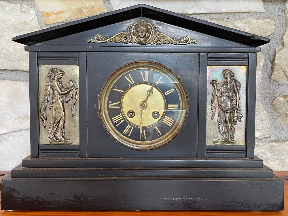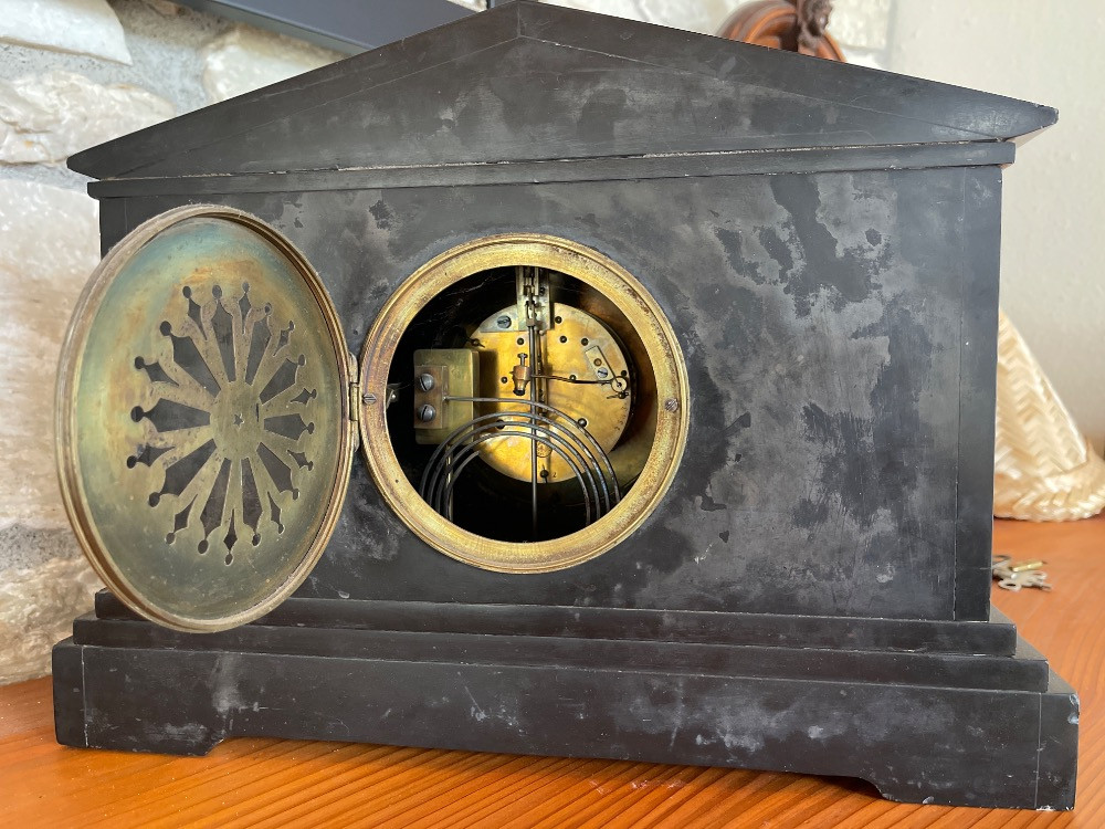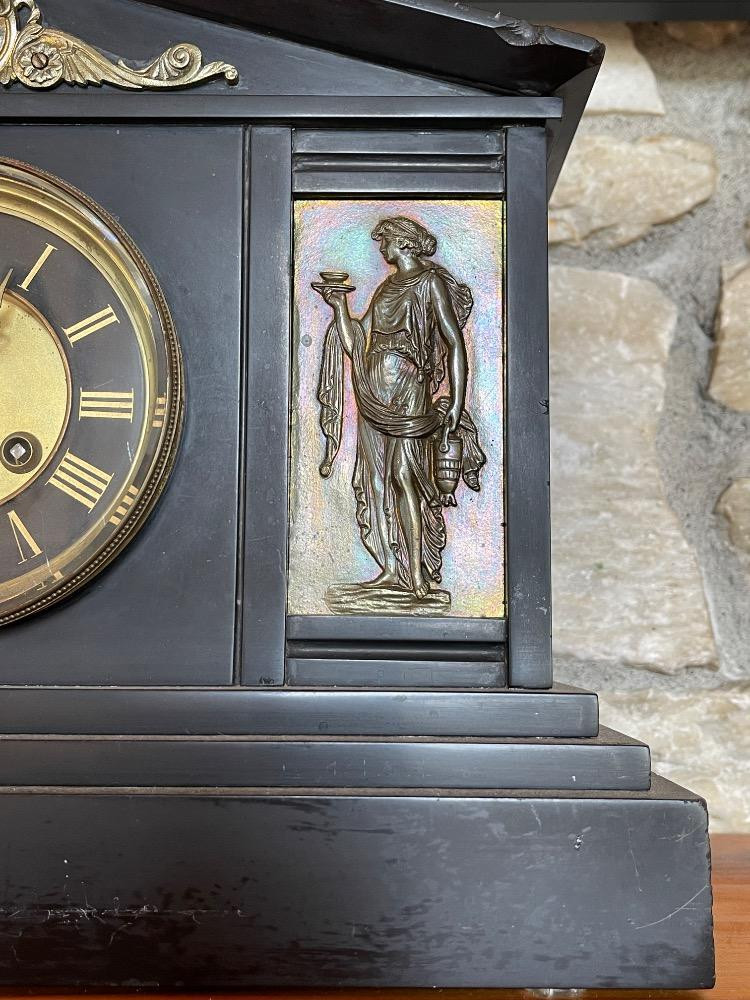 Antique French Black Marble and Bronze Mantle Clock Marble and Bronze Mantle Clock with key. Pendulum swings appropriately and keeps going. Keeps time but did not chime on the 1/4 hour.