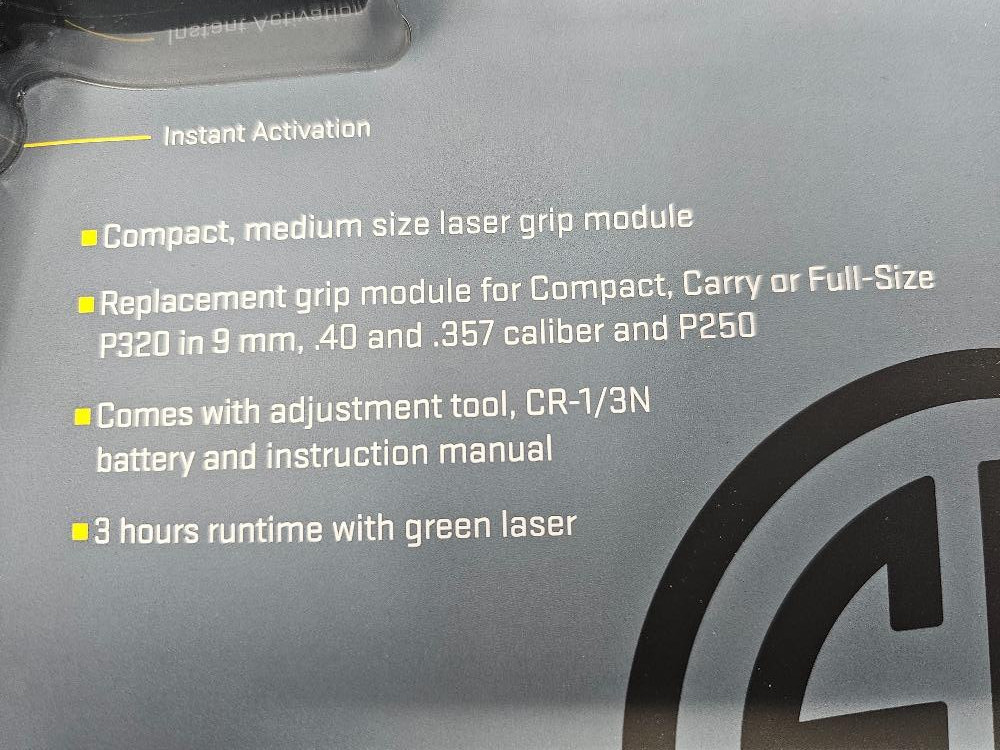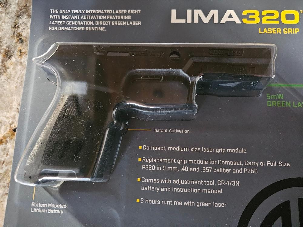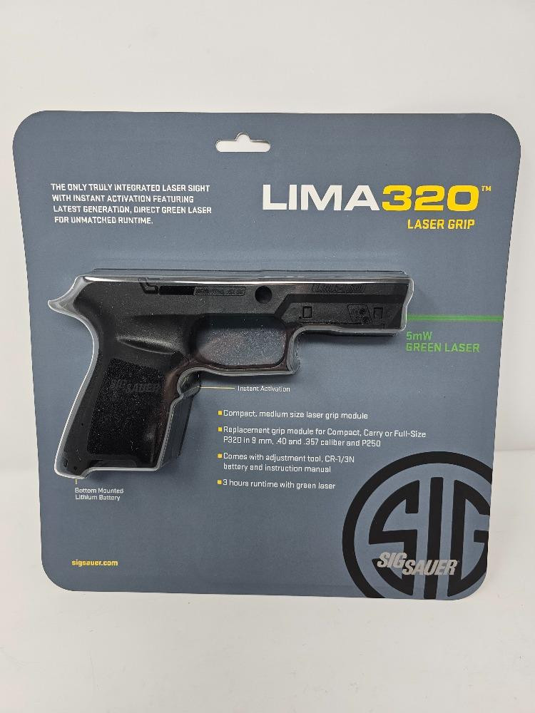 Sig Sauer LIMA320 Laser Grip (New In Box, never used!) Compact, medium size laser grip module Replacement grip module for Compact, Carry or Full Size P320 in 9mm, .40 & .357 caliber and P250 Includes adjustment tool, CR-1/3N battery and manual 5mW green laser Sig Sauer Part #SOL51002 NOTE: Not selling a firearm, just the laser grip
