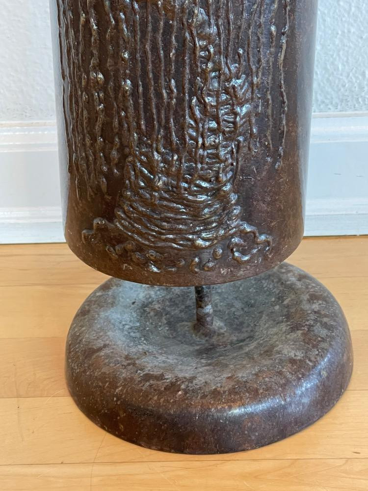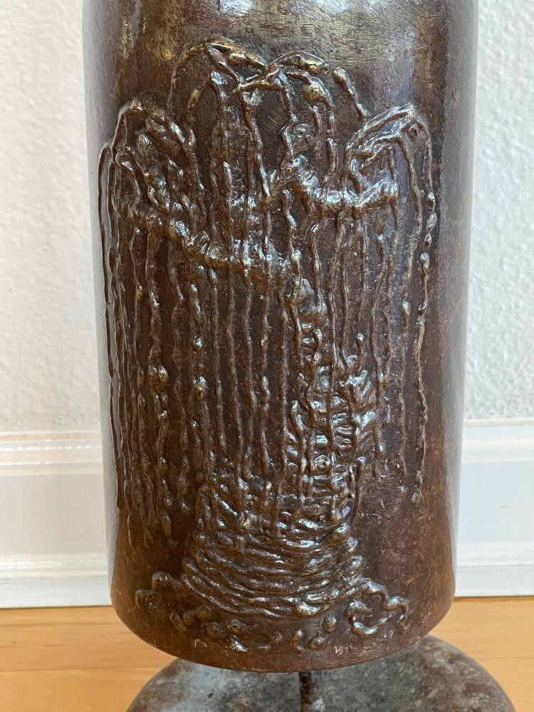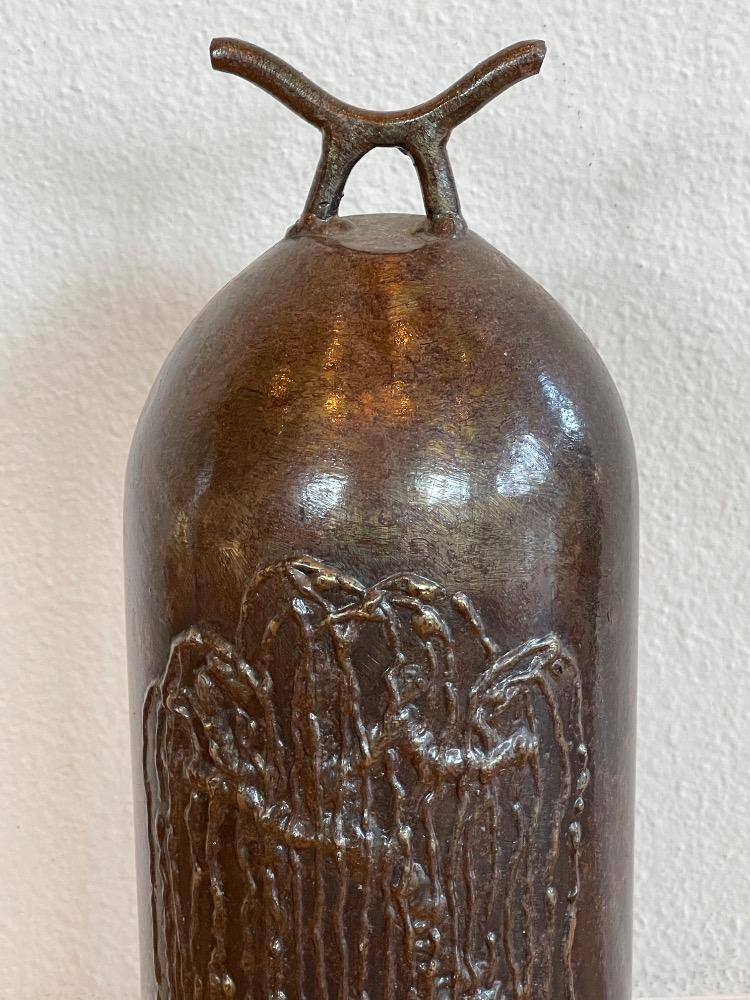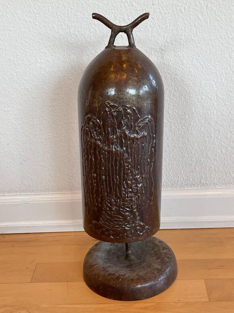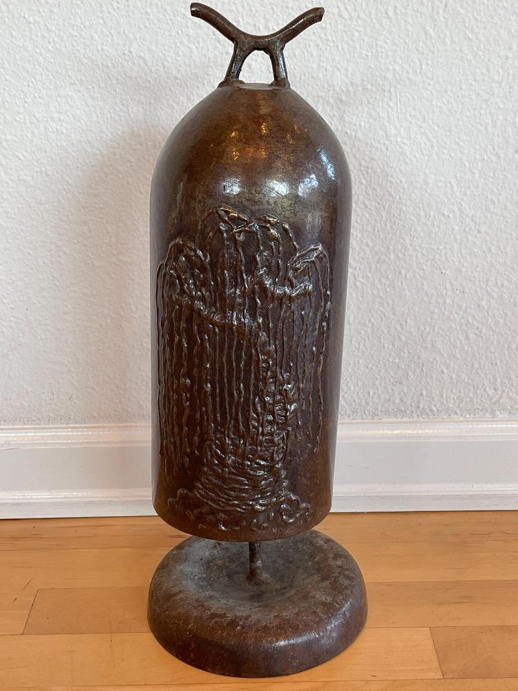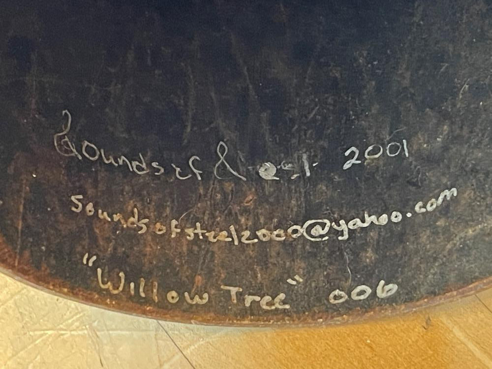 Sounds of Steel “Willow Tree” Design- Steel Bell on Stand 13.5” steel bell with weeping willow design bell only 17.5” on stand 5.5” diameter. Made by Sounds of Steel with Willow Tree design. Numbered 006
