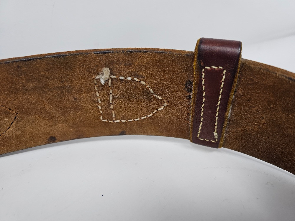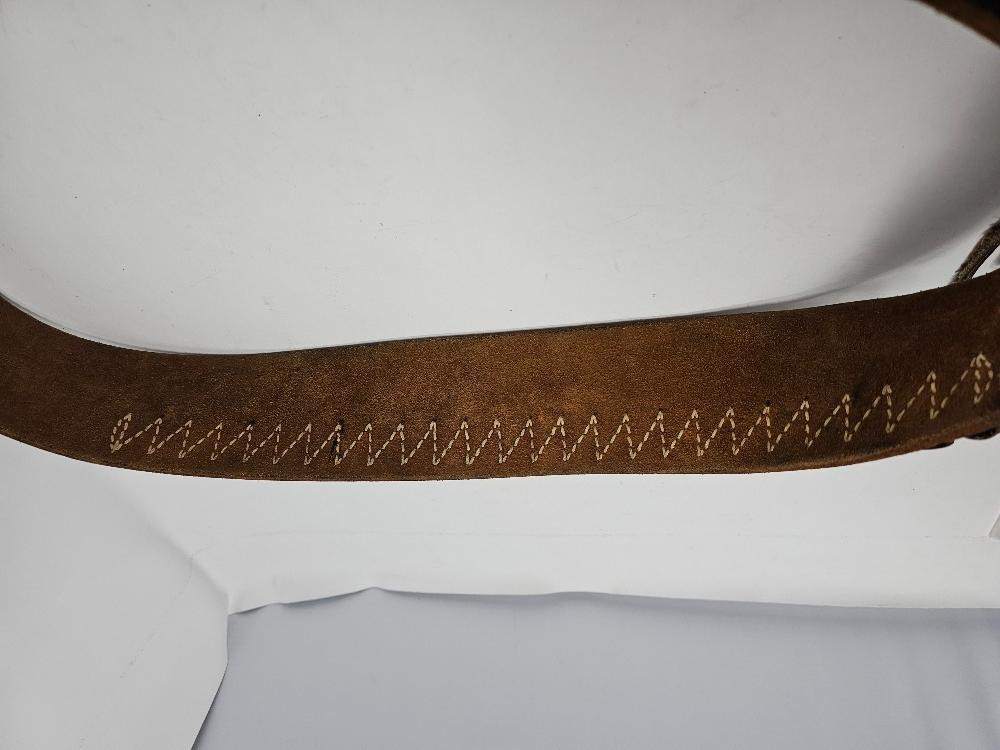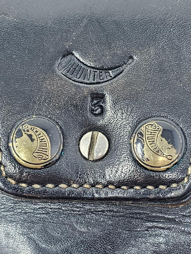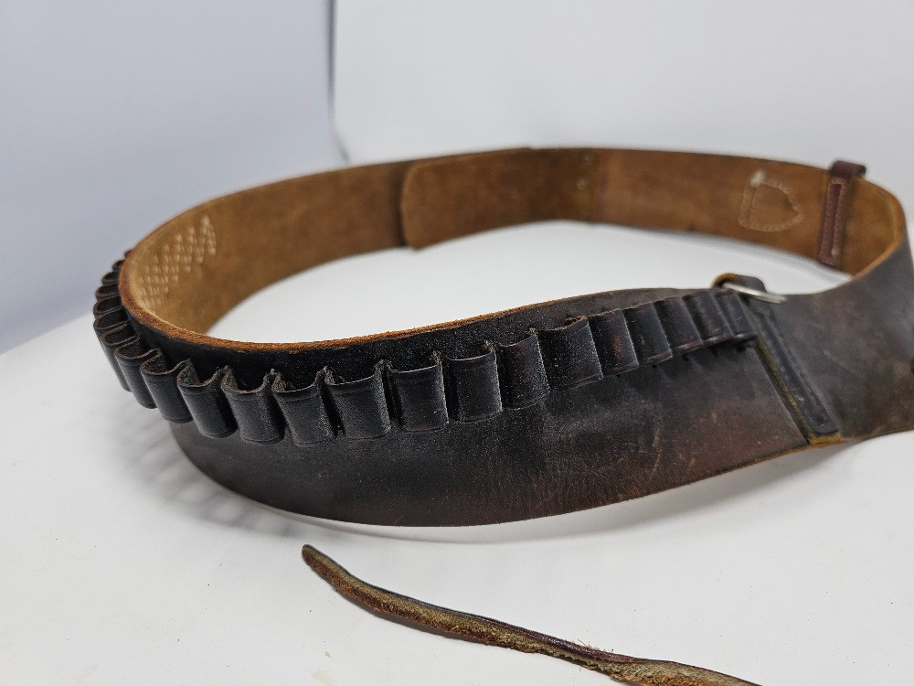 Western Style Leather Gun Belt & Holster Appears to be hand-made! Leather belt is 53" total length Hunter "3" leather holster is 9"L x 3"W (at opening) Belt can hold 25 rounds
