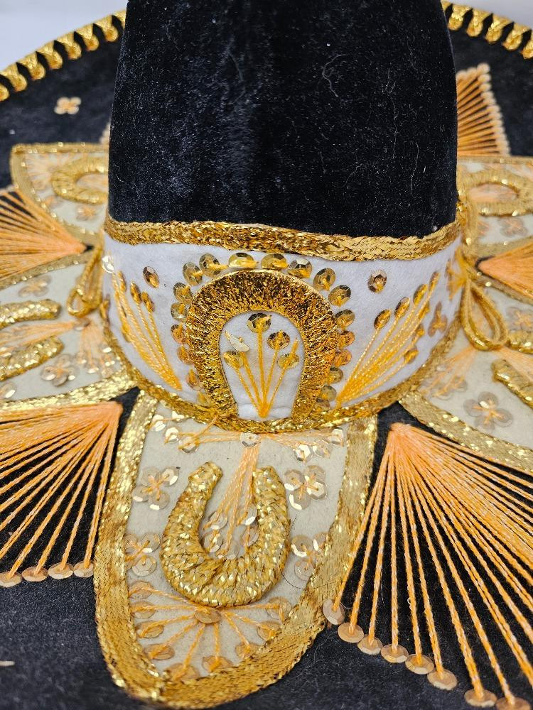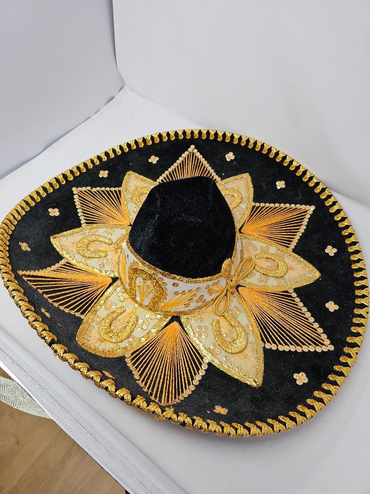 Vintage Pigalle Black & Gold Sombrero Beautiful black felt adorned with gold sequins, ribbons and woven horseshoes Made in Mexico Sure to liven up your next Cinco De Mayo party! 7"T x 22"W