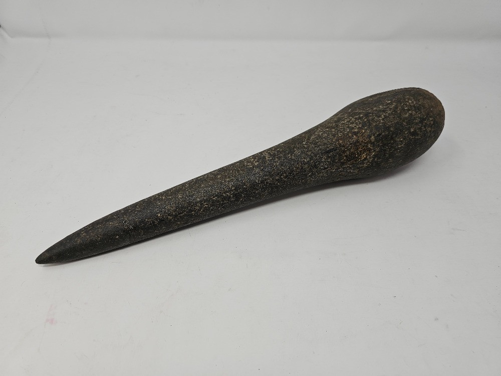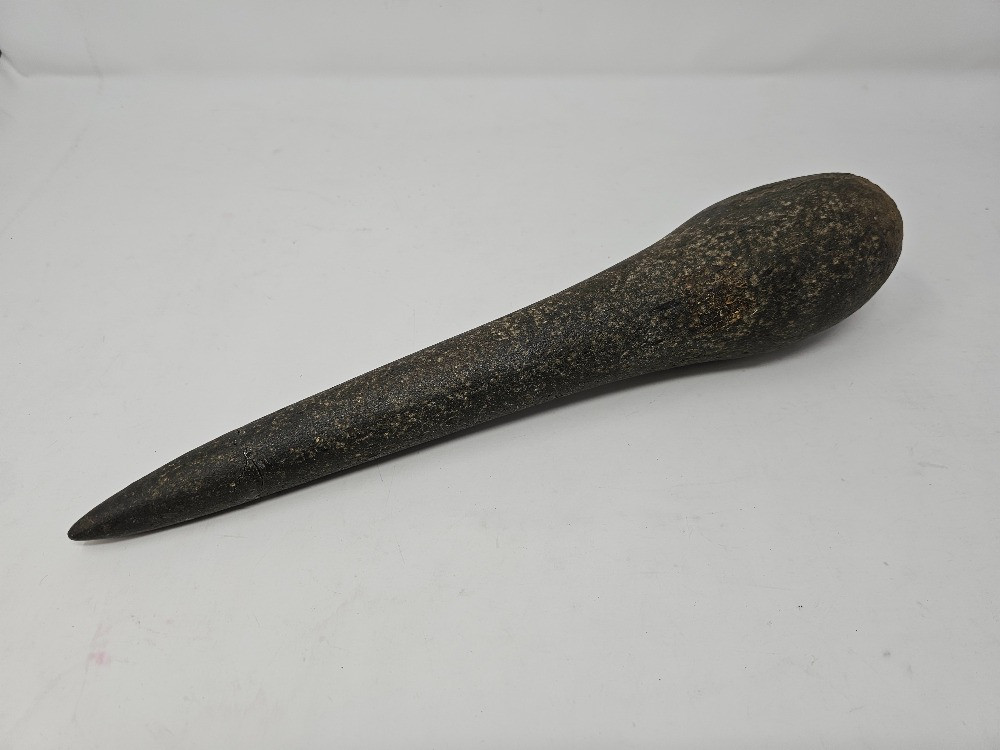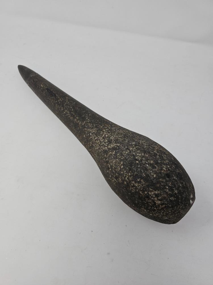 Possibly A Hawaiian Or Native American Stone Club Other possible ideas were a pole celt, a primitive adz, or type of stone tool Unknown origin Tip has been broken off and reattached at some point Pretty hefty! 14.5"L x 3"W