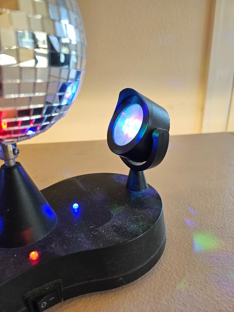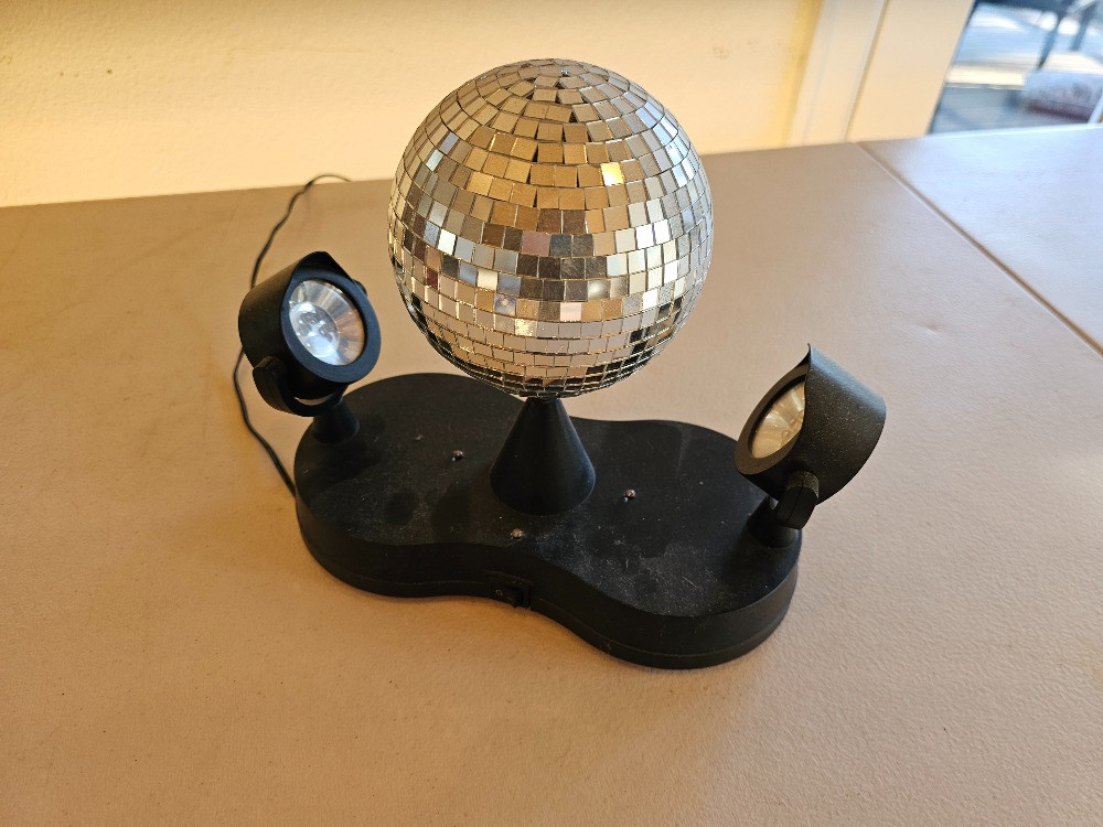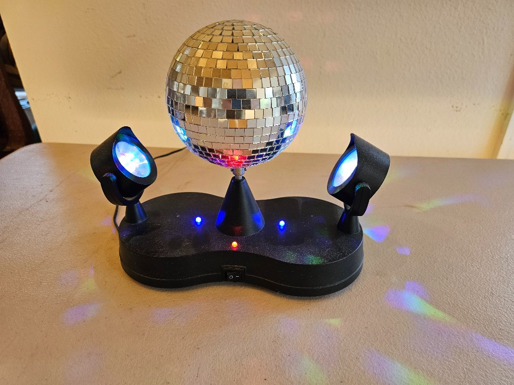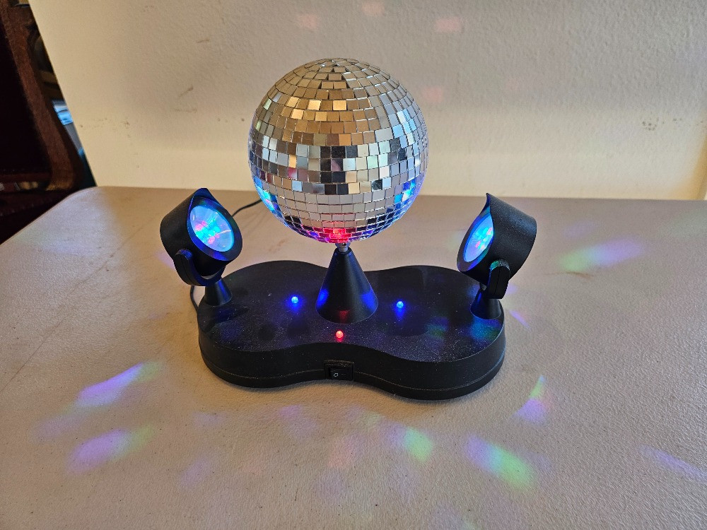 Disco Ball Motorized Mirror Party Light 2 red, green, & blue LED spotlights shine off of the disco ball as it rotates Can hang from the ceiling or sit on a flat surface Includes power cord Tested - Works! Disco Ball is 4.5" Base is 10" x 5"