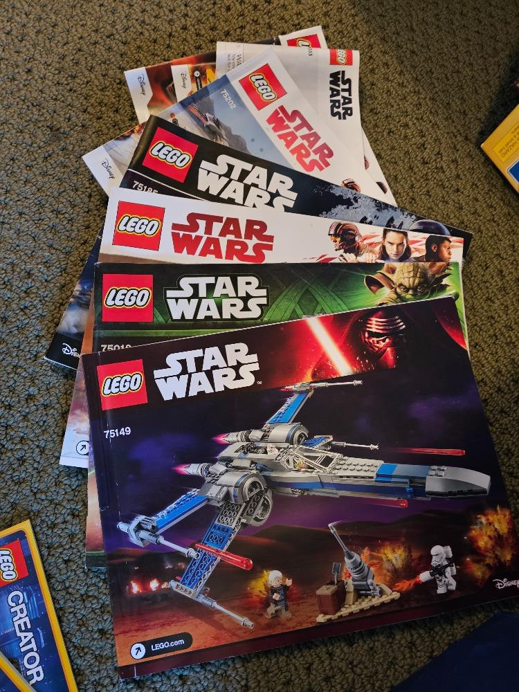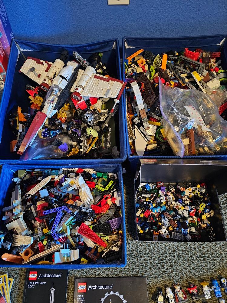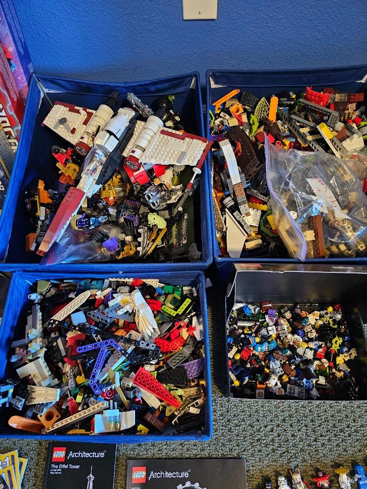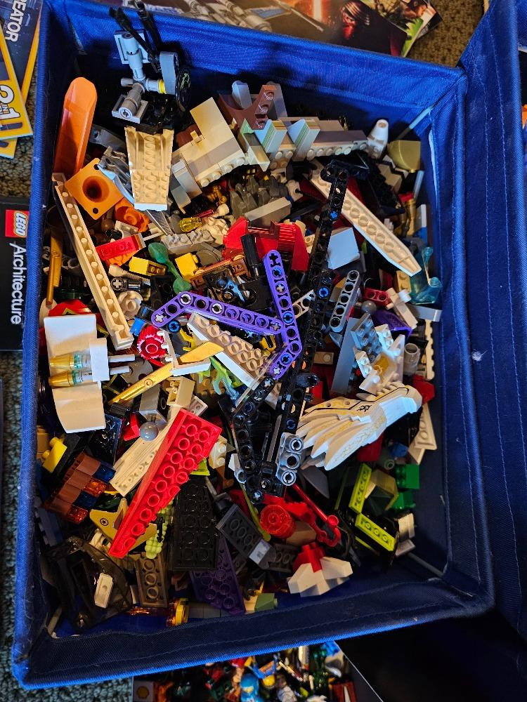 Assorted LEGO Sets, Mini Figures & Build Manuals Star Wars, Batman, Creator, Architecture, Ninjago, & The LEGO Movie and more sets in 3 bins. It appears that most of the sets have been dismantled, but some larger pieces remain built. Box of 60+ assorted mini-figures (Star Wars, Mickey Mouse, Batman and more) Build manuals for numerous sets Boxes with some unopened bags of LEGOS (but not complete set) Large blue bins are 9.5"T x 17"L x 13.5"D Medium blue bin is 7"T x 13"L x 10"D 25 lbs total!