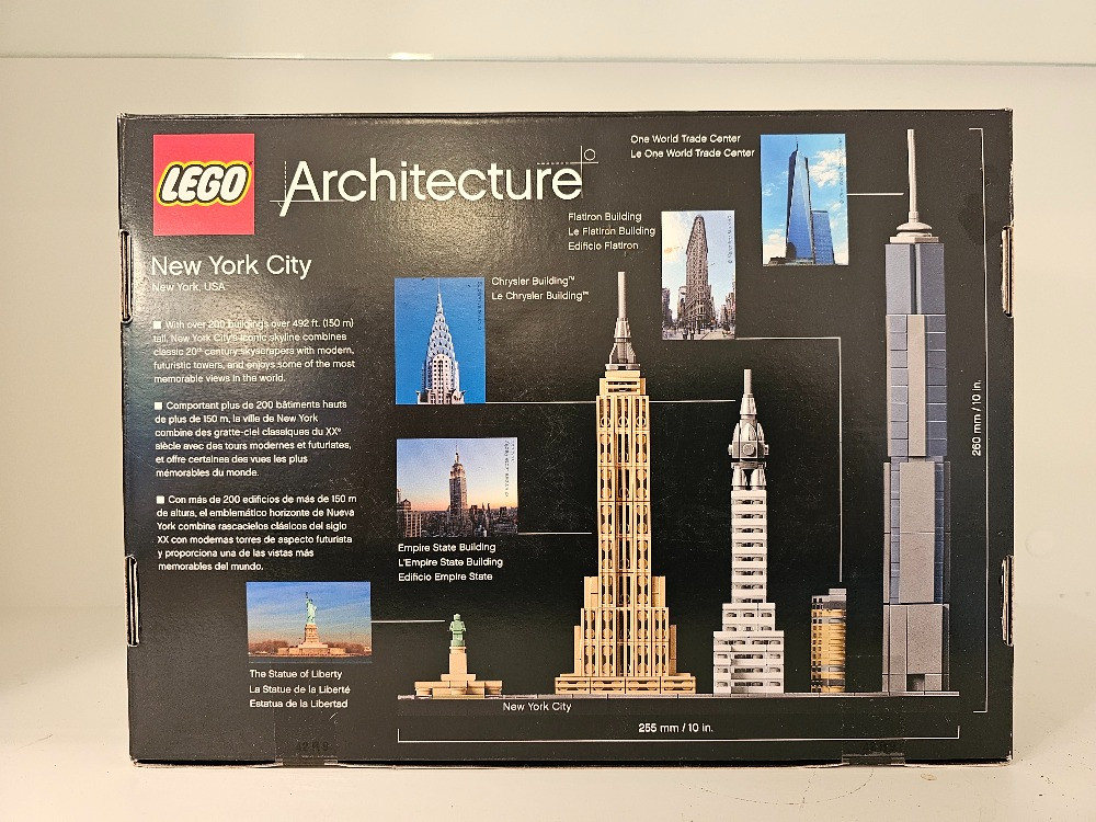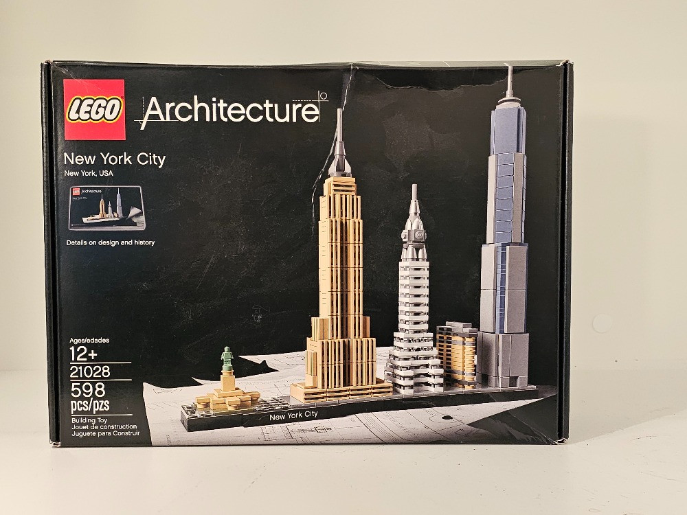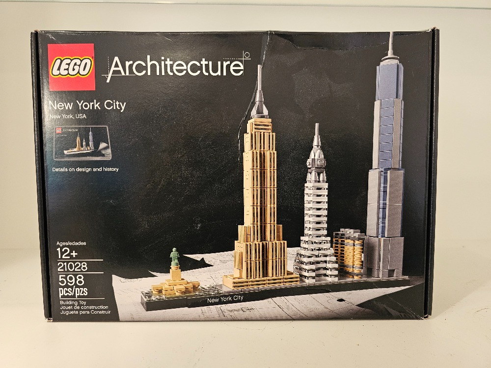 Sealed LEGO Architecture New York City Set Complete & unopened! Released in 2016 and retired in 2024, the 21028 Skyline Series of New York City features the One World Trade Center, Flatiron Building, Chrysler Building, Empire State Building and The Statue Of Liberty. Cool set, box has some creases but otherwise in original, unopened condition! 2.25"T x 10.25"W x 7.5"D