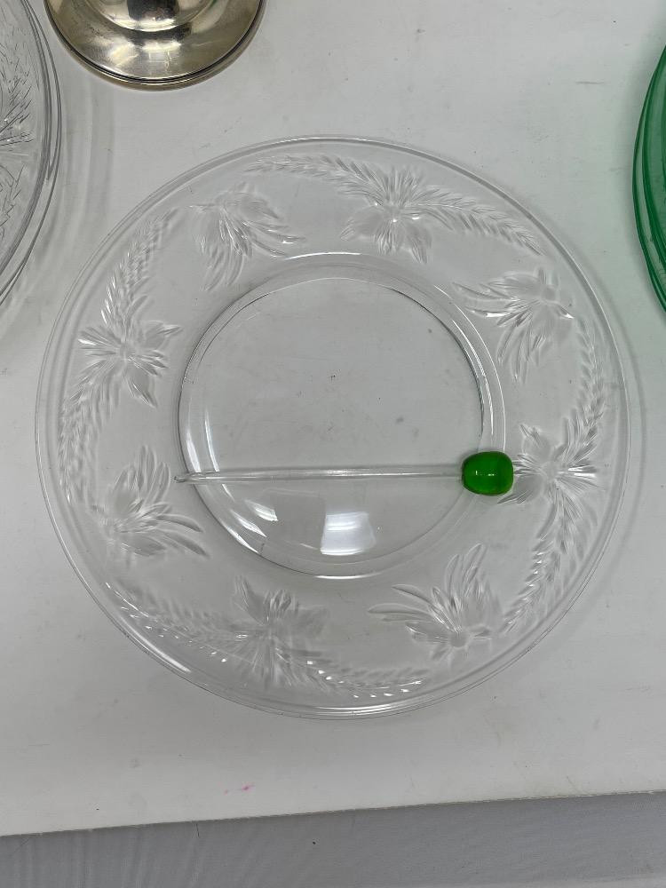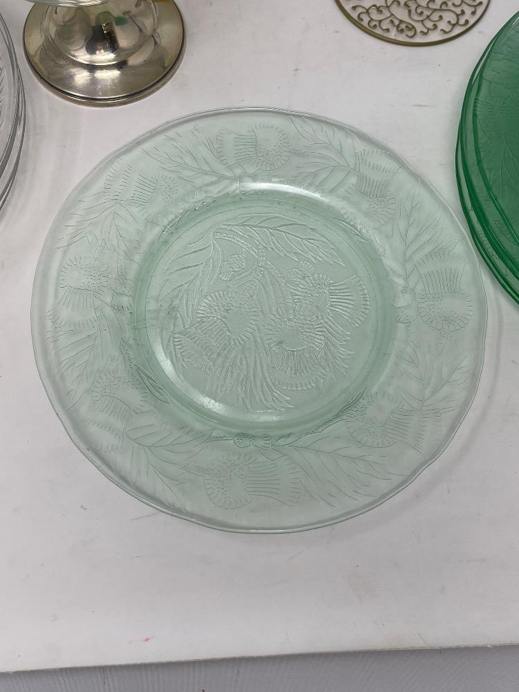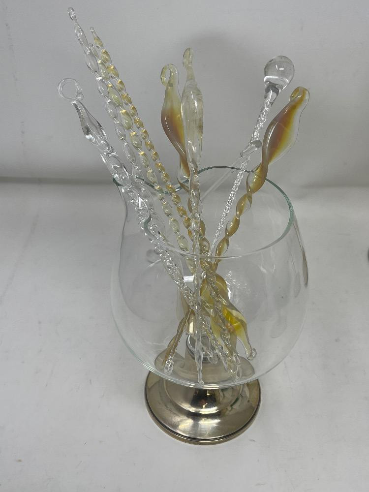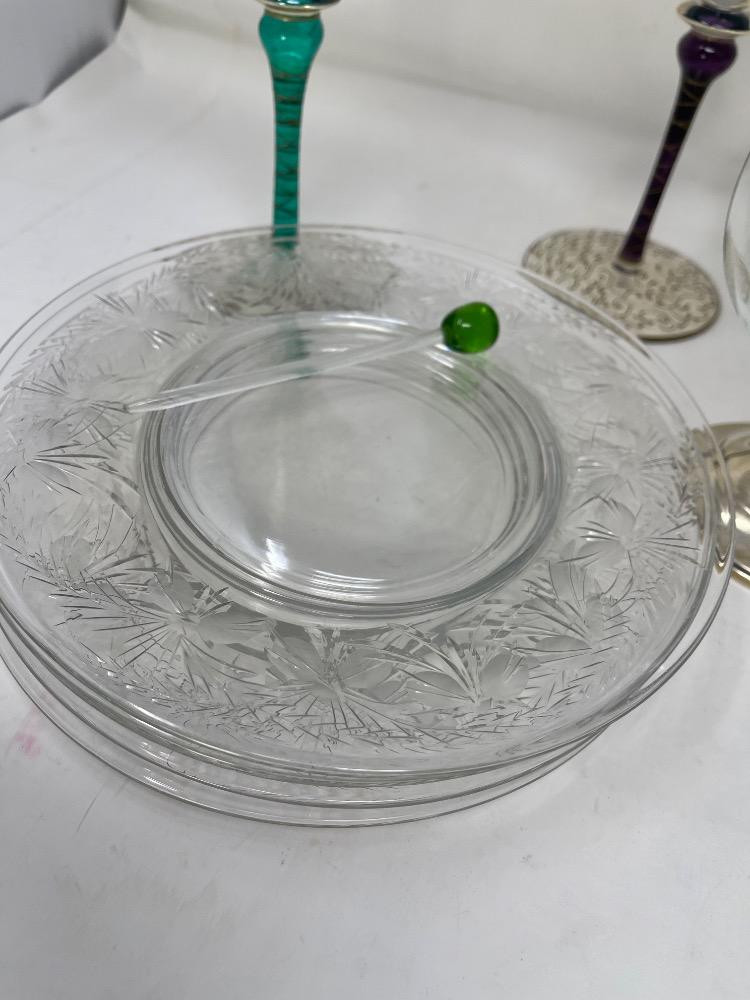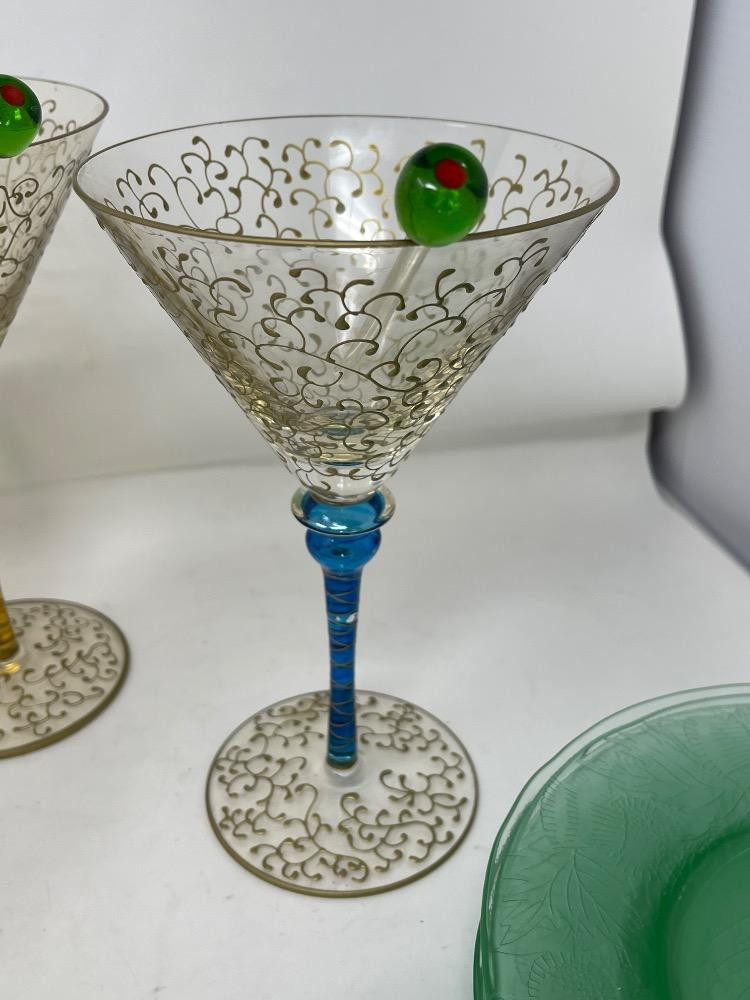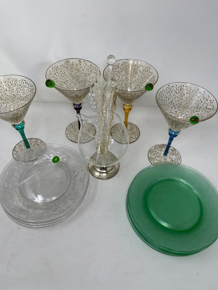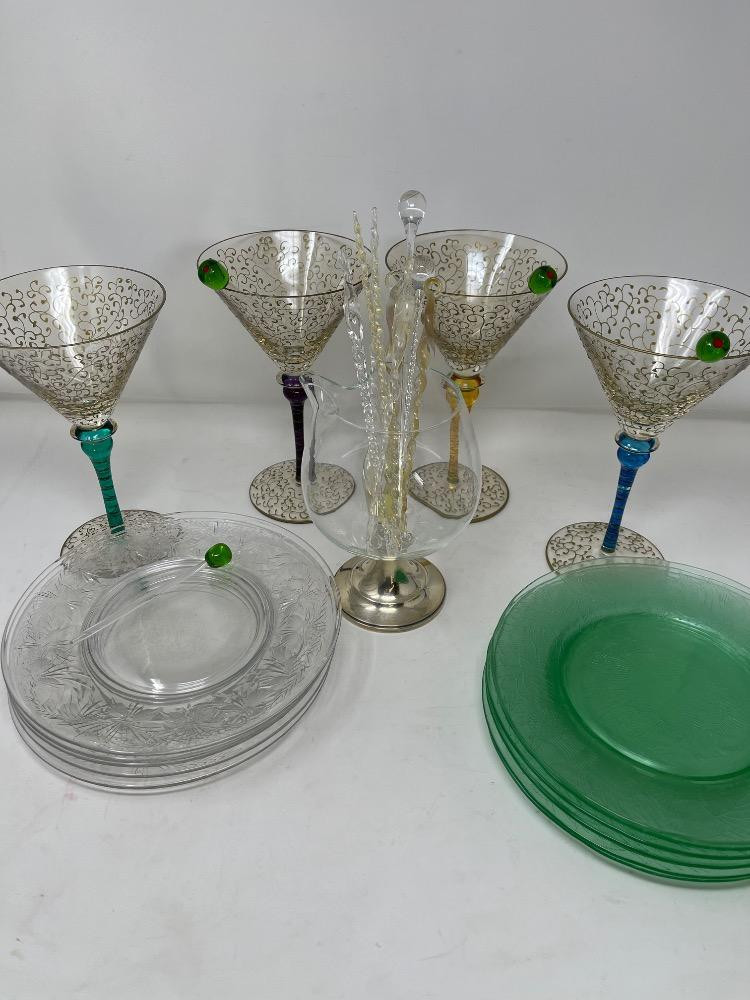 (4) 8” hand painted martini glasses in different stem colors. Included are 4 glass martini picks and additional glass stir sticks. Clear 8” cut glass plates for 5 and light green plates for 7.
