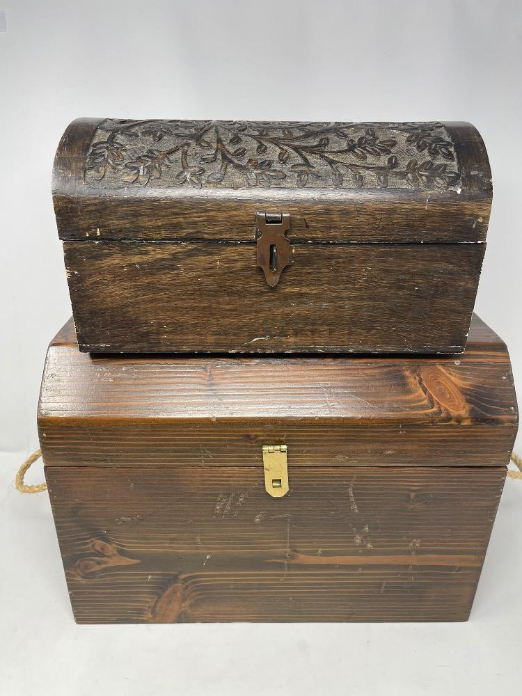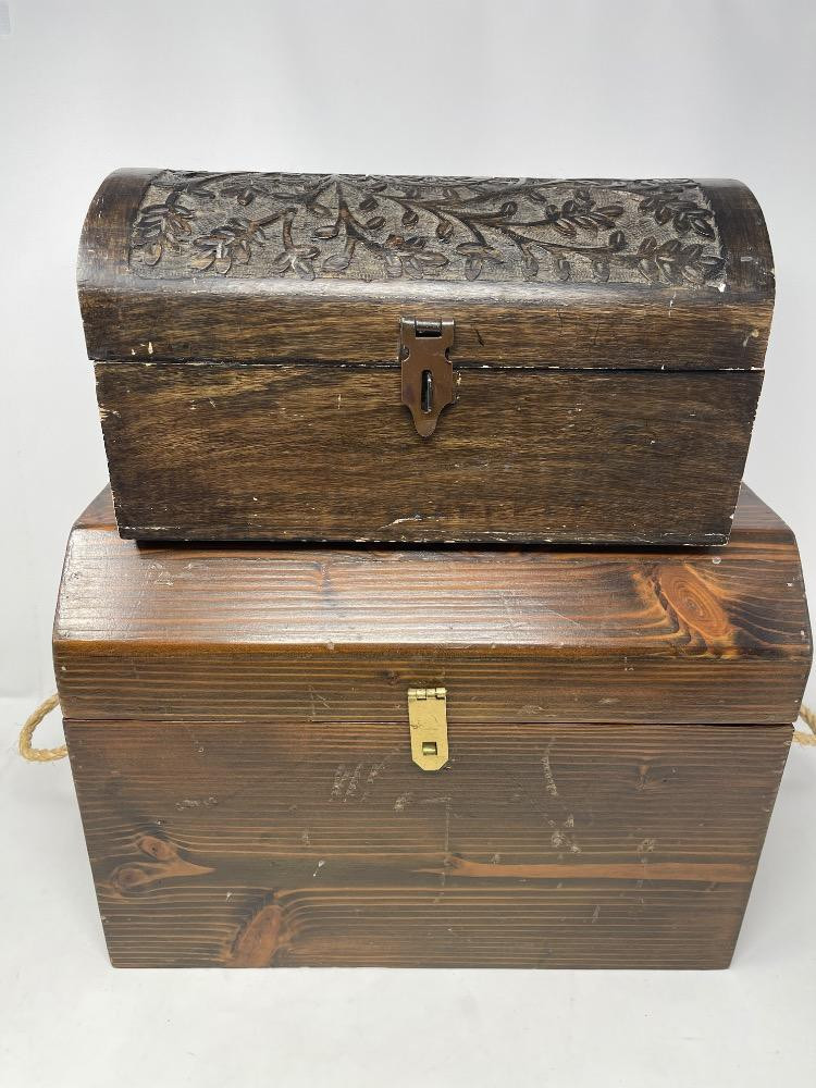 (2) Treasure boxes measure 15“ x 8.5“ x 10.5“ and 12“ x 6.5“ x 6.5“ small, smaller chest with carved top.