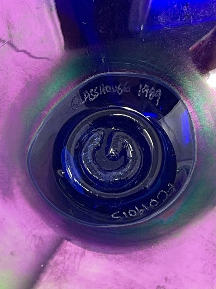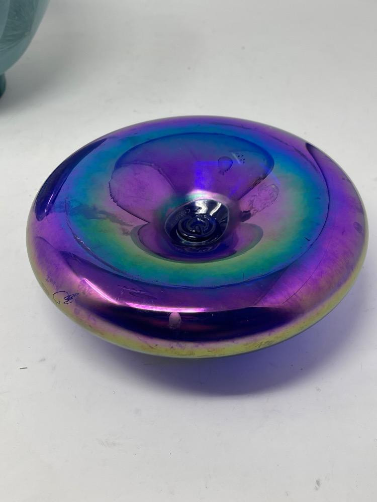 Vivid Iridescent Glasshouse Paper Weight Etched Glasshouse 1989 and an ID number 6”x2.5”