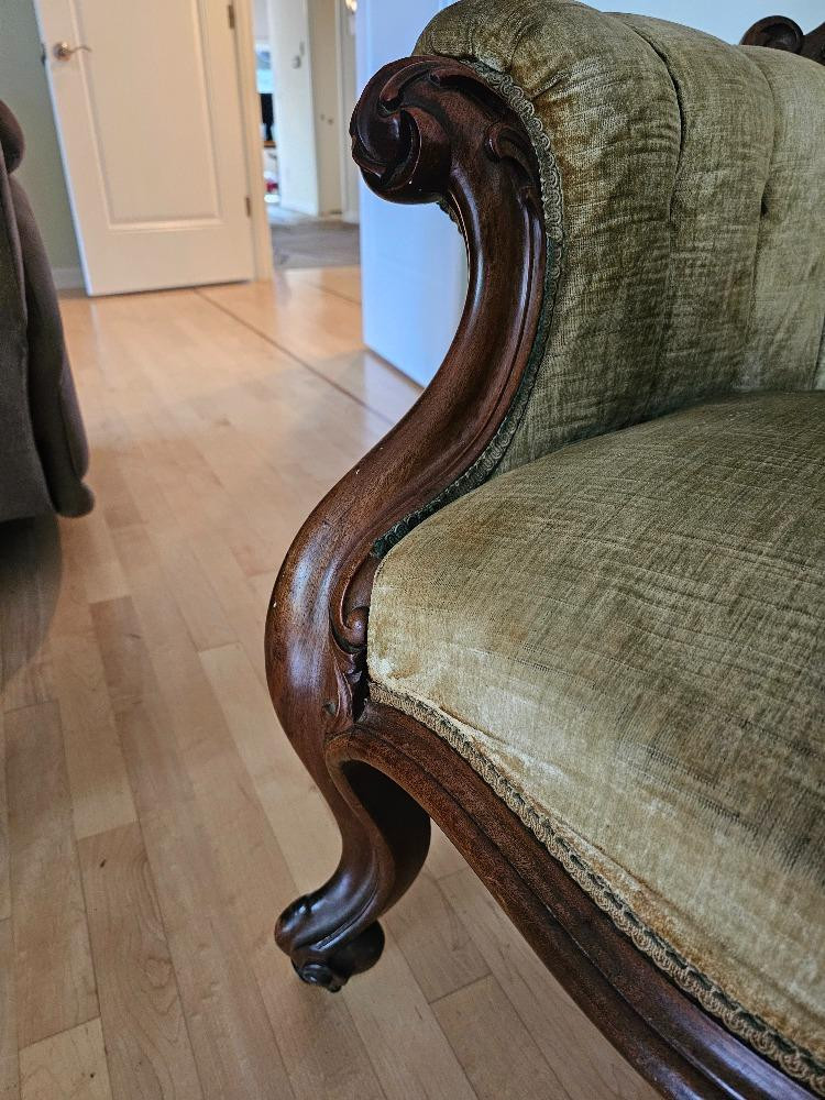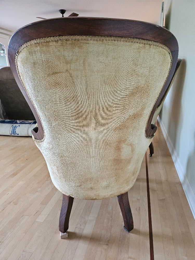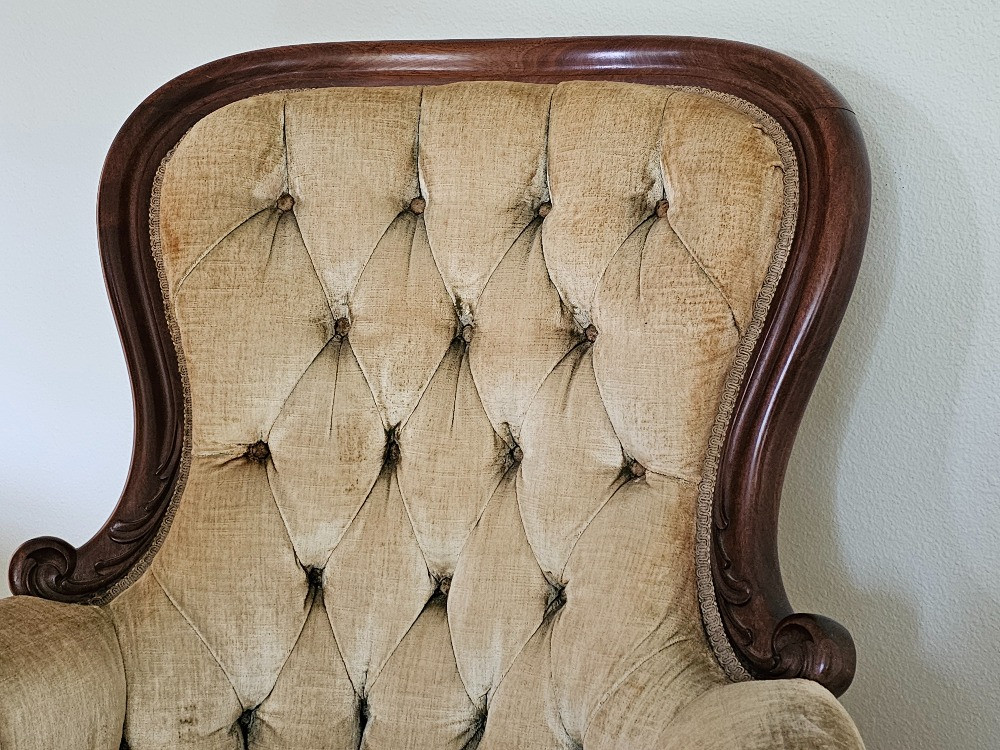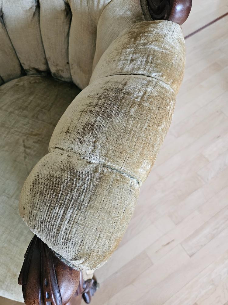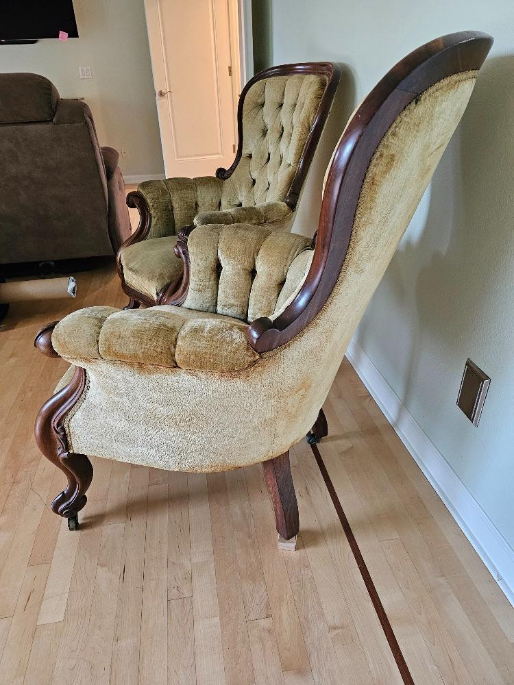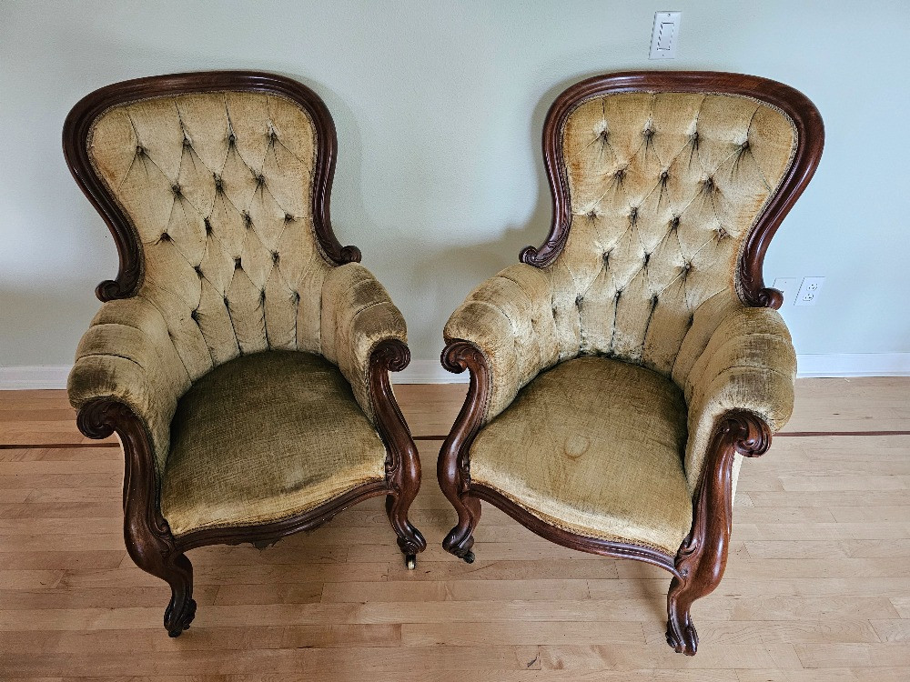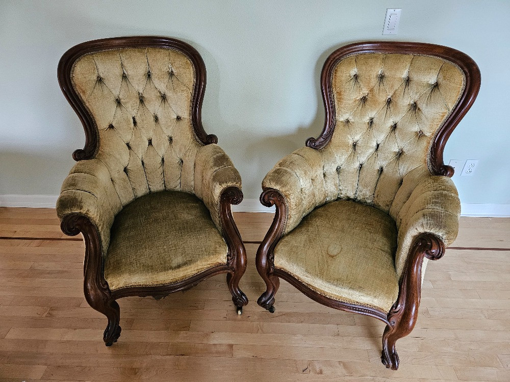 Pair Of Vintage Gold Velvet & Wood Button-Tufted Chairs Upholstered or refinished by Howisey Brothers in Seattle according to the tag on the bottom (see pic) On casters (one missing) 43"T x 27"W x 33"D Velvet is in fair condition, wood frames in great condition