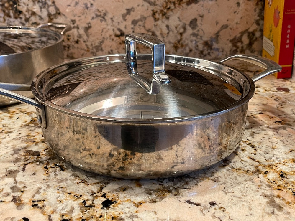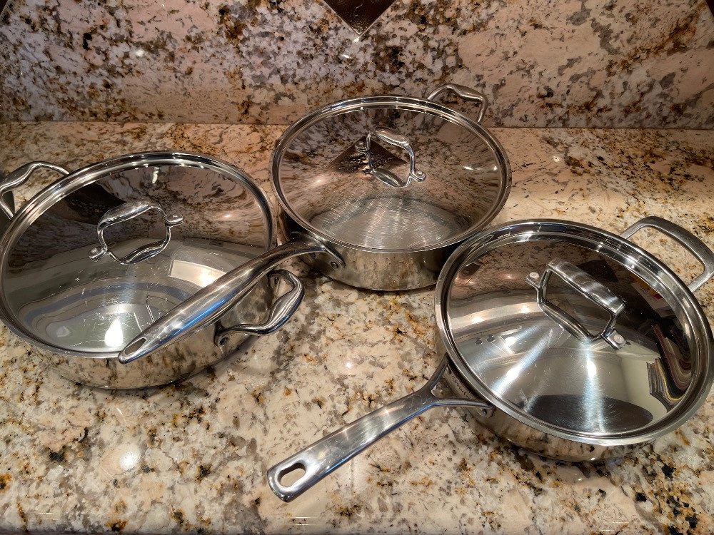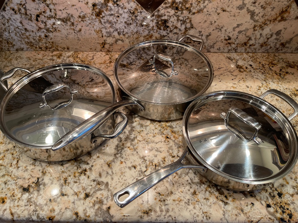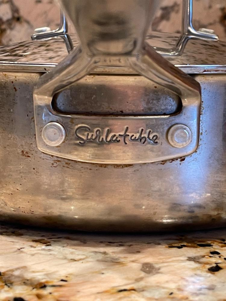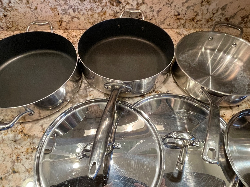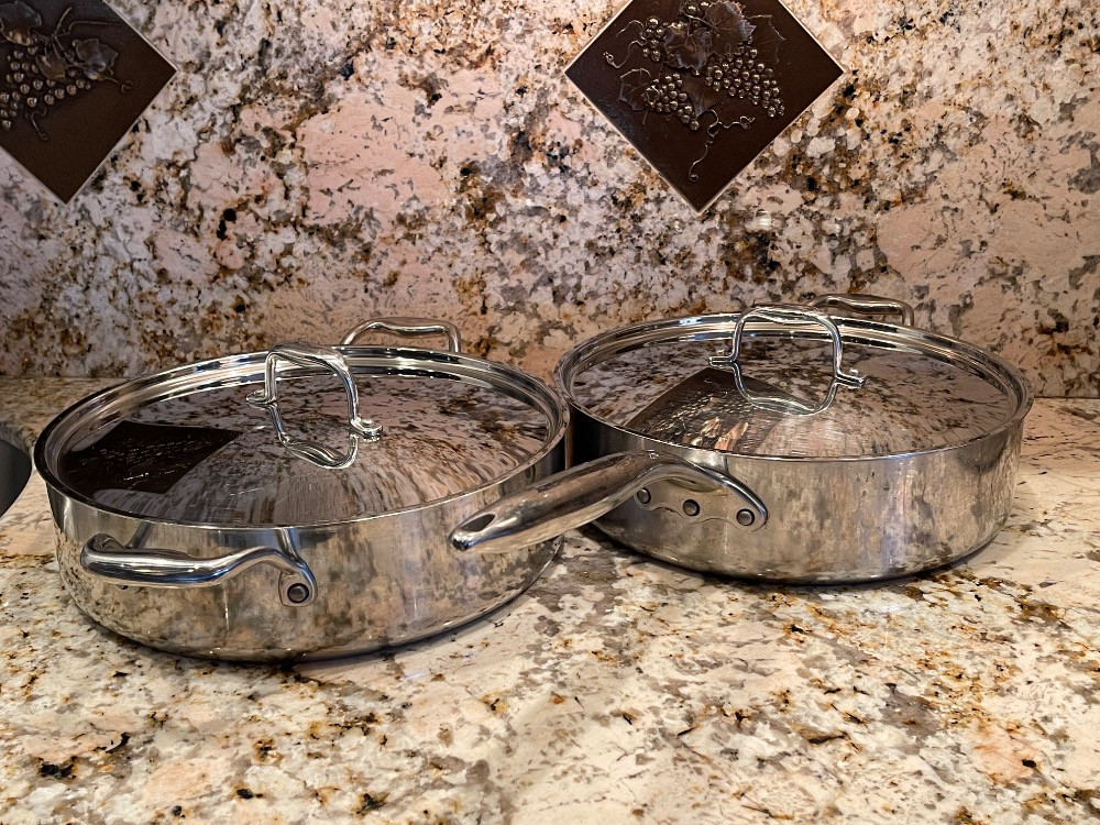 3 pans, 2 lids Commercial Cookware - Stainless Sur La Table - Masterclad 2 Masterclad pans, 1 Sur La Table Pan measure 3”x12” cooking surface.
