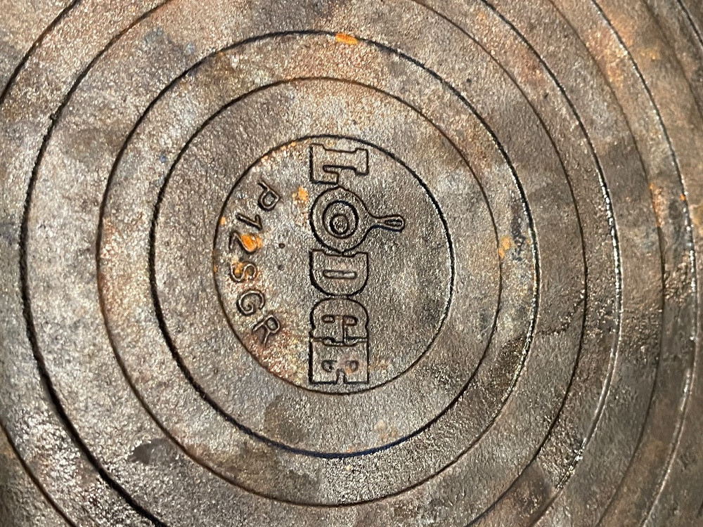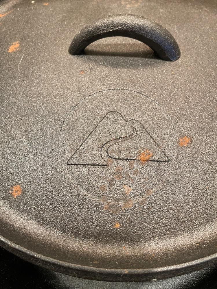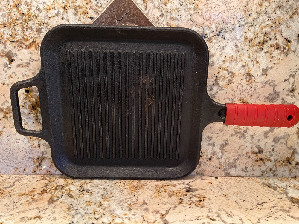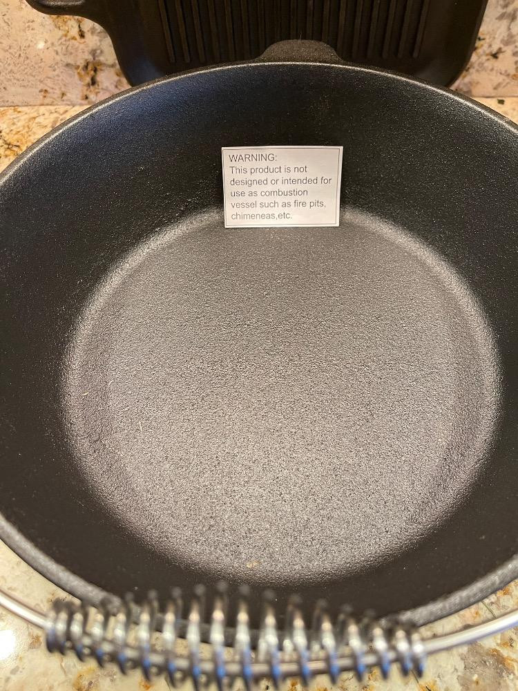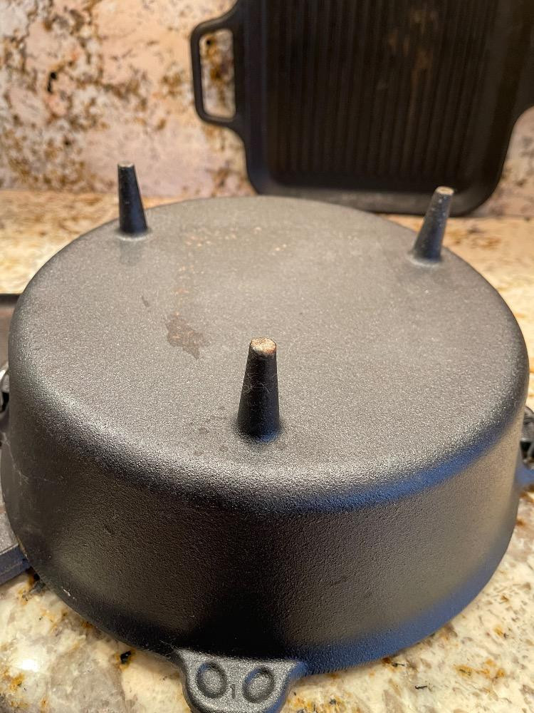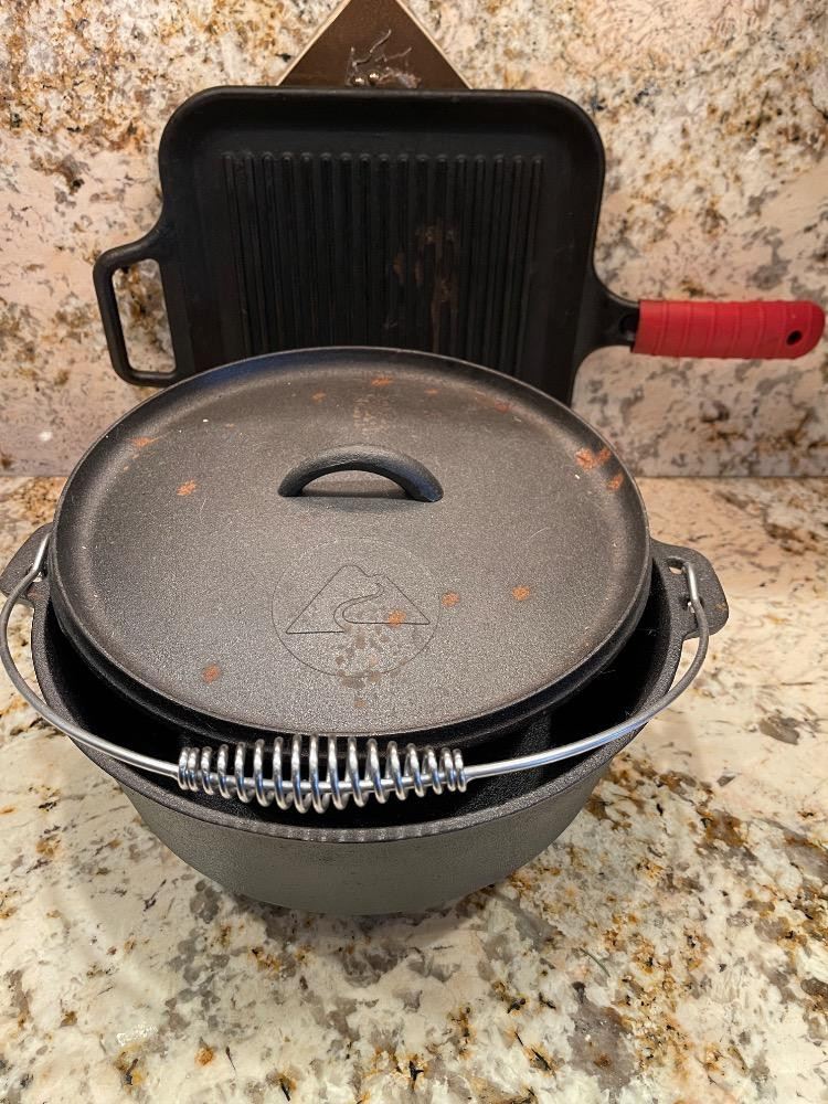 Cast Iron Dutch Oven appears unused 12”x12” cooking surface Lodge Griddle with opposing handles and handle cover