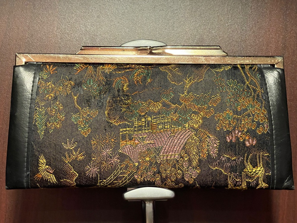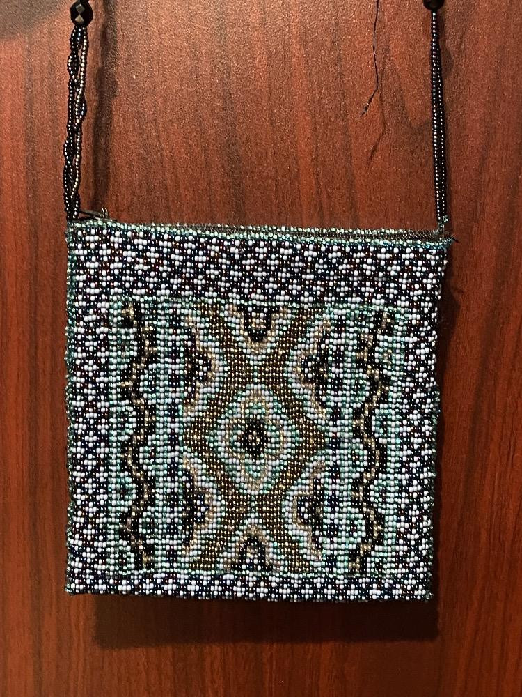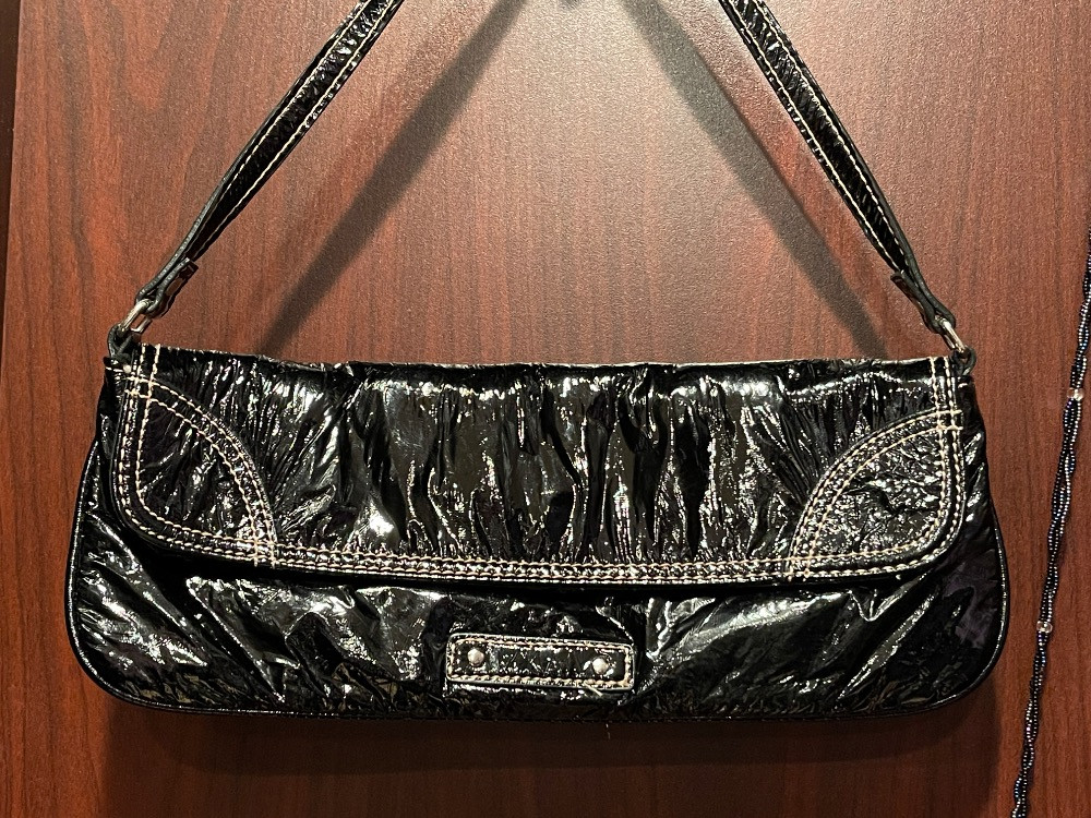 4 small purses. Leather, shiny vinyl, beaded, and fabric.