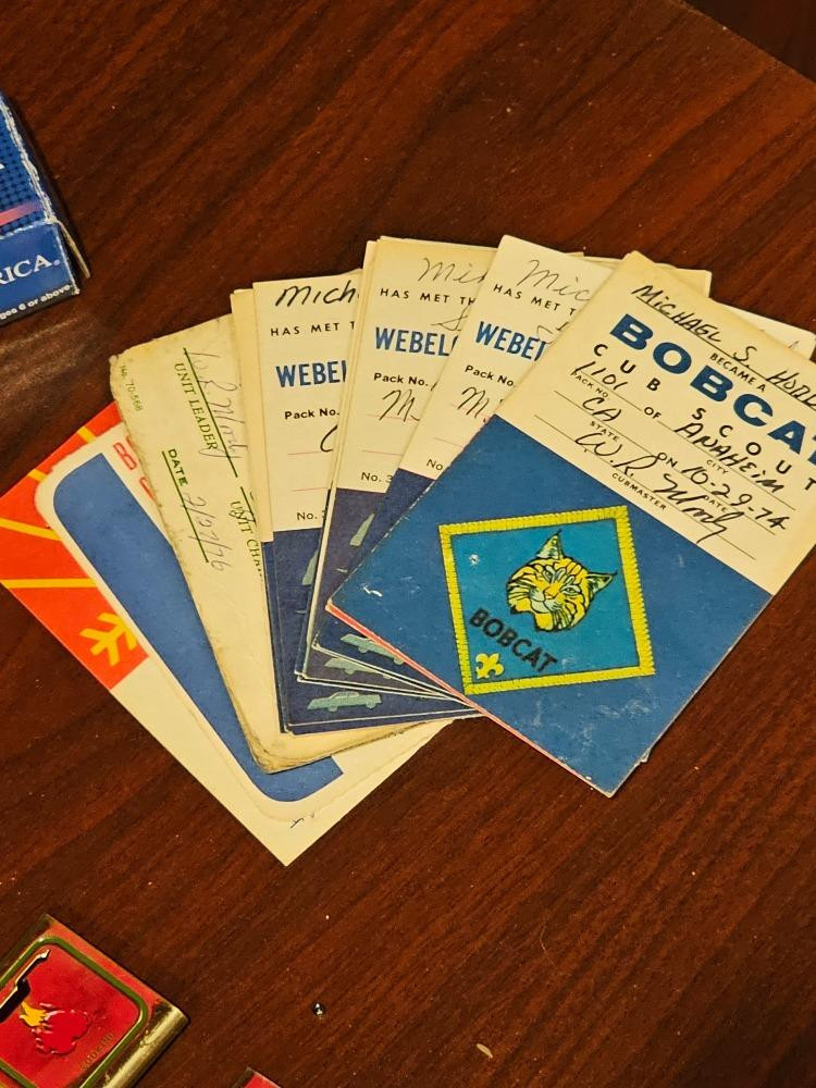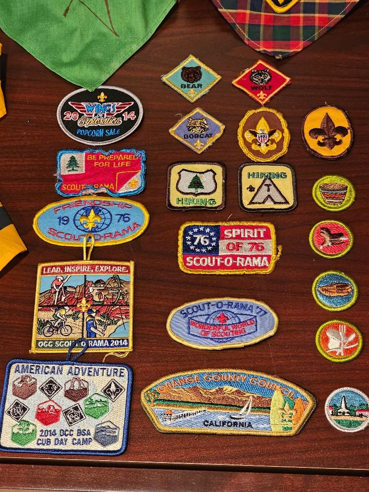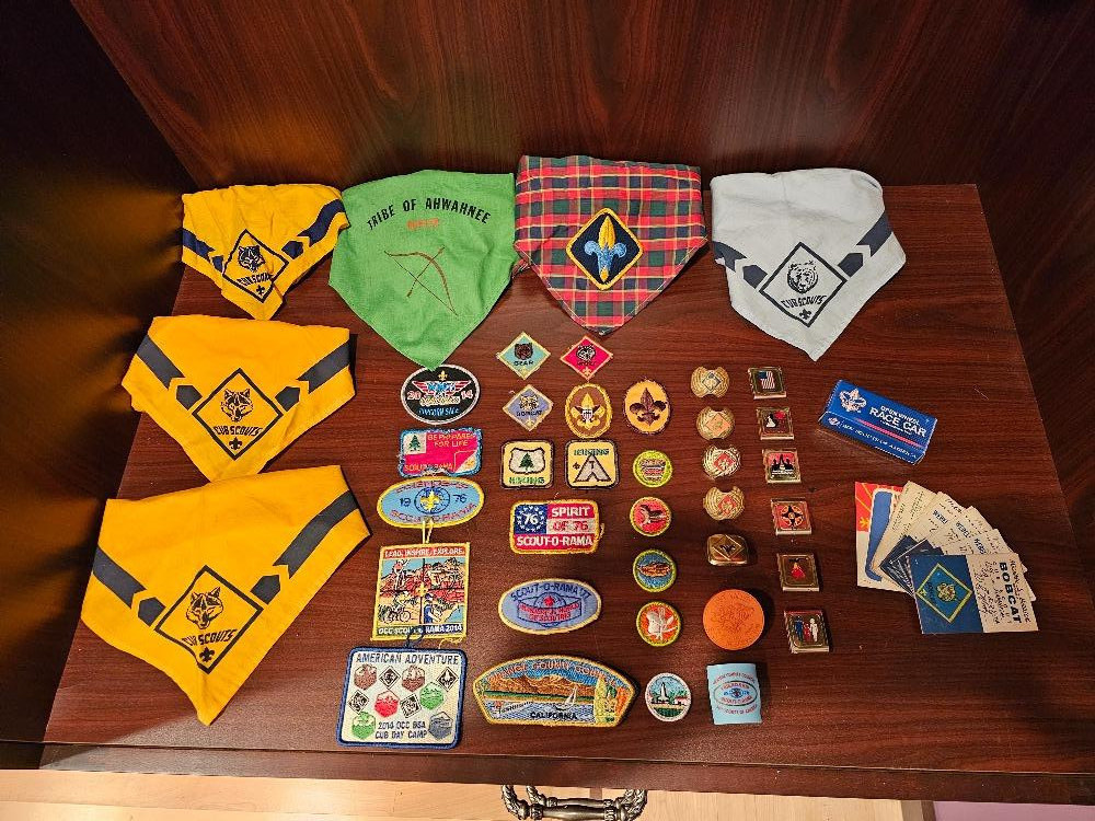 Huge Cub Scout & Boy Scout Memorabilia Collection Ranging from 1974 - 2014, this collection includes many pieces of scouting memorabilia. Includes a uniform & vest adorned with many patches signifying various achievements and events A Tiger Cub & Bear Scouting hats Many loose patches & badges, including a really cool Spirit of 76 Scout-O-Rama Beautiful 54" Walking Stick With Tiger Cub Metal Badge & Leather Strap (6) Neckerchiefs Many Activity Badge cards from 1974 - 1977 (13) Neckerchief slides NIB Die-Cast Racecar