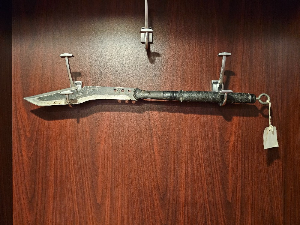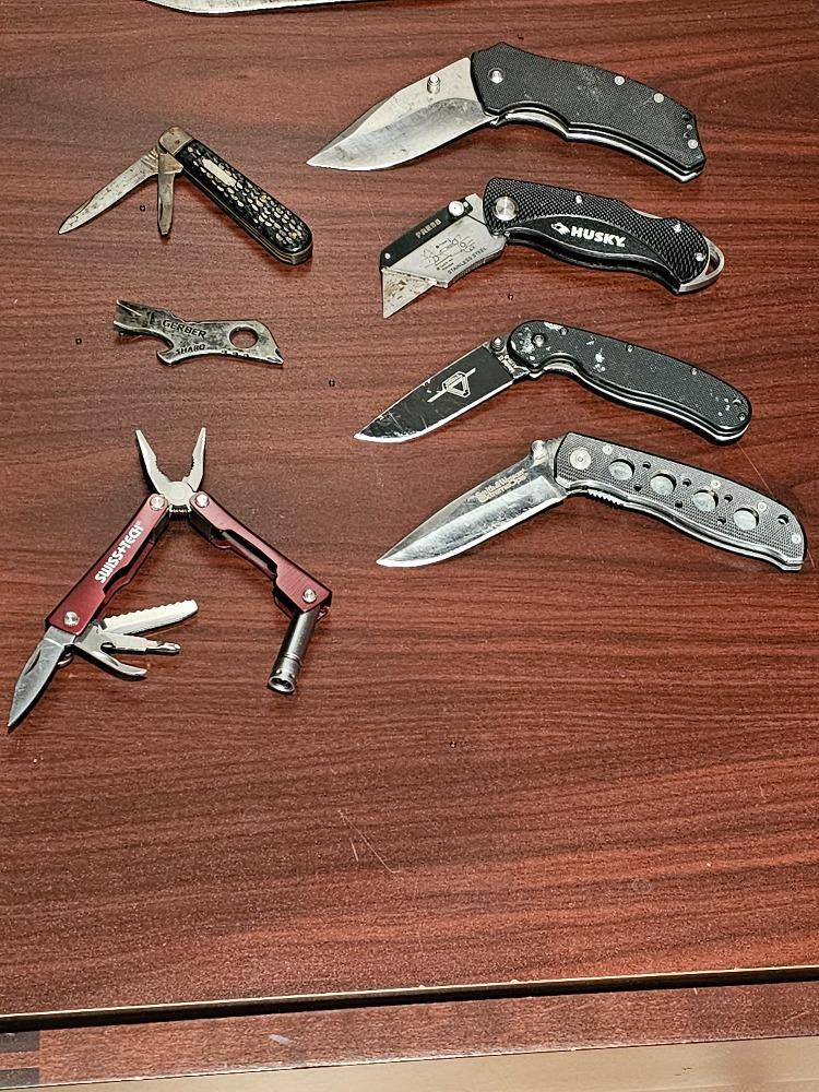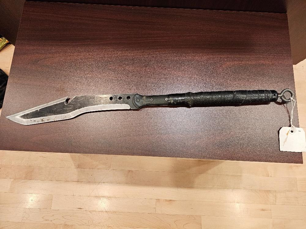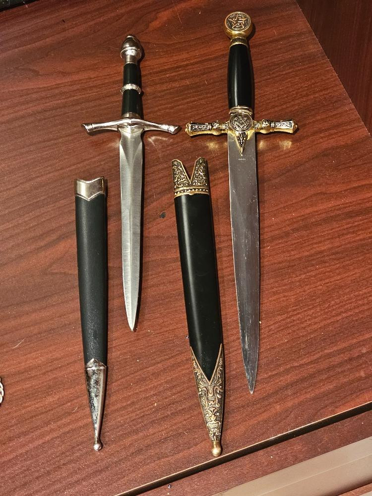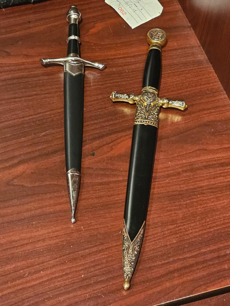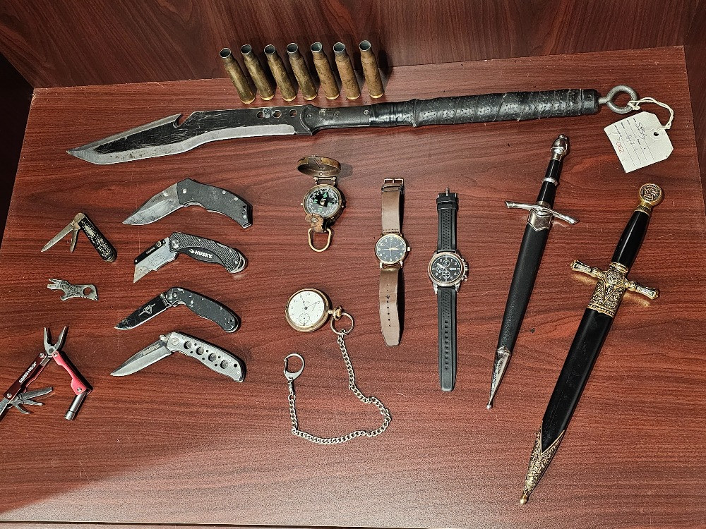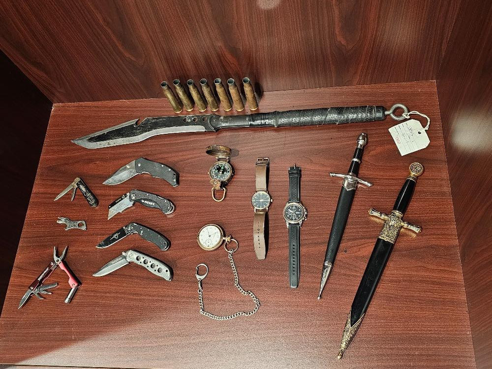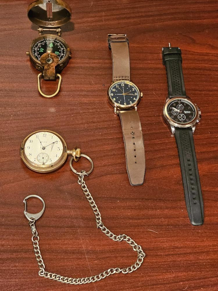 Cool Stuff Collection Pocket knives (6), watches (3), vintage compass, daggers (2), a zombie killing weapon (my best guess) and huge spent shell casings (7) Pocket knives from Kershaw, Husky, Smith & Wesson, Randall's, and more Watches from American Exchange and unknown maker Pocketwatch is Elgin, cracked glass and missing hinged cover. Unknown working condition Antique brass military lensatic compass (with engraving) Daggers made in China - 13.5"L & 15.5"L The zombie knife seems to be referred to on the internet as a riot spear (who knew?) - 29.5"L