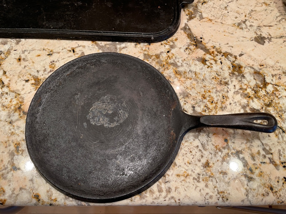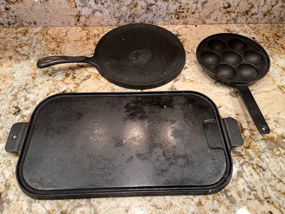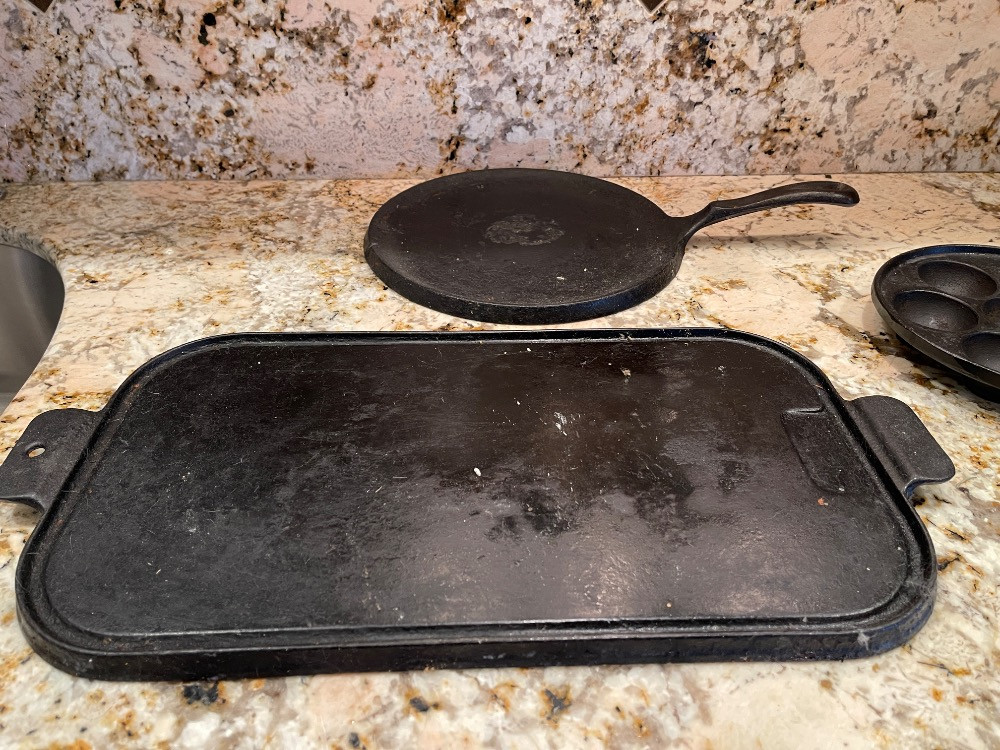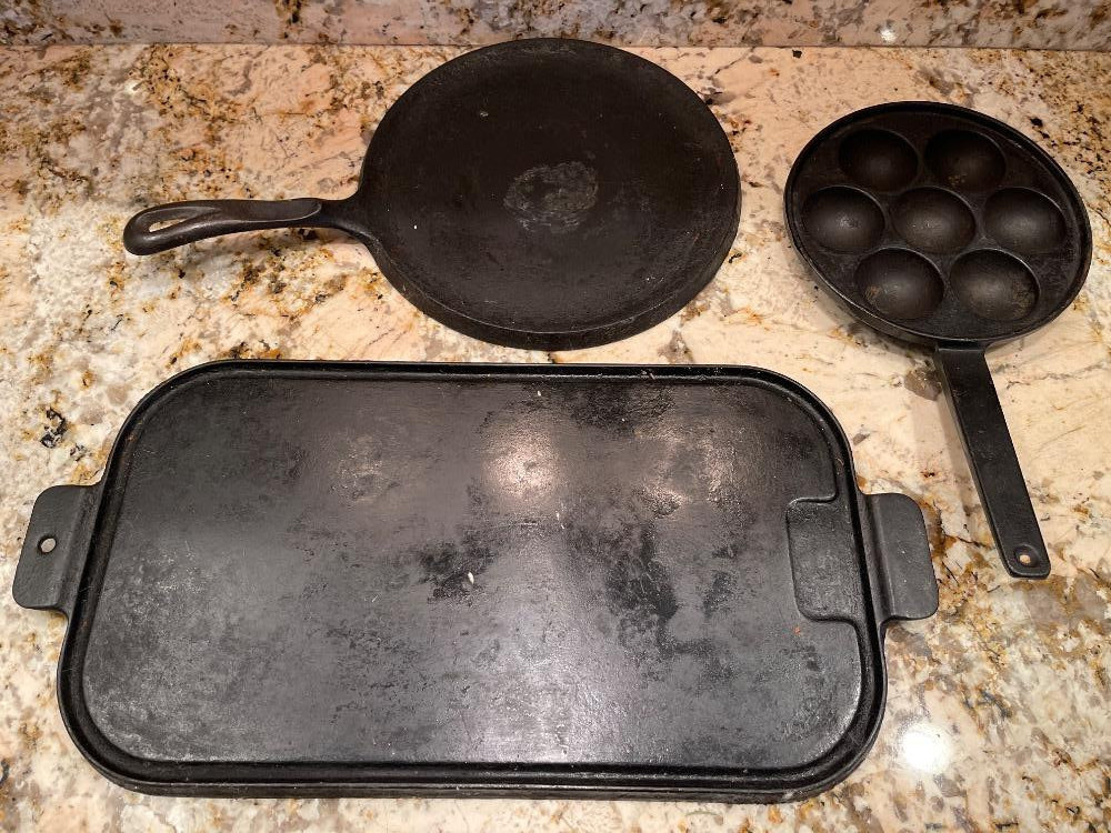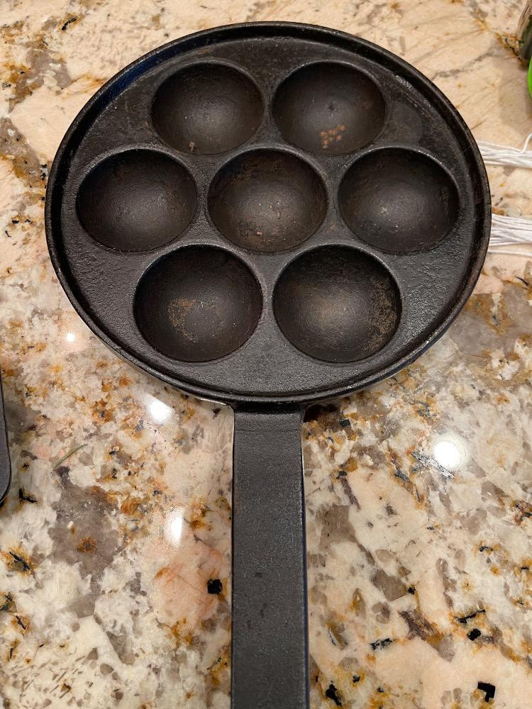 Cast Iron Griddles 17”x10” 10.5” diameter Wagner Danish Aebleskiver Pan for making Danish pancake puffs. 7.75” diameter.