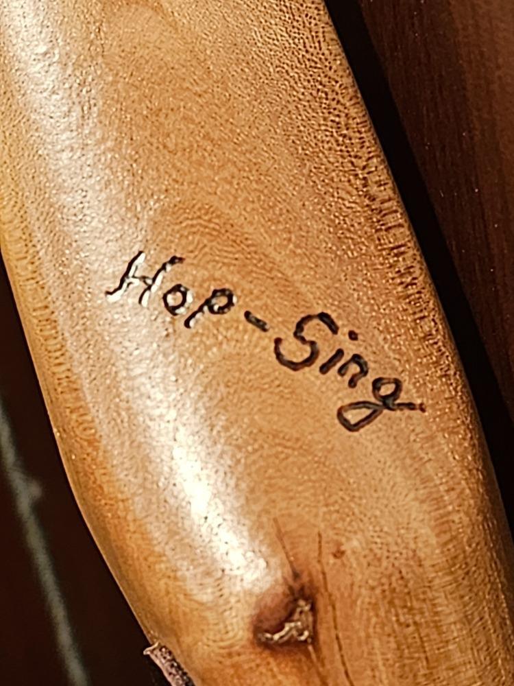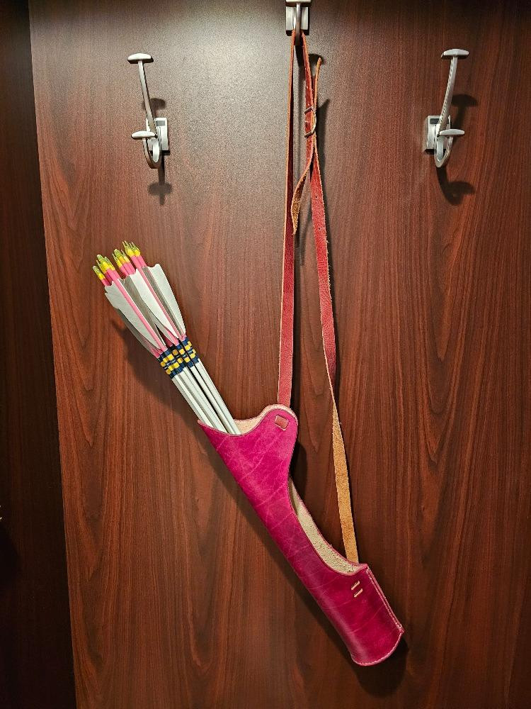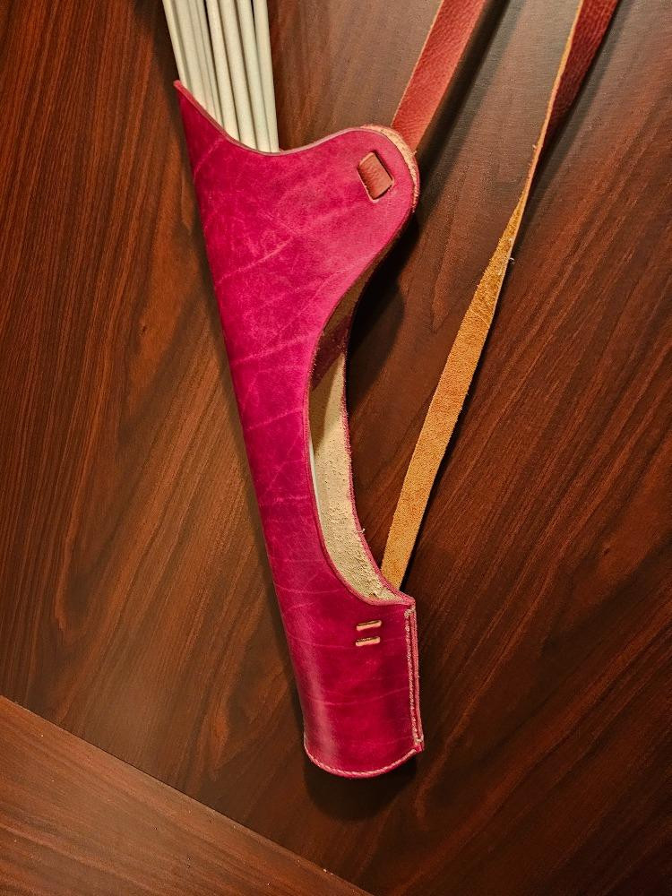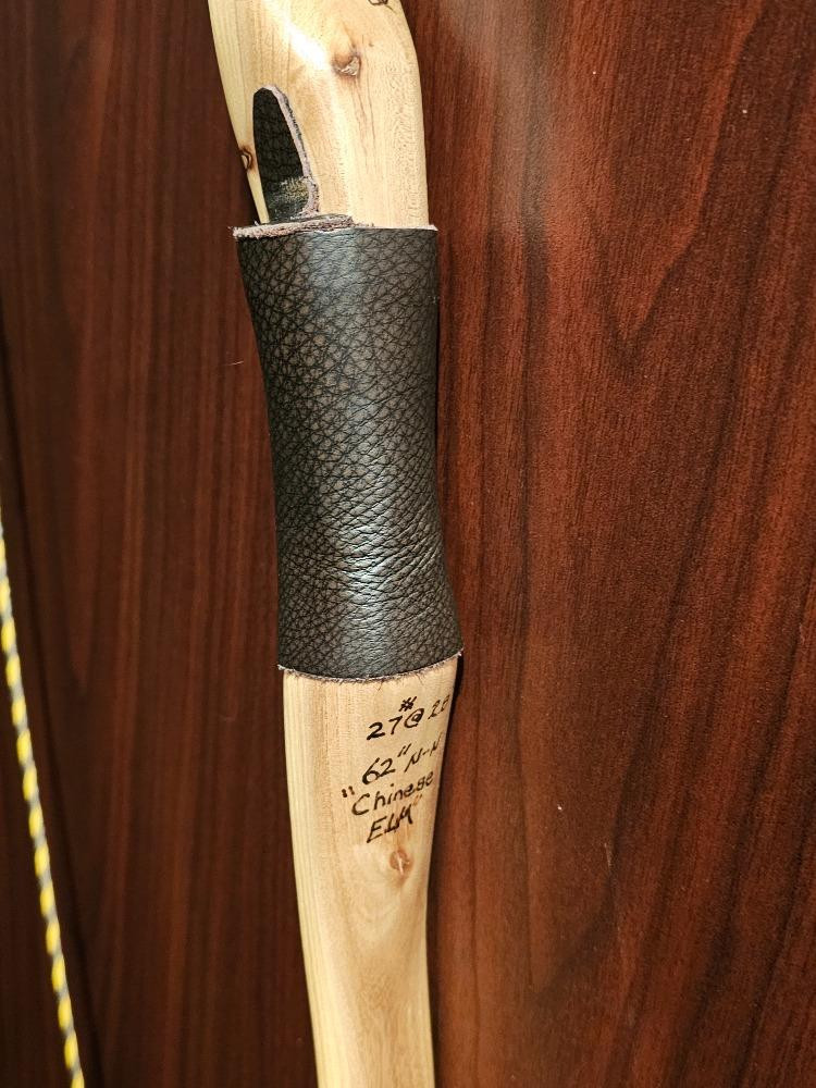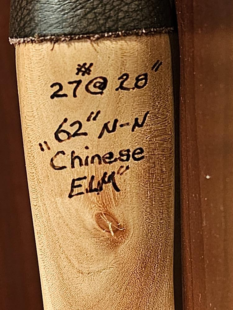 Willapa Bows Recurve Bow And Quiver Full Of Arrows Longbow is marked: "Willapa Bows" "Paul Larson" "Hop-Sing" 27# @ 28" 62" N-N "Chinese Elm" Leather-wrapped handle Red leather quiver includes 11 metal-tipped arrows Untested - but looks like it would shoot!