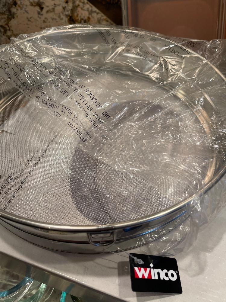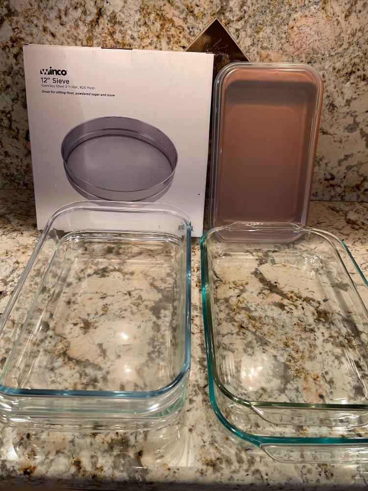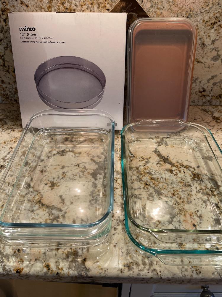 Large Pyrex Cake Pans 10.5“ x 15“ and 9 1/2“ x 13“. 12” Stainless Sieve