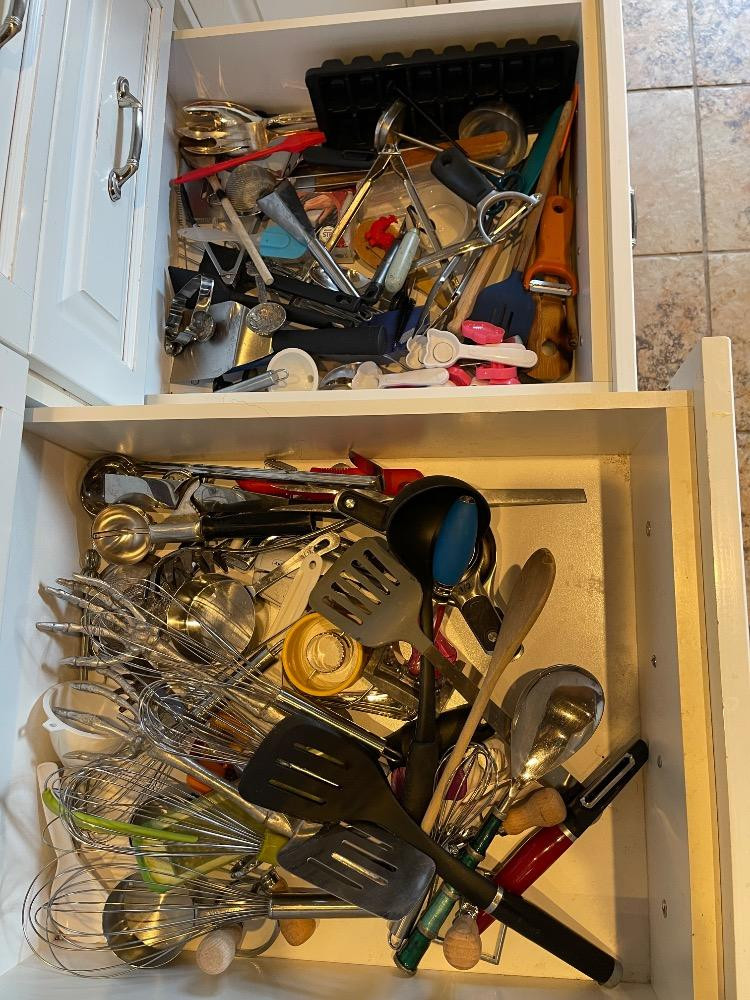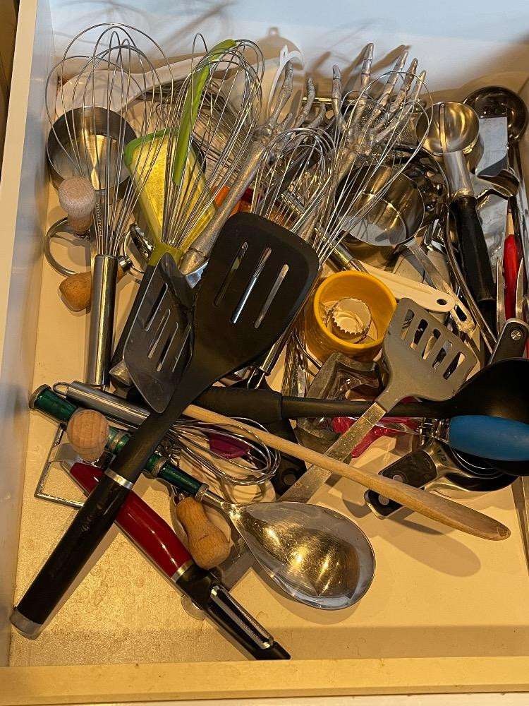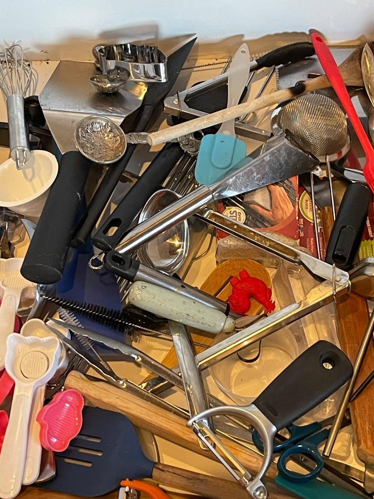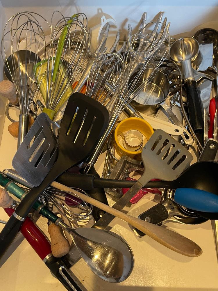 A chefs kitchen drawers with some commercial size utensils and unique things not found in a typical drawer. This is a great lot.