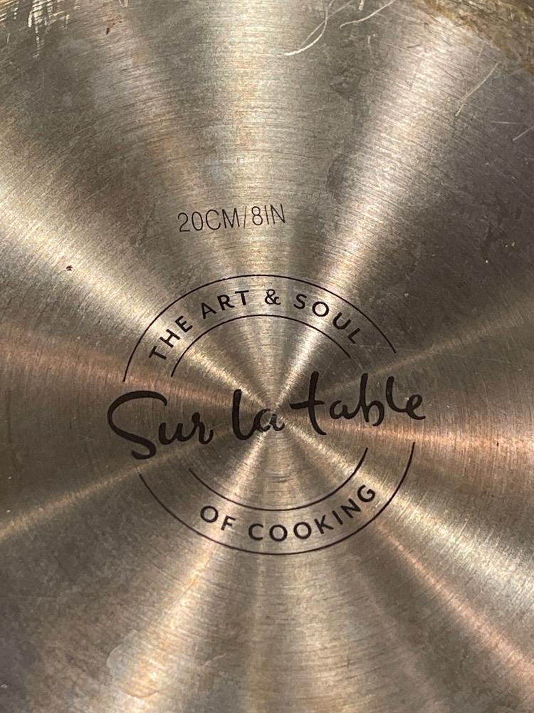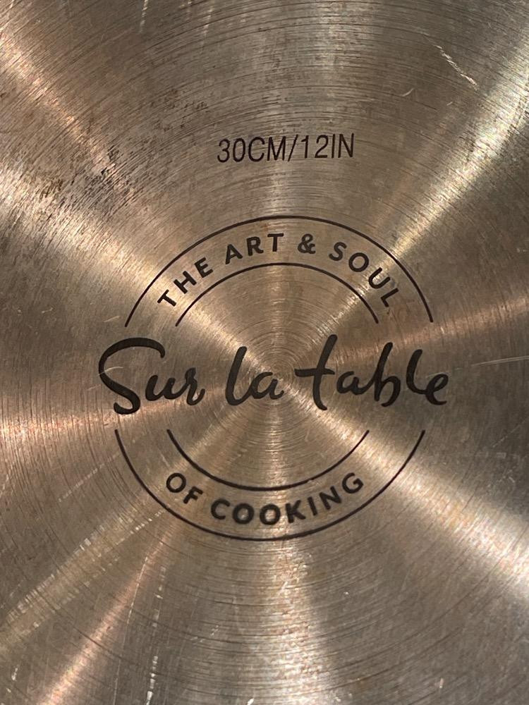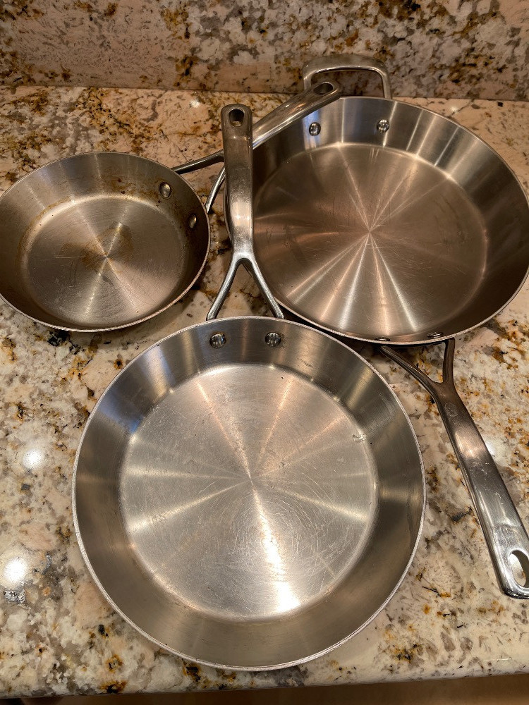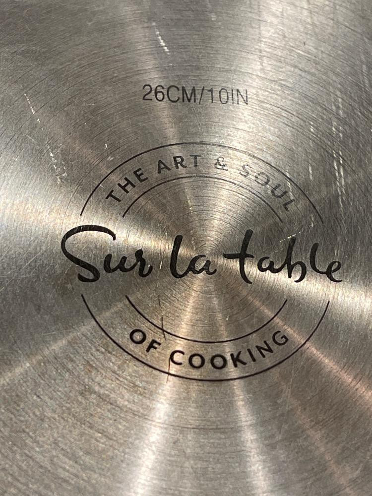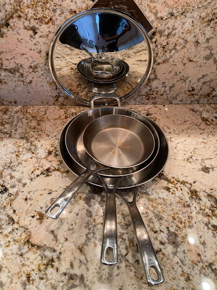 Sur La Table Stainless Steel Commercial Cookware Frying Pan Set & Lid 8,10 and 12” with 12” lid