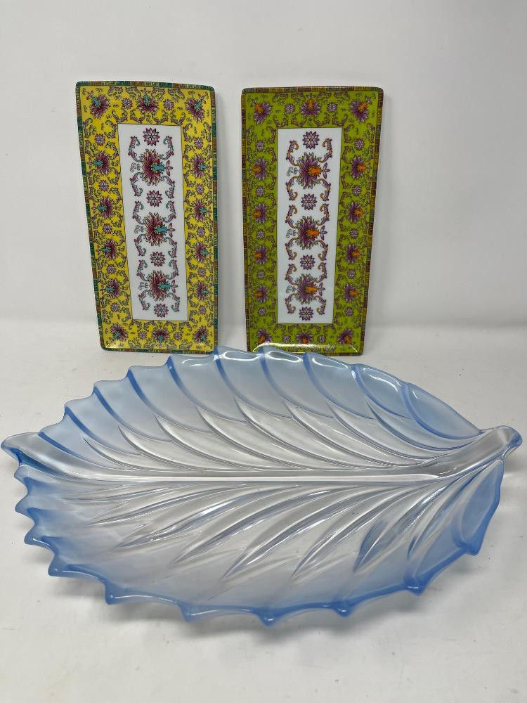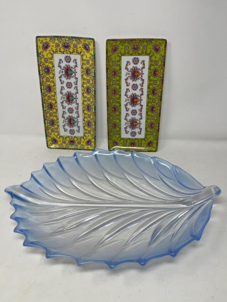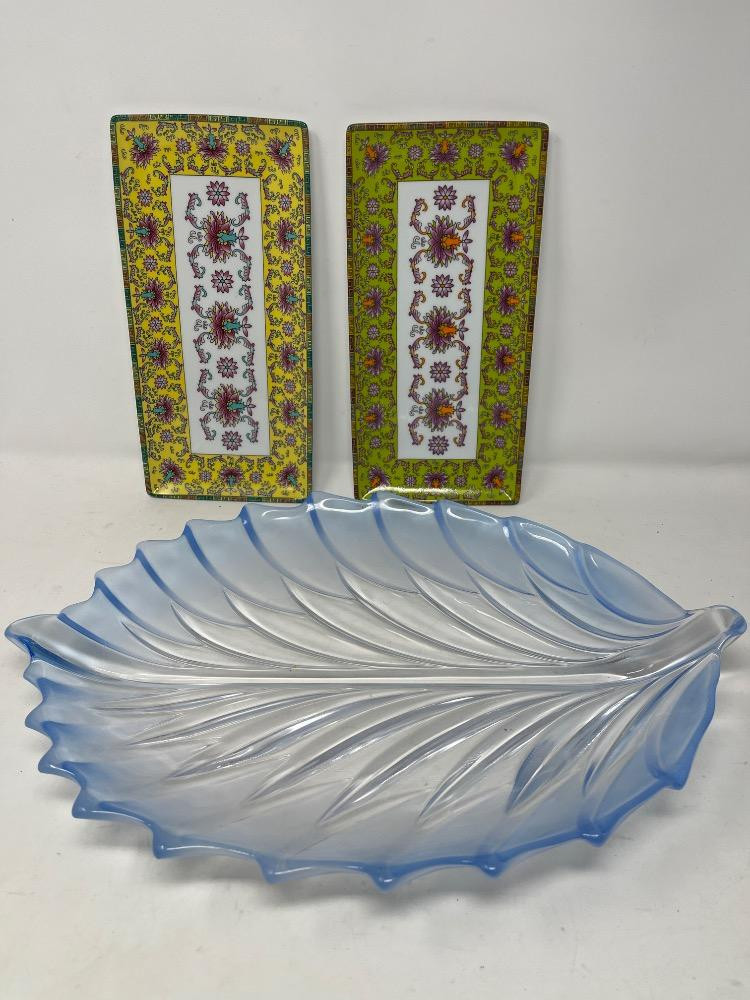 Blue Glass Leaf Shallow Bowl 16“ x 11 1/2“ x 1.75“. Porcelain Canapé Trays 5.25“ x 10.75“.