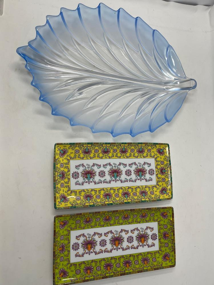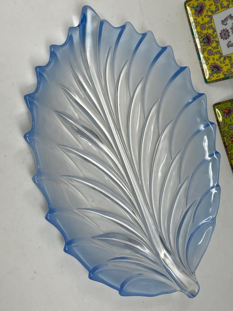 Lot # 132 - Blue Glass Leaf Shallow Bowl with Canapé Trays