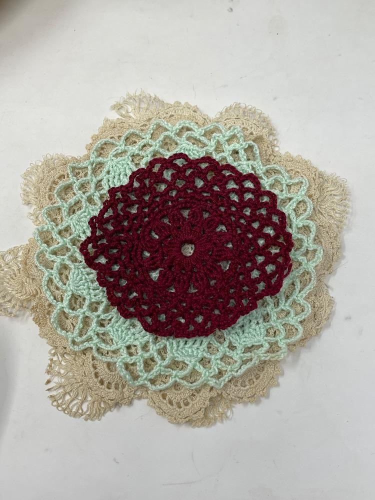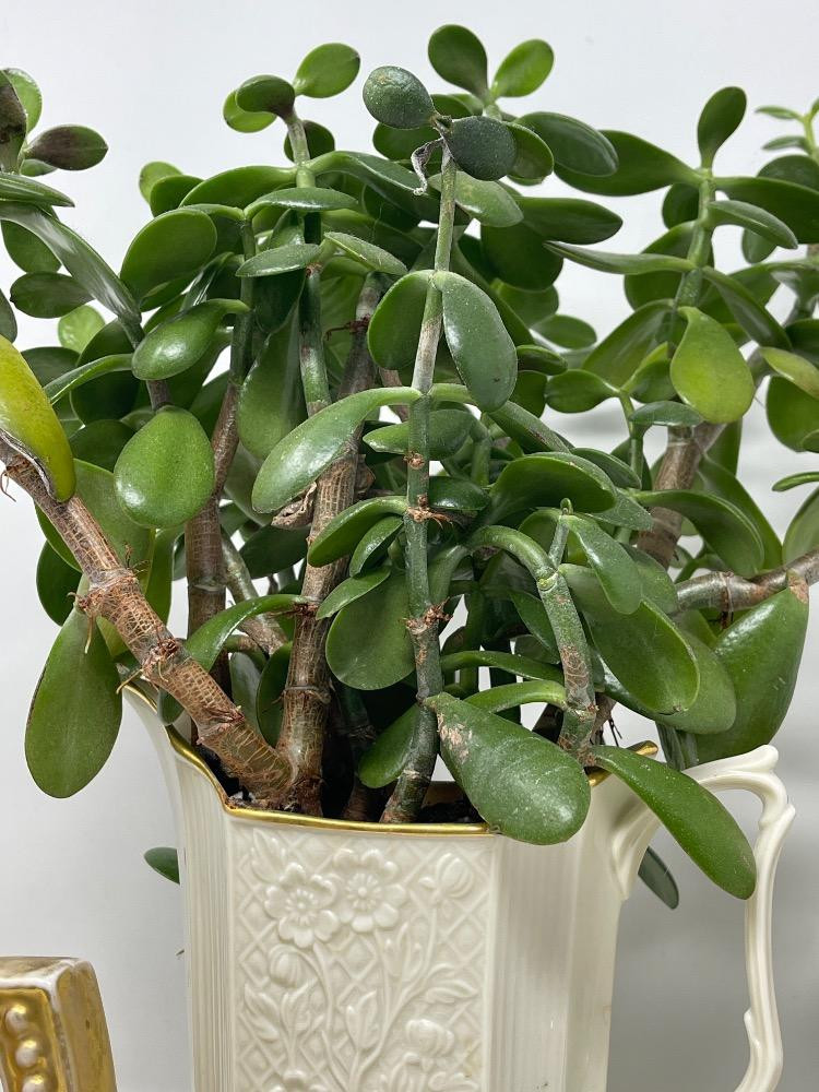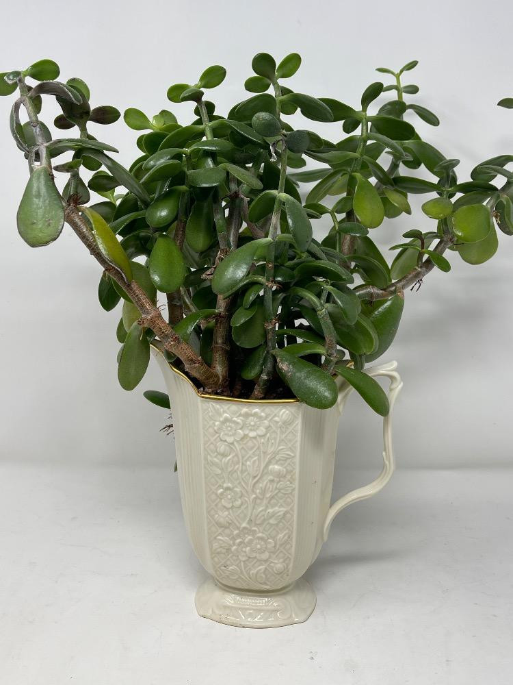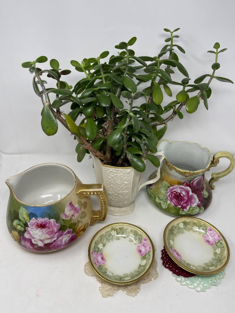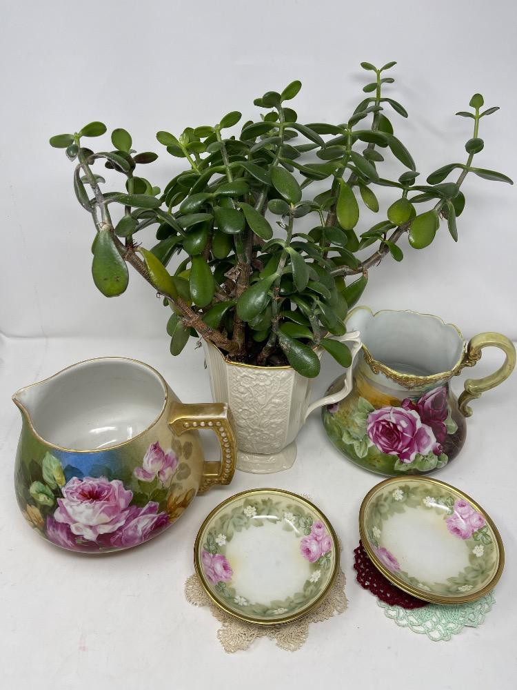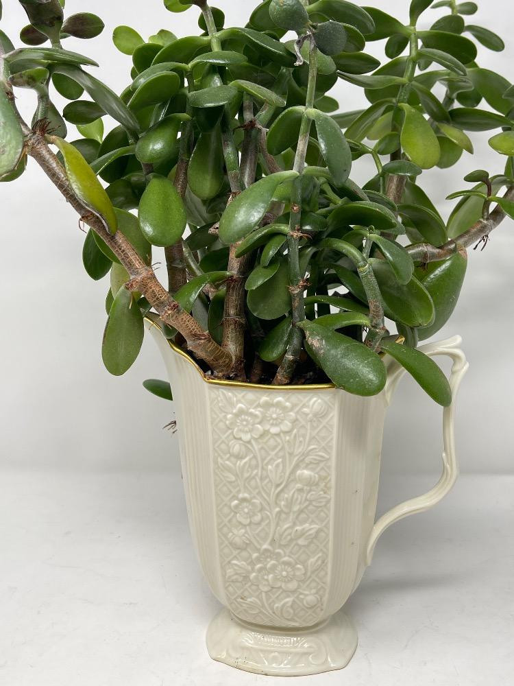 A few very small doilies and a very lovely Jade plant in a Lenox floral pitcher.