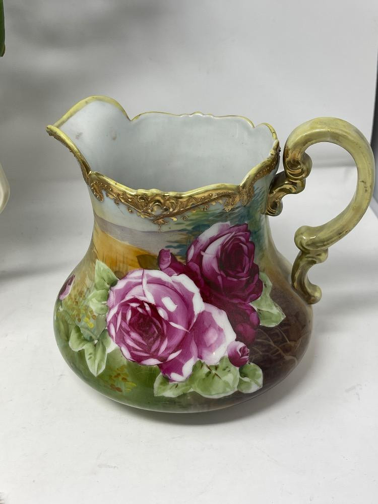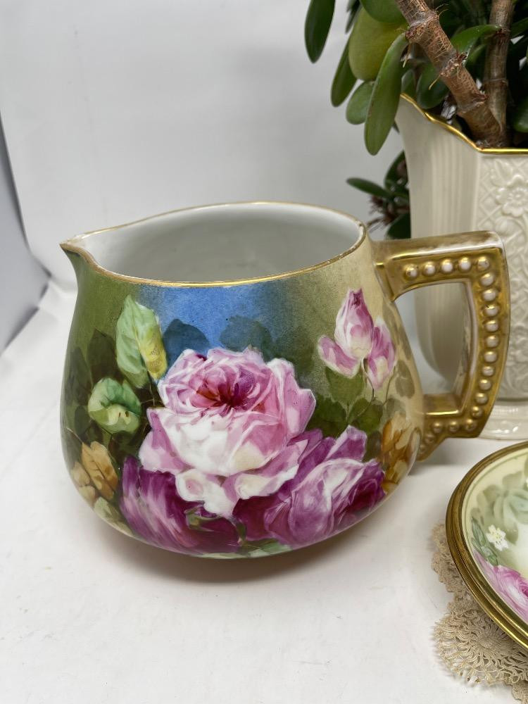Hand Painted China Nippon Rose pitcher with large pour spout 4 Royal Dresden rose with gold rim fingertip bowls JP France Pitcher with pearl handle.