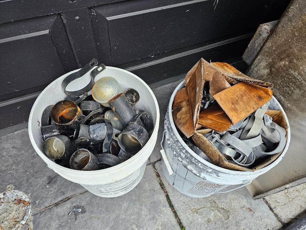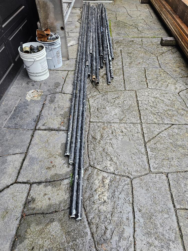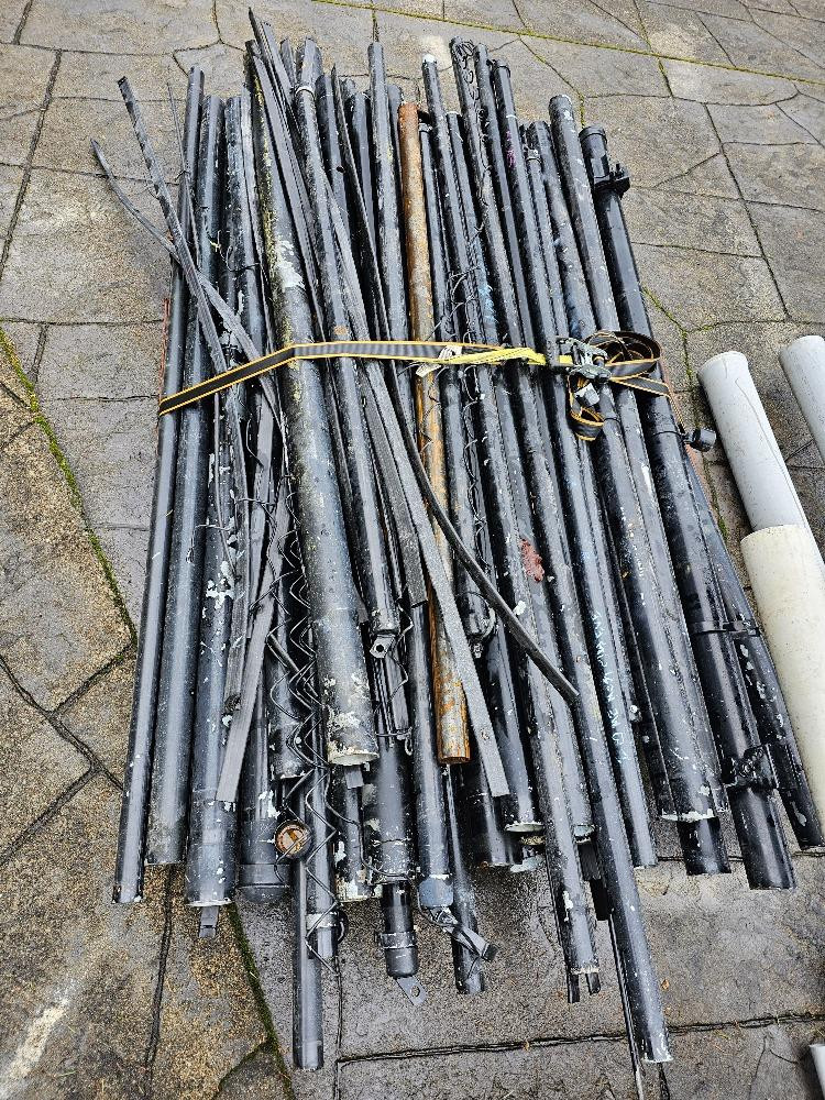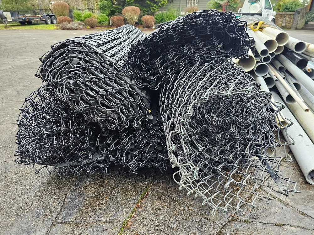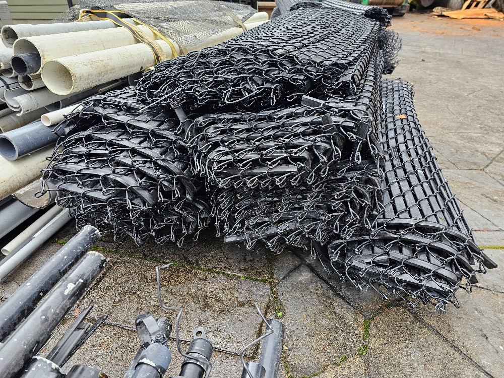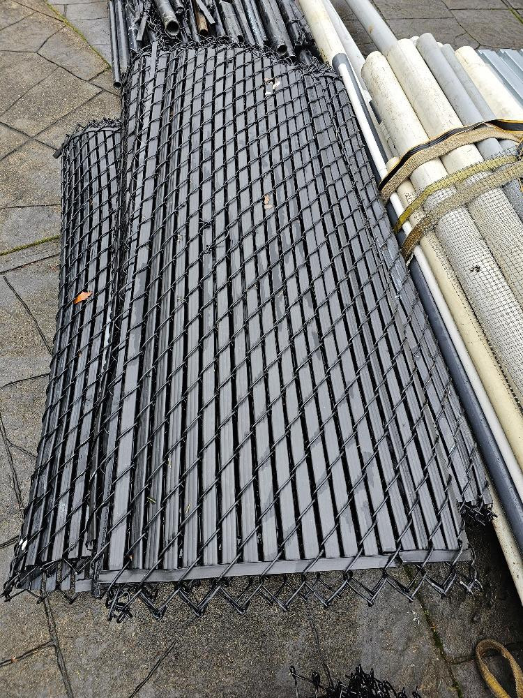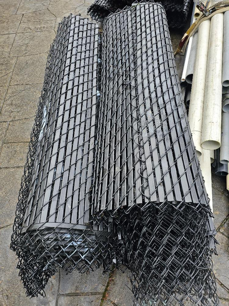 Over 200' Of Used Black Chain Link Fencing, Poles, Top Rail & Hardware Need to secure a yard or build an enclosure on a budget? Here's your chance! 200'+ black metal chain link 72" tall fencing in approximately 13 rolls, 10 rolls with black privacy slats installed (on 2 pallets) Pallet of used black metal fence posts, corner posts, and top rail Loose sections of used black metal top rails for chain link fencing Two 5 gallon buckets of black & galvanized chain link fence hardware