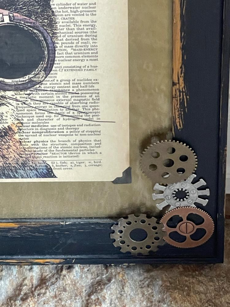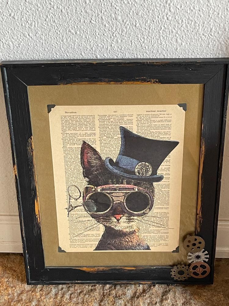 Steampunk Clockwork Kitty Art measures 13“ x 16“ in distressed look wood frame.