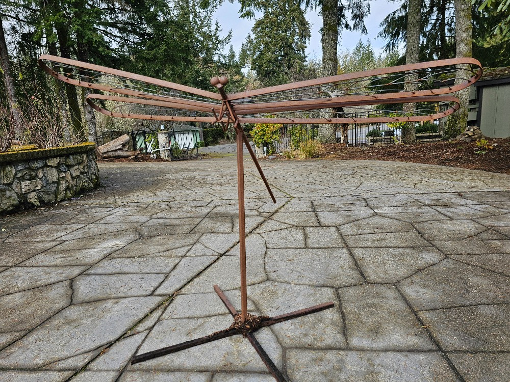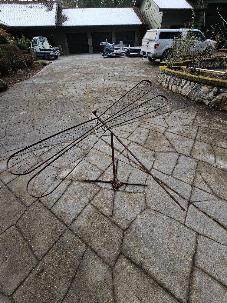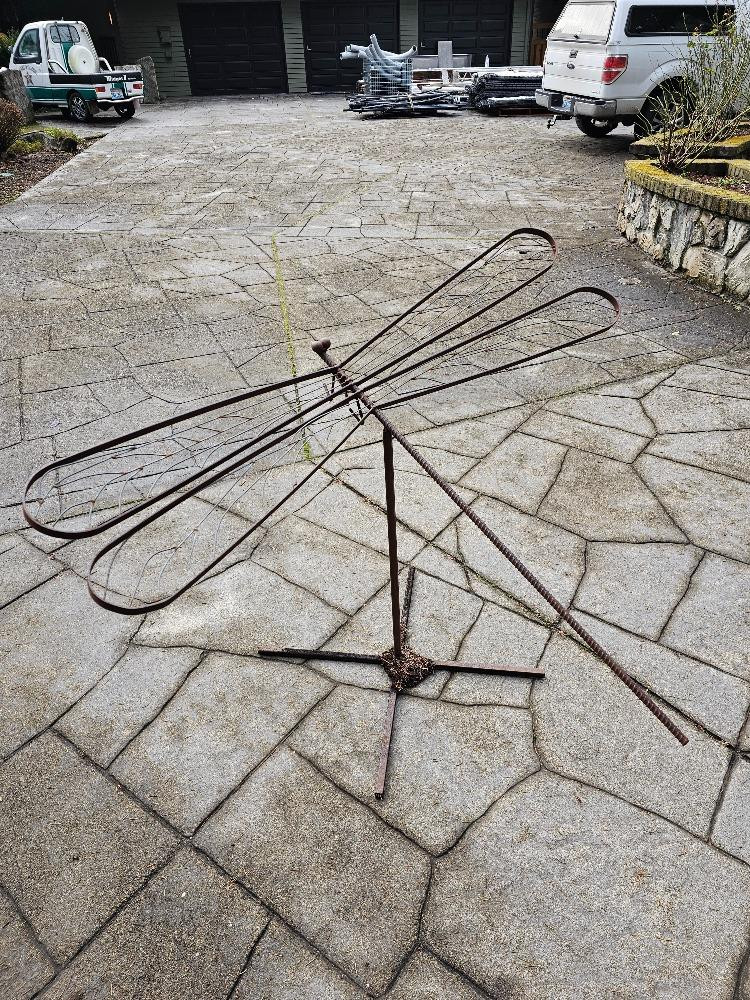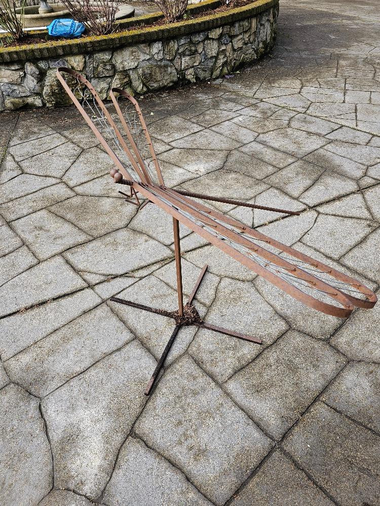Large Custom Metal Dragonfly Sculpture Made of welded metal bar with a body of rebar 36"T x 57"W x 45"L Comes apart, stand & Dragonfly sculpture Very unique piece of yard art!