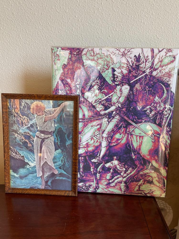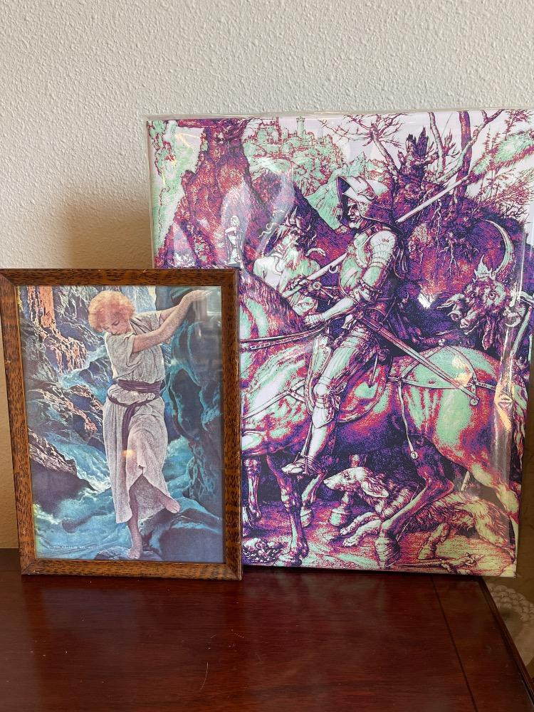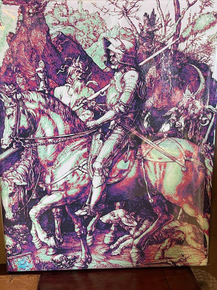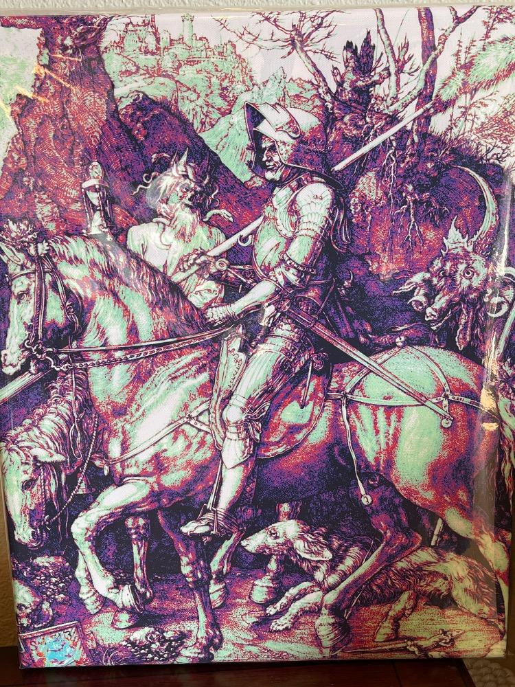 This is a print on canvas of the engraving "Knight, Death and the Devil" by Albrecht Dürer, created in 1513. Also: This is a print of the painting "The Canyon" by Maxfield Parrish, an American artist known for his distinctive and dreamy style.