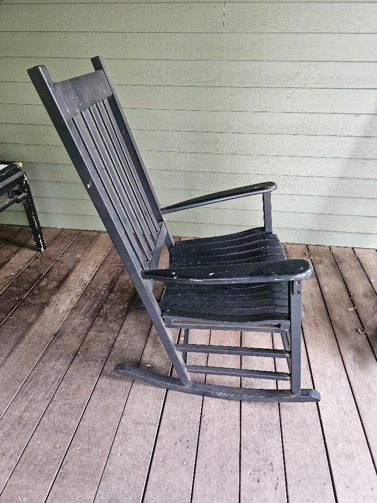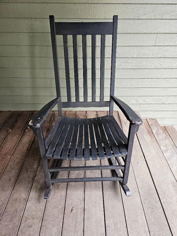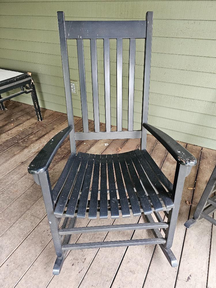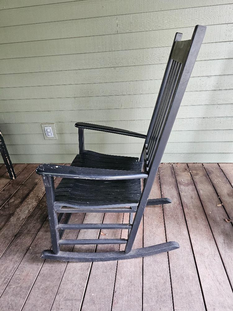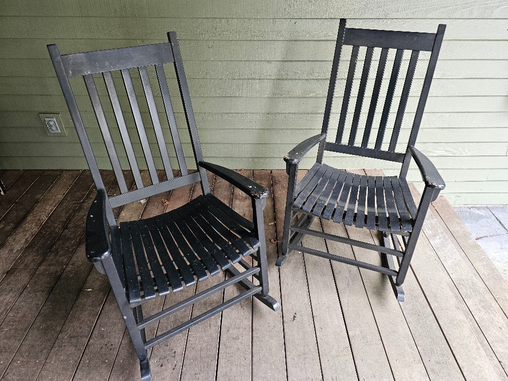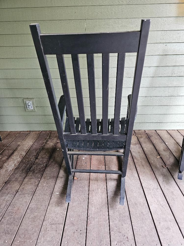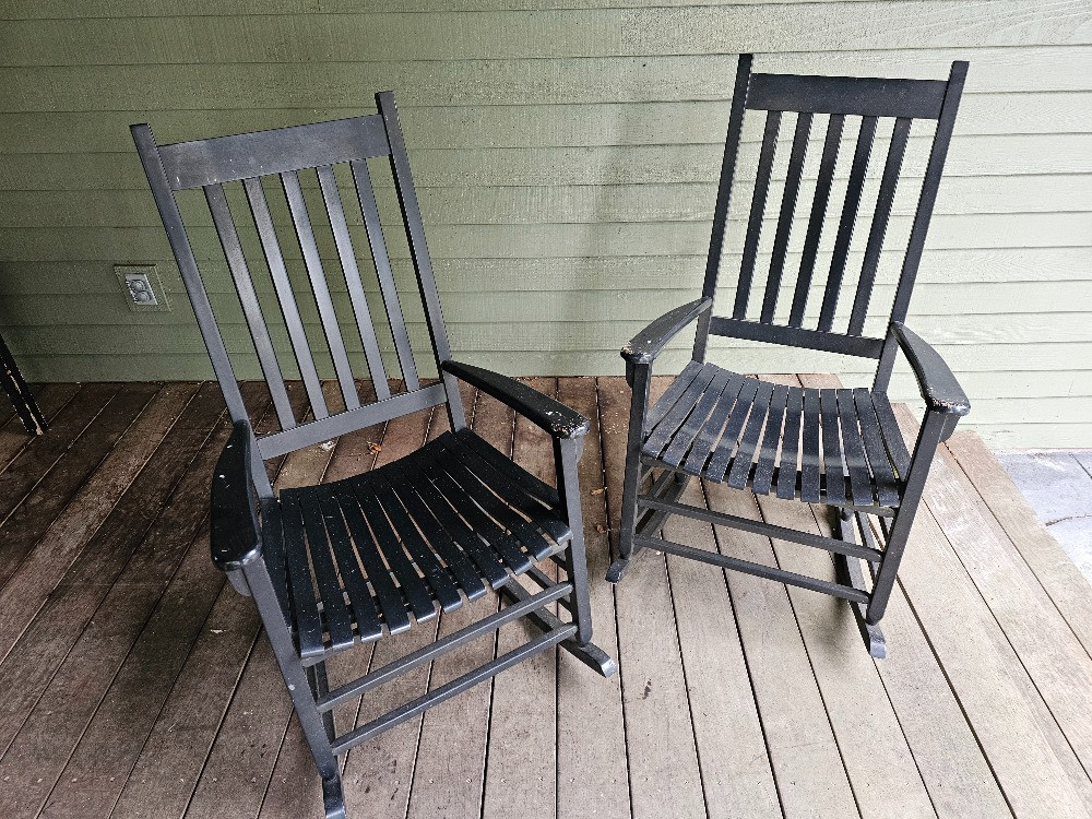 Pair Of Front Porch Rocking Chairs Very comfortable wooden rocking chairs Black in color Could use a little TLC on the front armrest where your hands go on both chairs (see pics) 44"T x 26"W x 30.5"D Perfect watching 5he world go by with your favorite drink. That's some good sittin' right there!