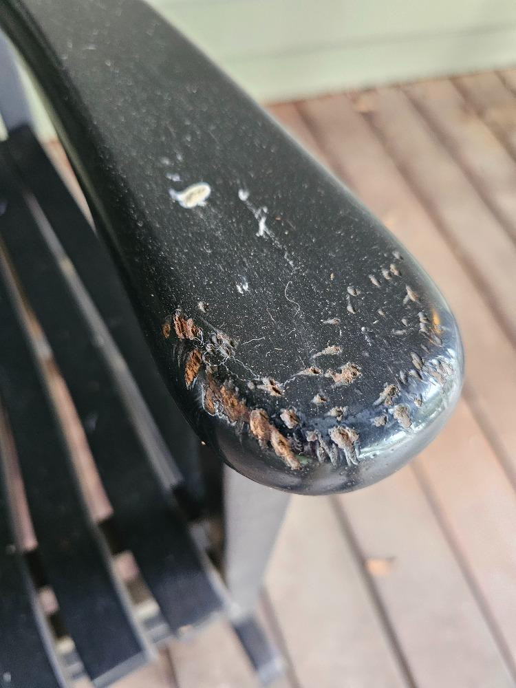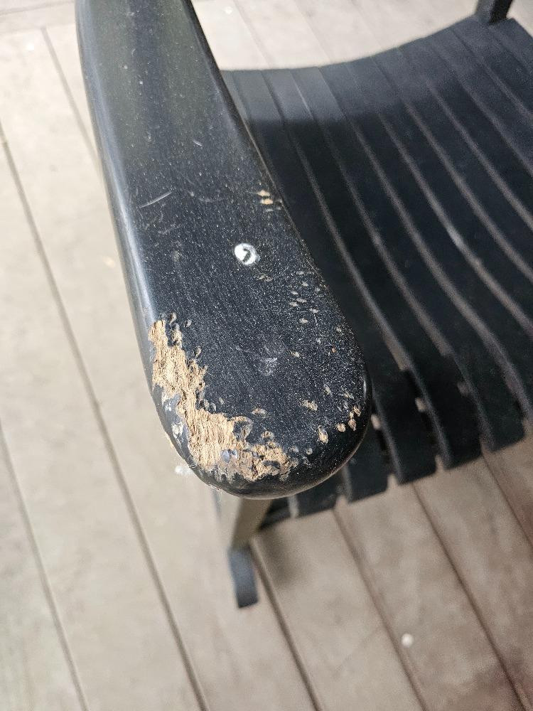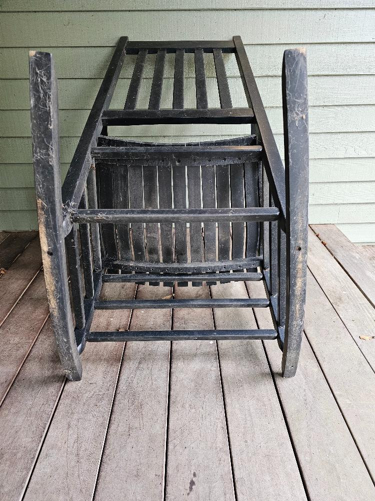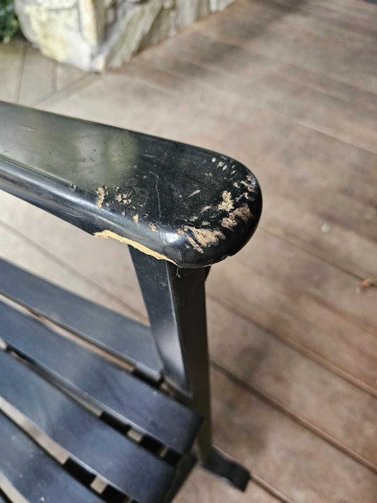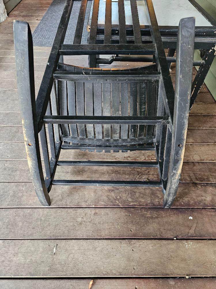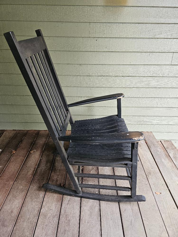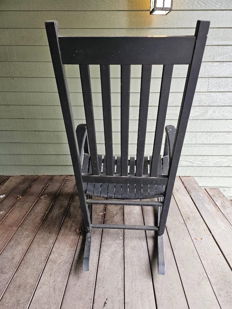 Pair Of Front Porch Rocking Chairs Very comfortable wooden rocking chairs Black in color Could use a little TLC on the front armrest where your hands go on both chairs (see pics) 44"T x 26"W x 30.5"D Perfect watching 5he world go by with your favorite drink. That's some good sittin' right there!