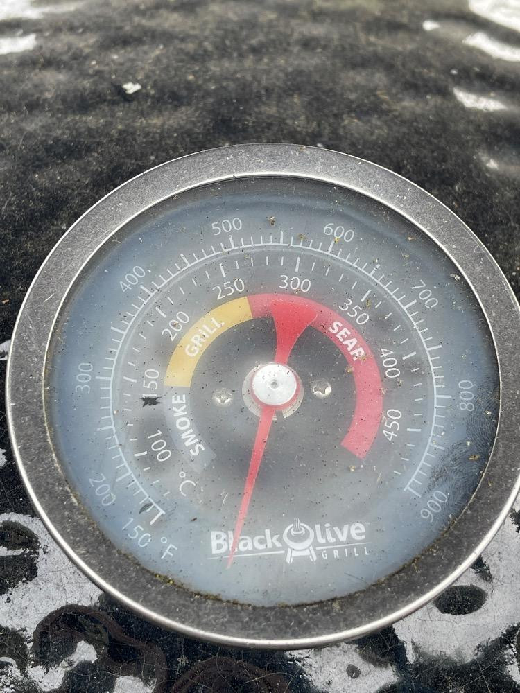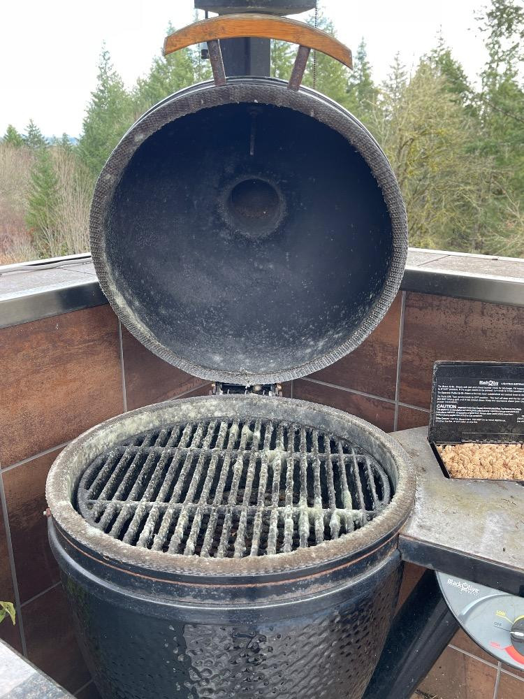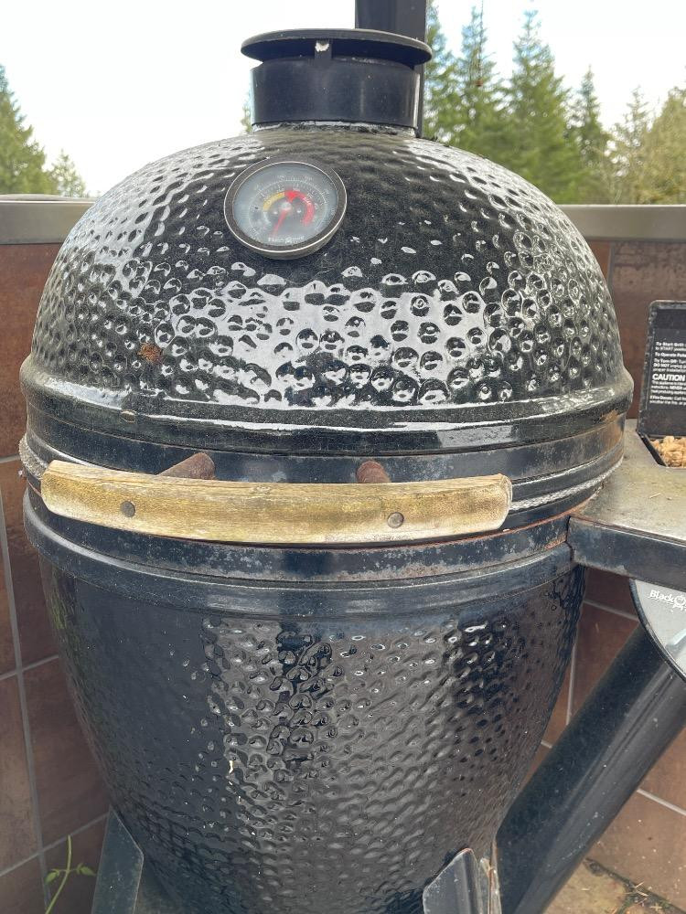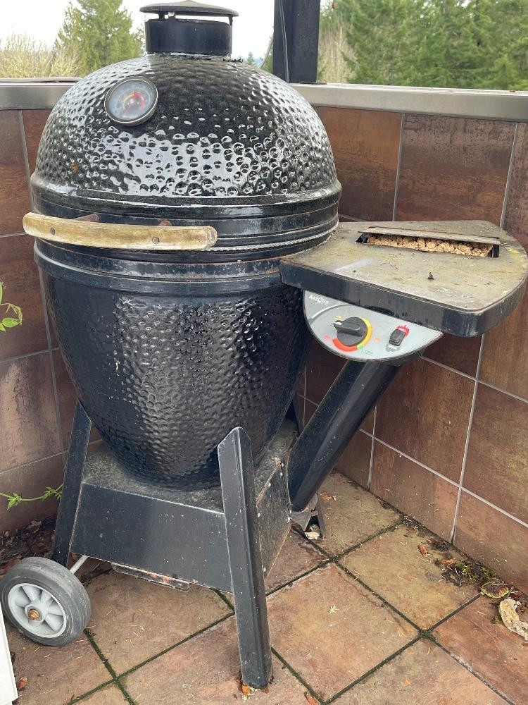 Black Olive Smoker/Grill. Like the big green egg but different. Needs a deep clean after sitting out over winter. Some rust. Powers on, not tested, plug-in power.
