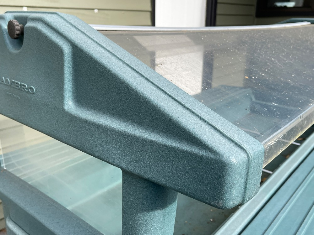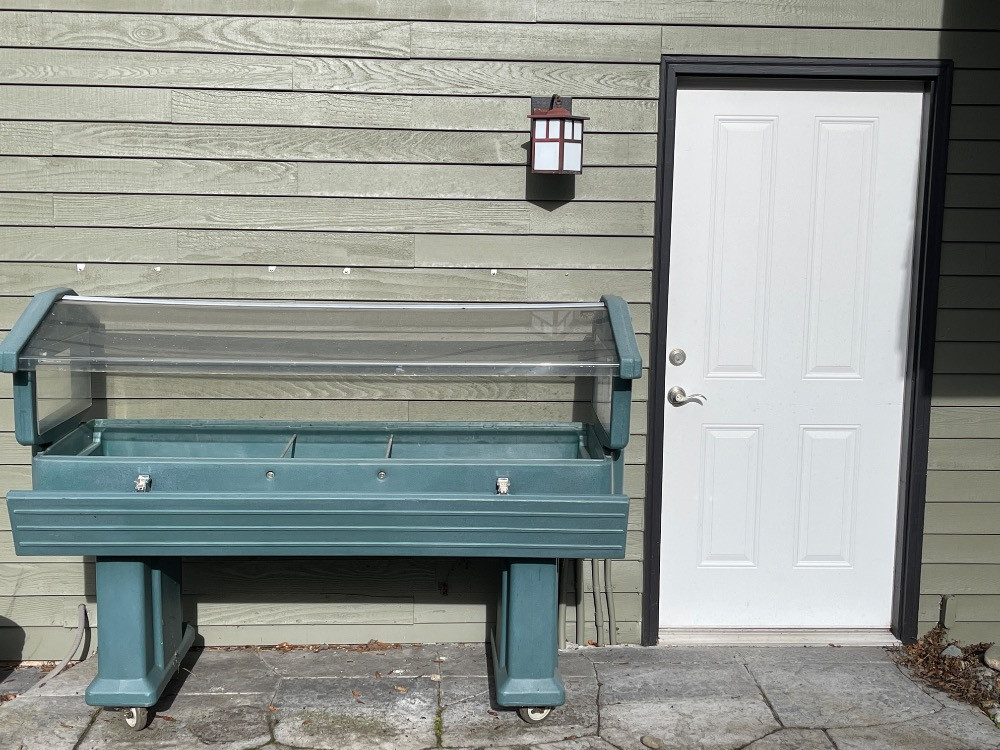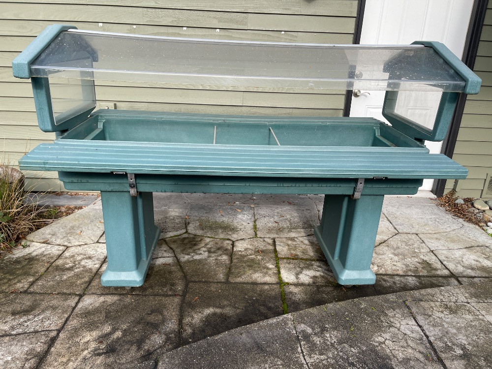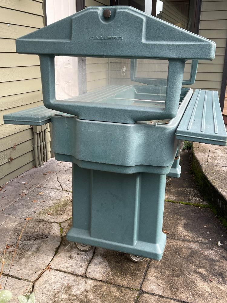 Restaurant Cambro Composite Salad Bar - Raised Garden Bed? Has a covered sneeze guard over the top and 2 pop up side shelves. Three tables down the bar measures 33 inches wide by 71 inches long by 53 inches tall. Tray table sides, when lifted are 8 inches wide. Moves on wheels and in good condition.