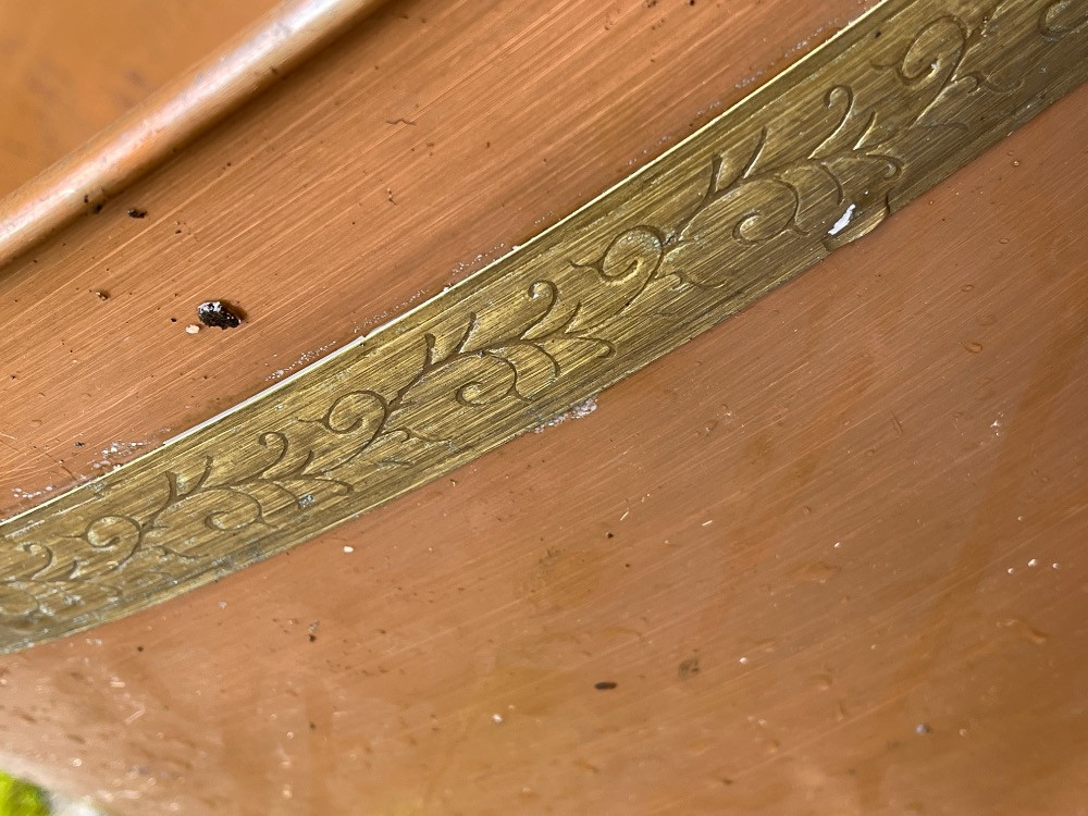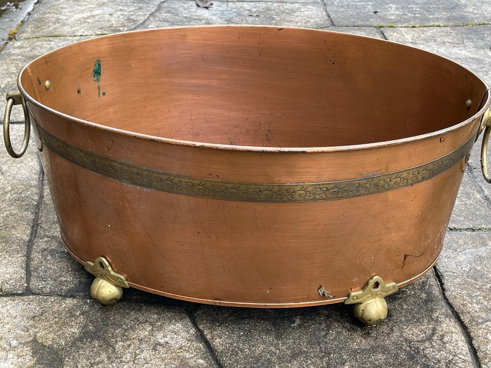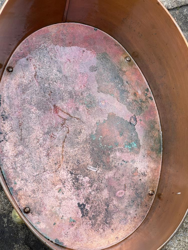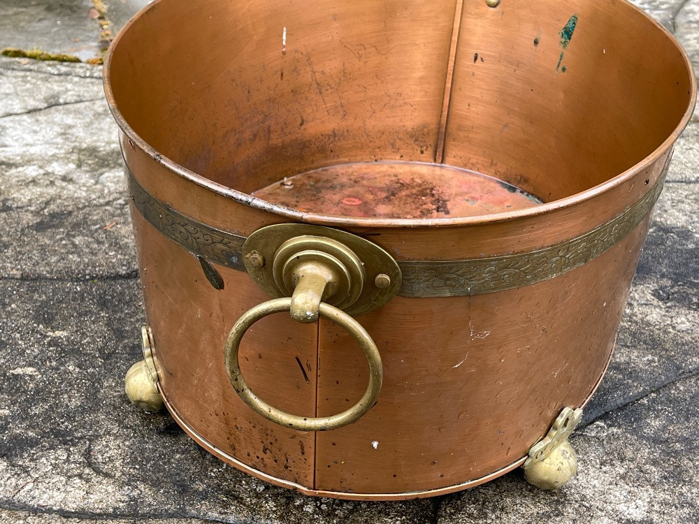 Copper Tub with Brass Handles and Feet. measures 24“ x 18“ x 11“ tall.